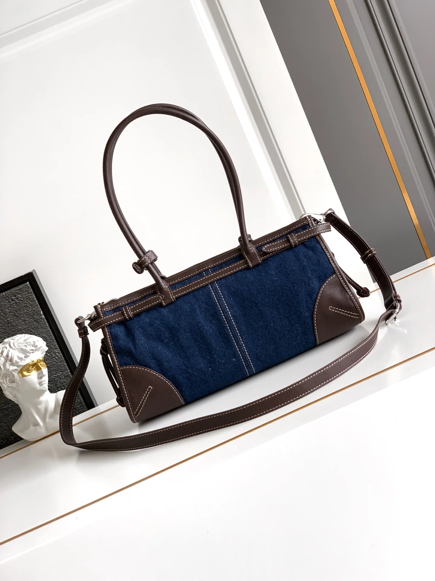 This Bonnie denim handbag features a refreshed iconic design, enhanced with practical details and unexpected interactions between materials. The new casual versatile style is made of denim fabric with leather trims, and includes a detachable and adjustable shoulder strap, combining fashion and functionality. Model: 1BA426