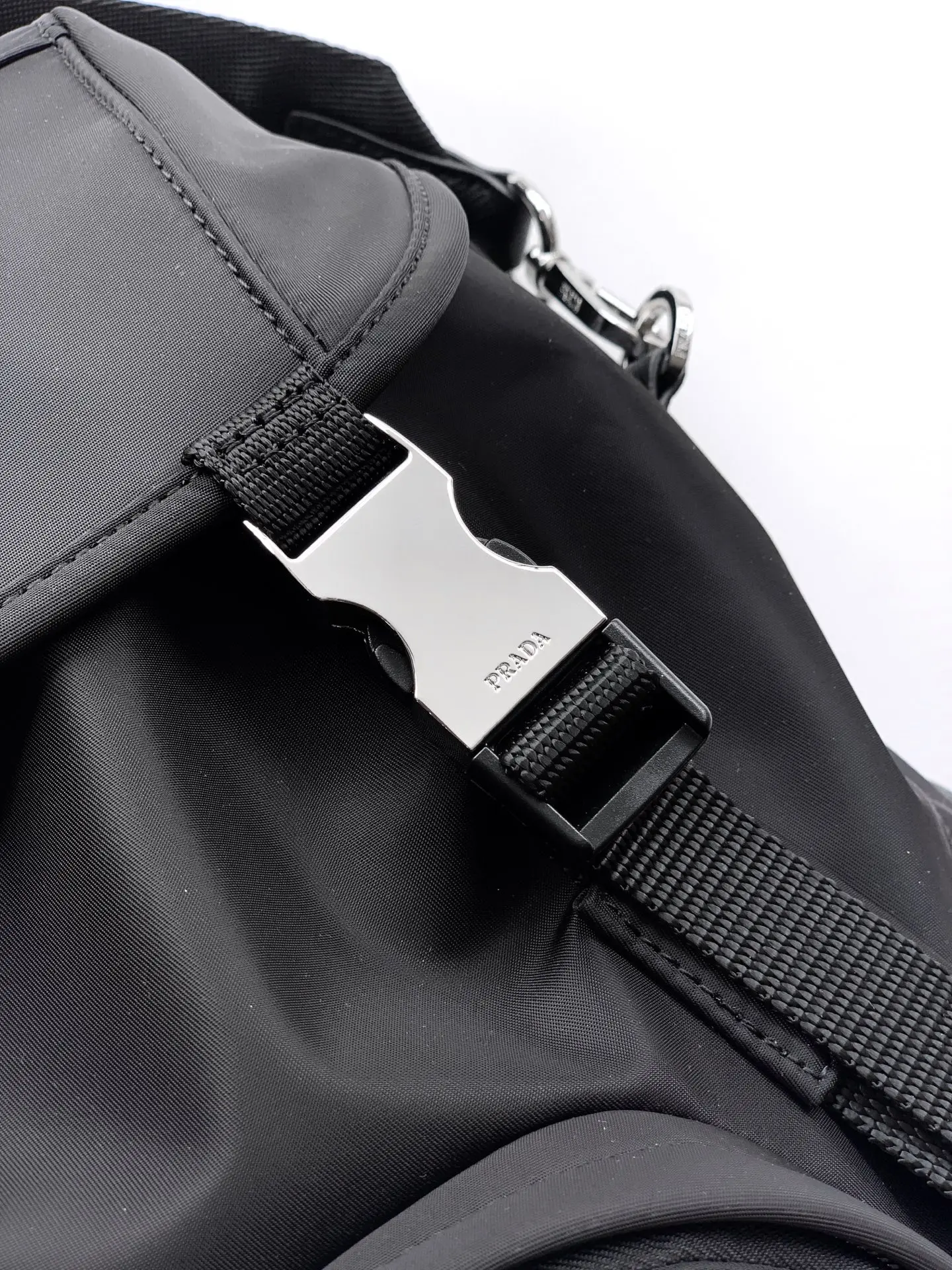 This modern and practical backpack is made of Re-Nylon, featuring a spacious and lightweight silhouette with technical details. The design combines an outdoor spirit with a multifunctional urban style, including detachable short shoulder straps, a flap, and zippered side pockets with metal hardware. It offers ample storage space and is a timeless bestseller suitable for both men and women. Get yours now!