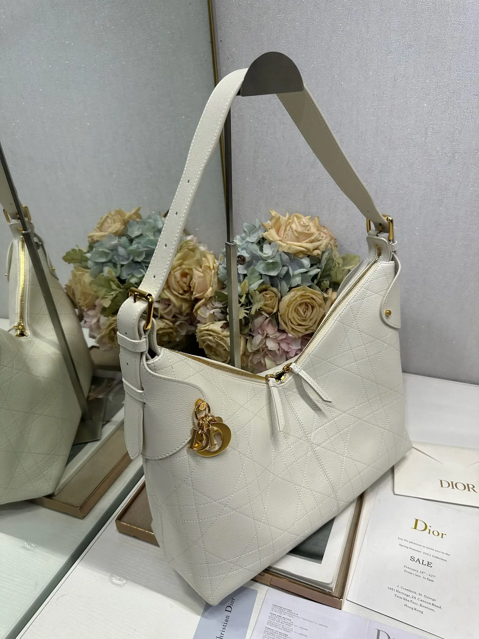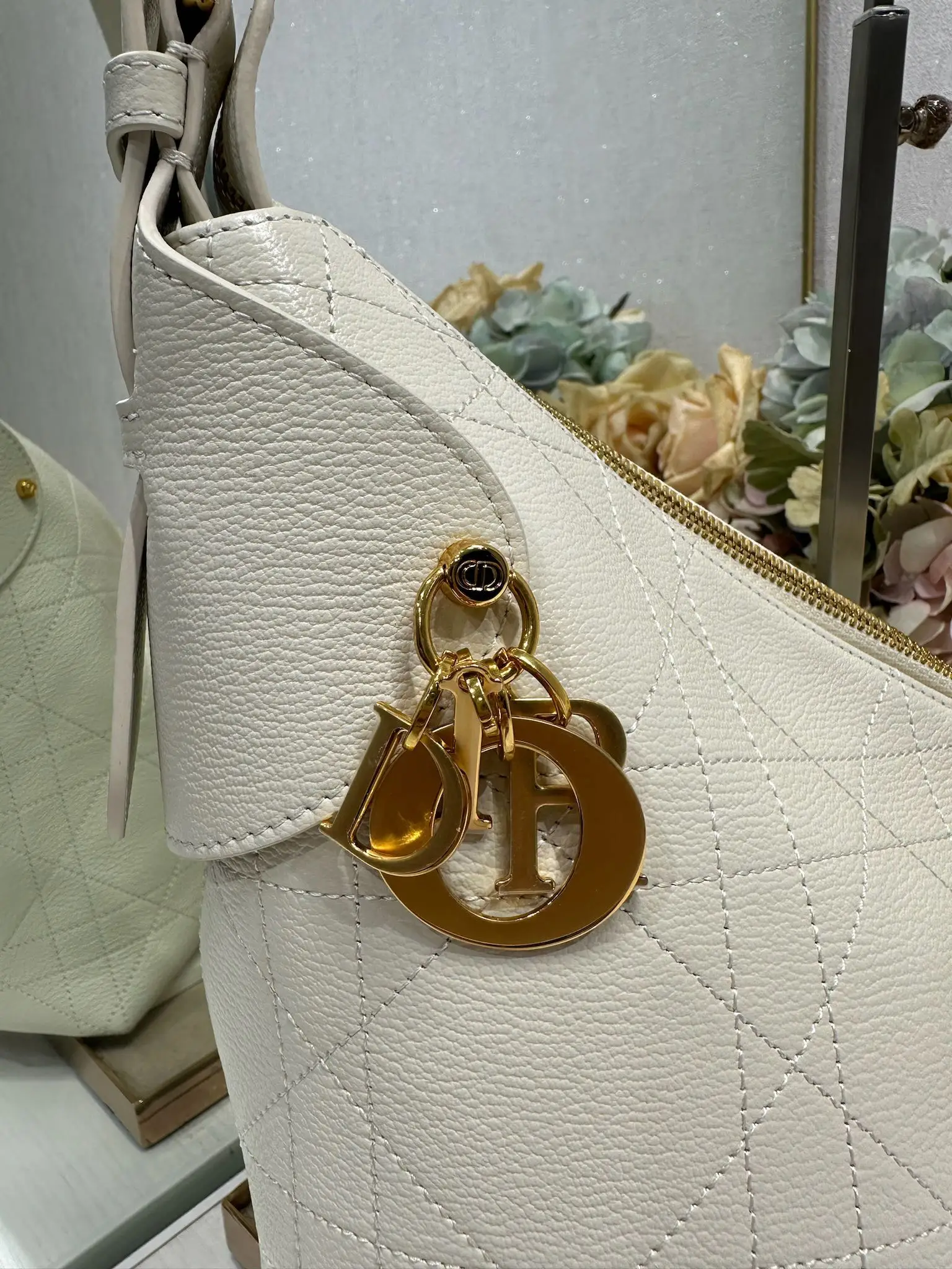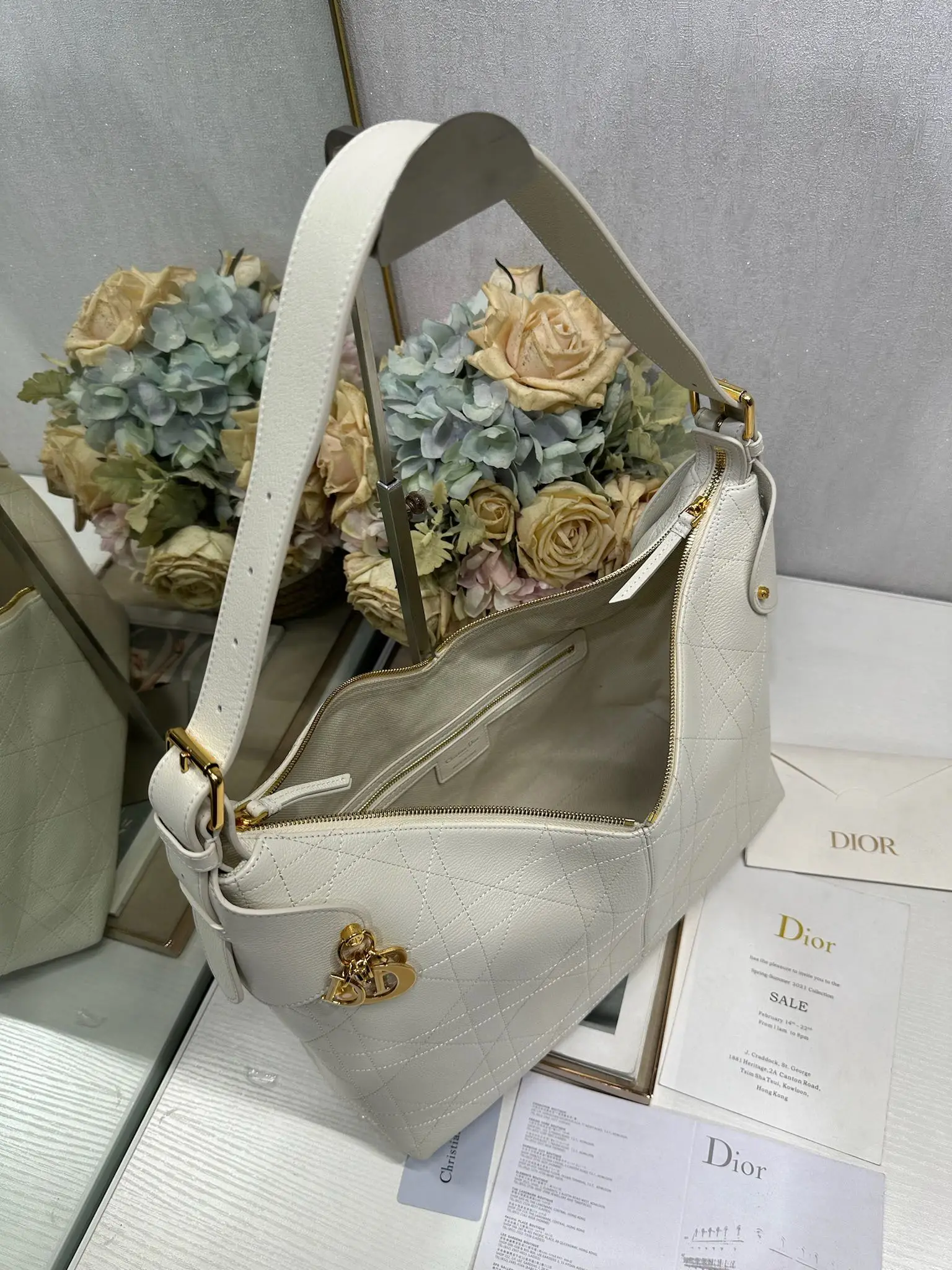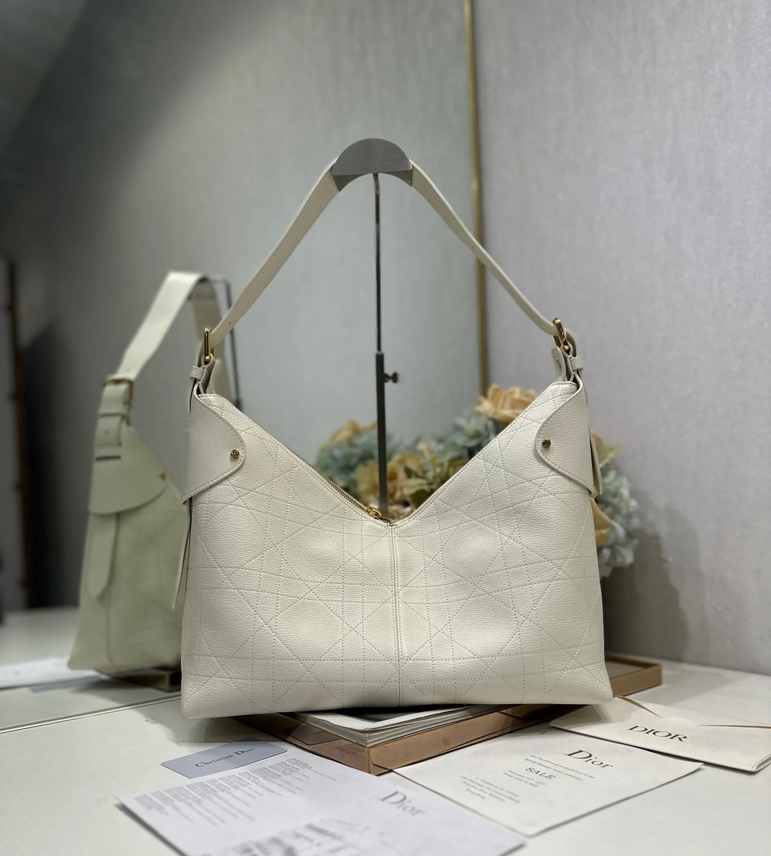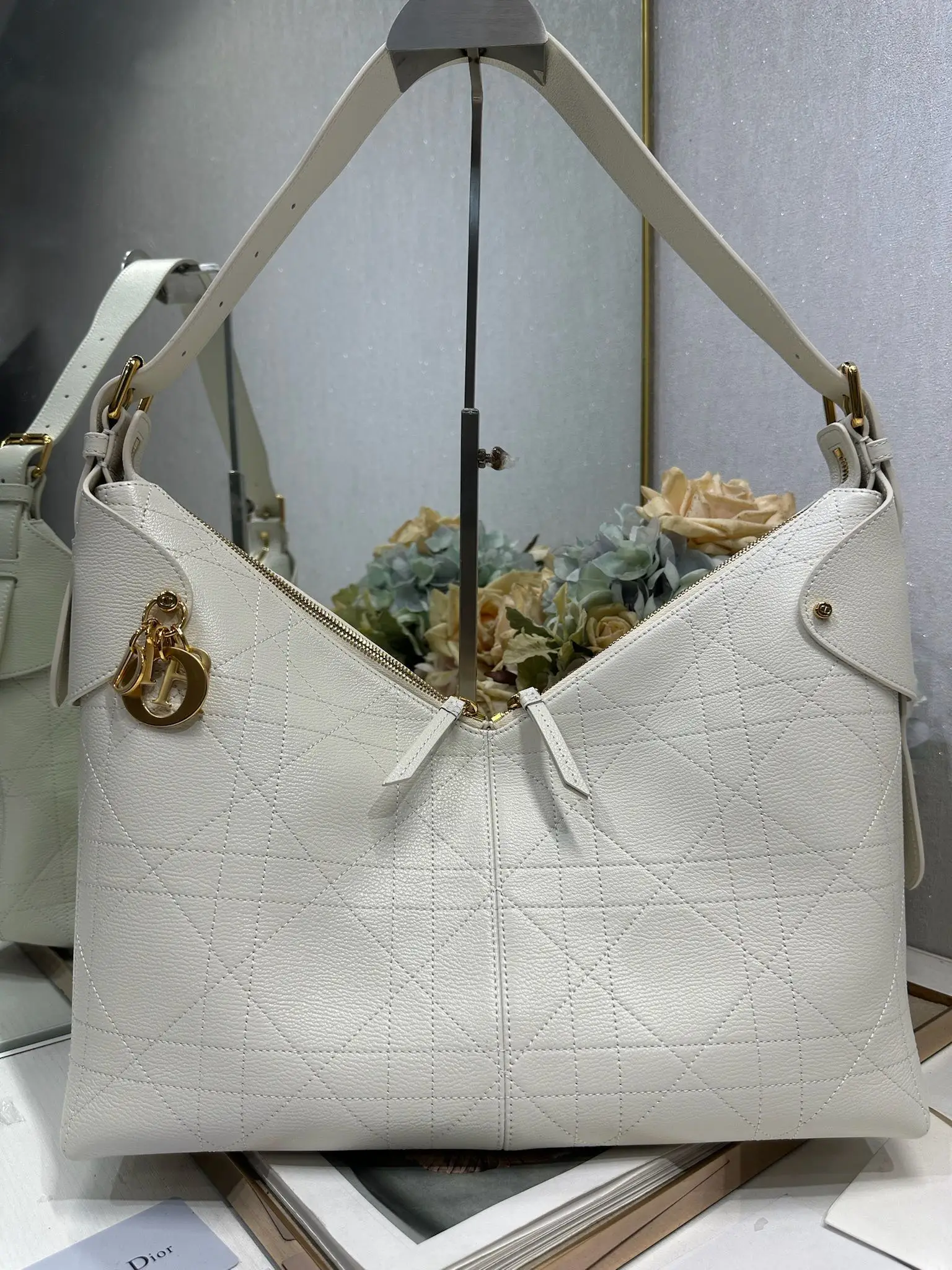 This Dior Voyage handbag is a new addition to the Spring/Summer 2026 ready-to-wear collection, featuring soft lines and elegant details that create a harmonious dumpling bag silhouette. Crafted from white lambskin leather, it is adorned with flat oversized woven pattern stitching, offering a fresh interpretation of Dior s classic motif. Model: 2844