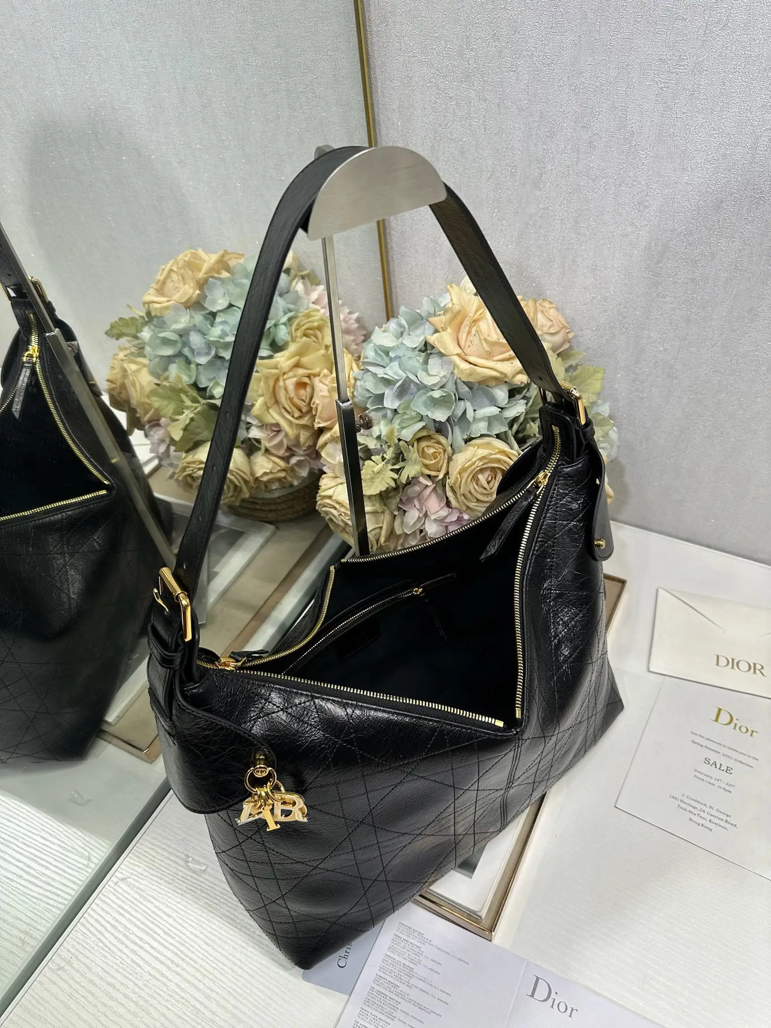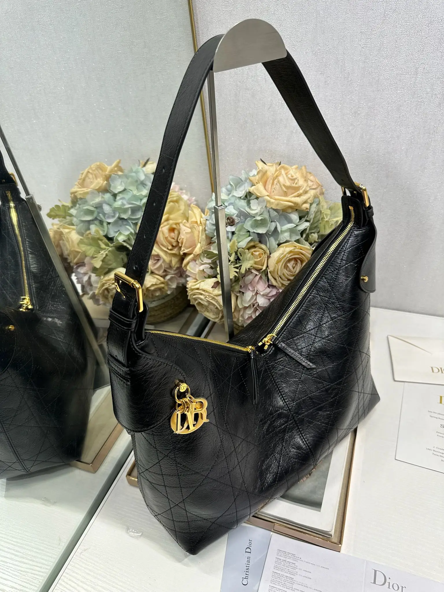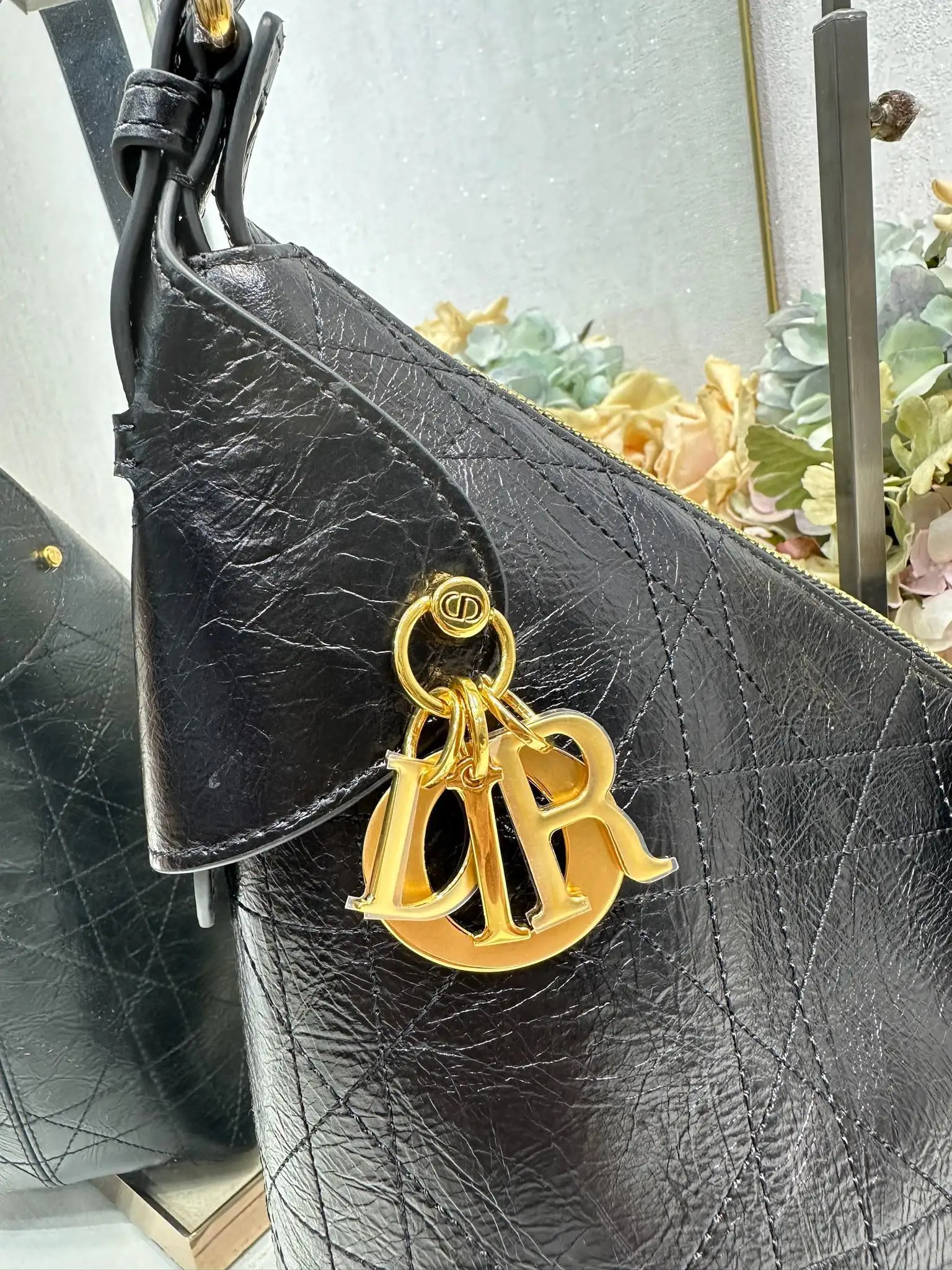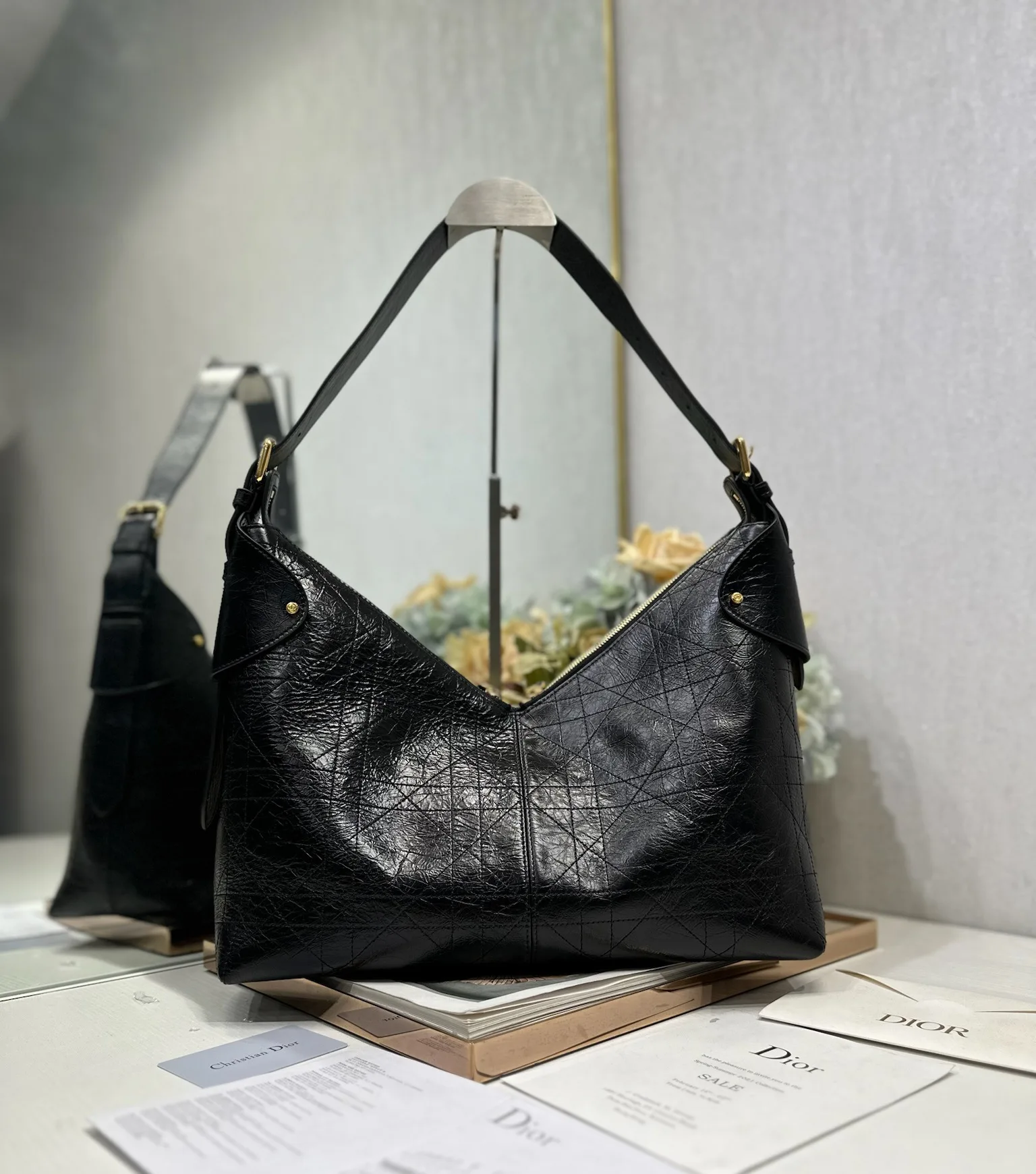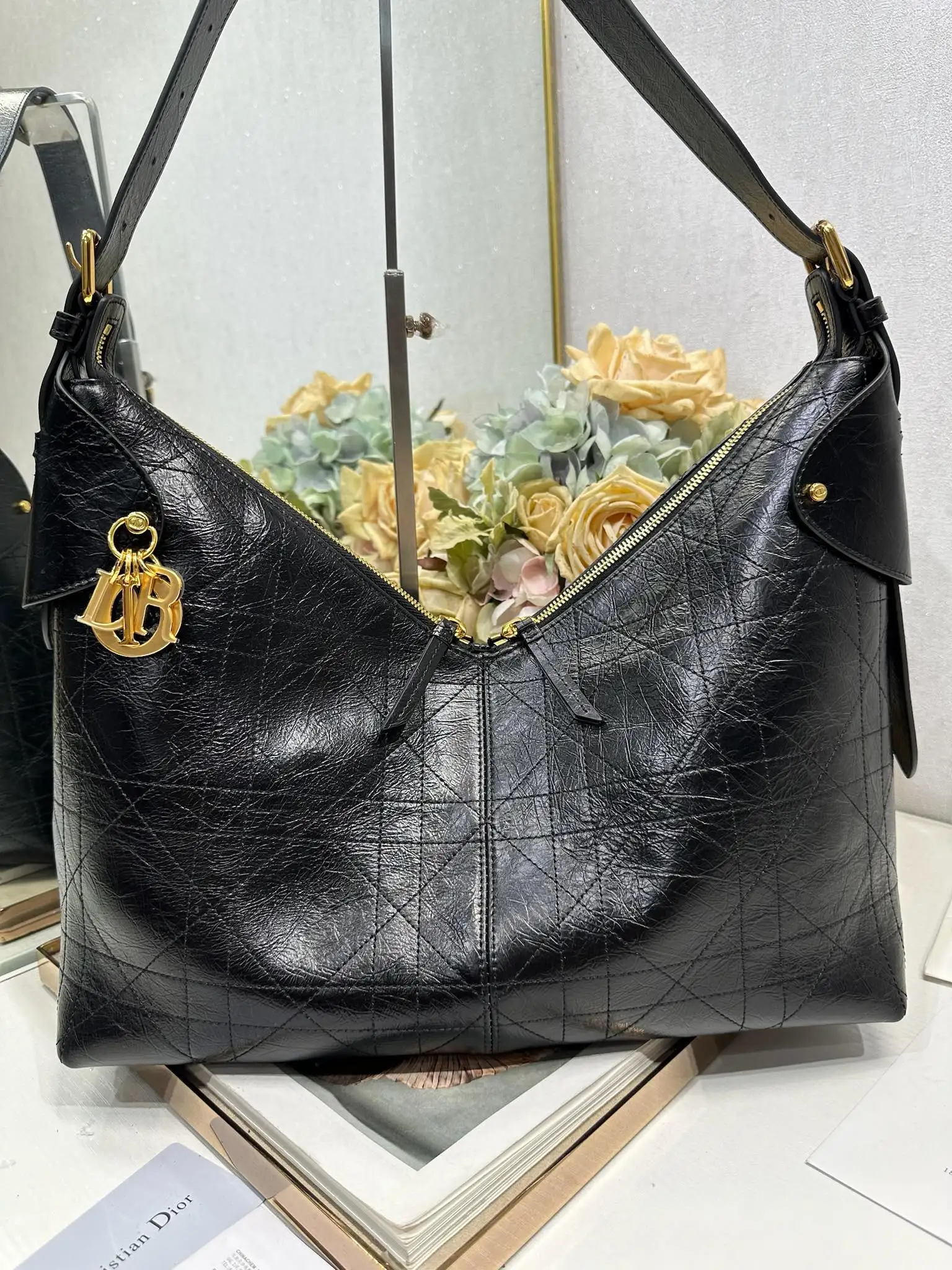This Dior Voyage handbag is a new addition to the Spring/Summer 2026 ready-to-wear collection, blending soft lines with elegant details to create a harmonious dumpling bag silhouette. Crafted from carefully selected black wrinkled calfskin leather, it features oversized flat wicker pattern stitching, offering a fresh interpretation of Dior s classic motif. Model: 2844