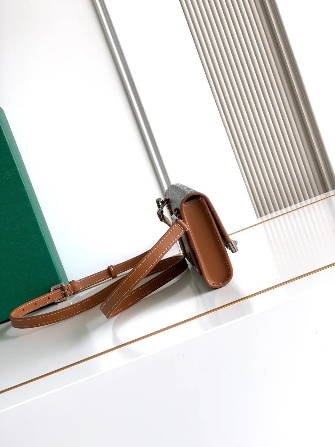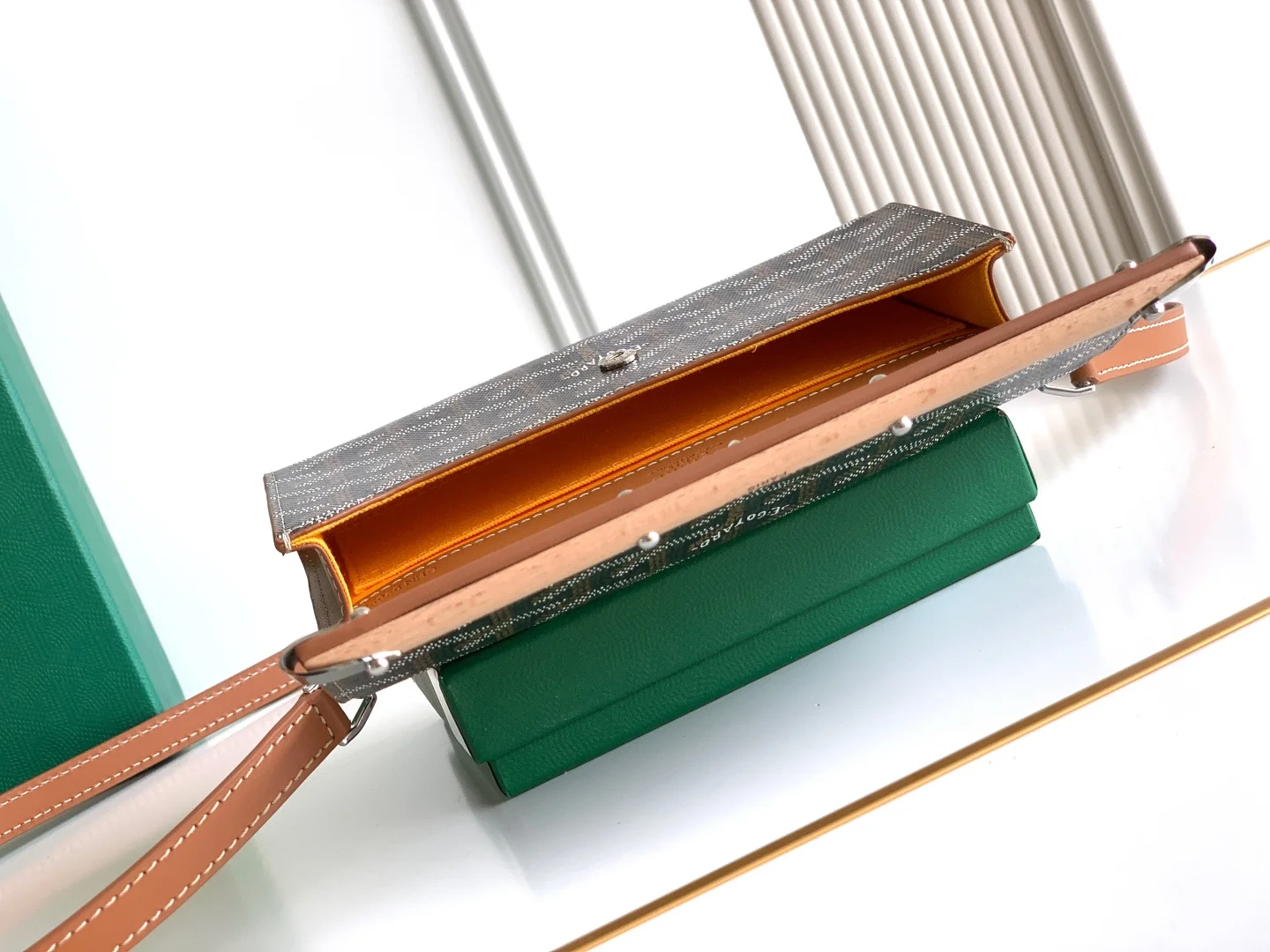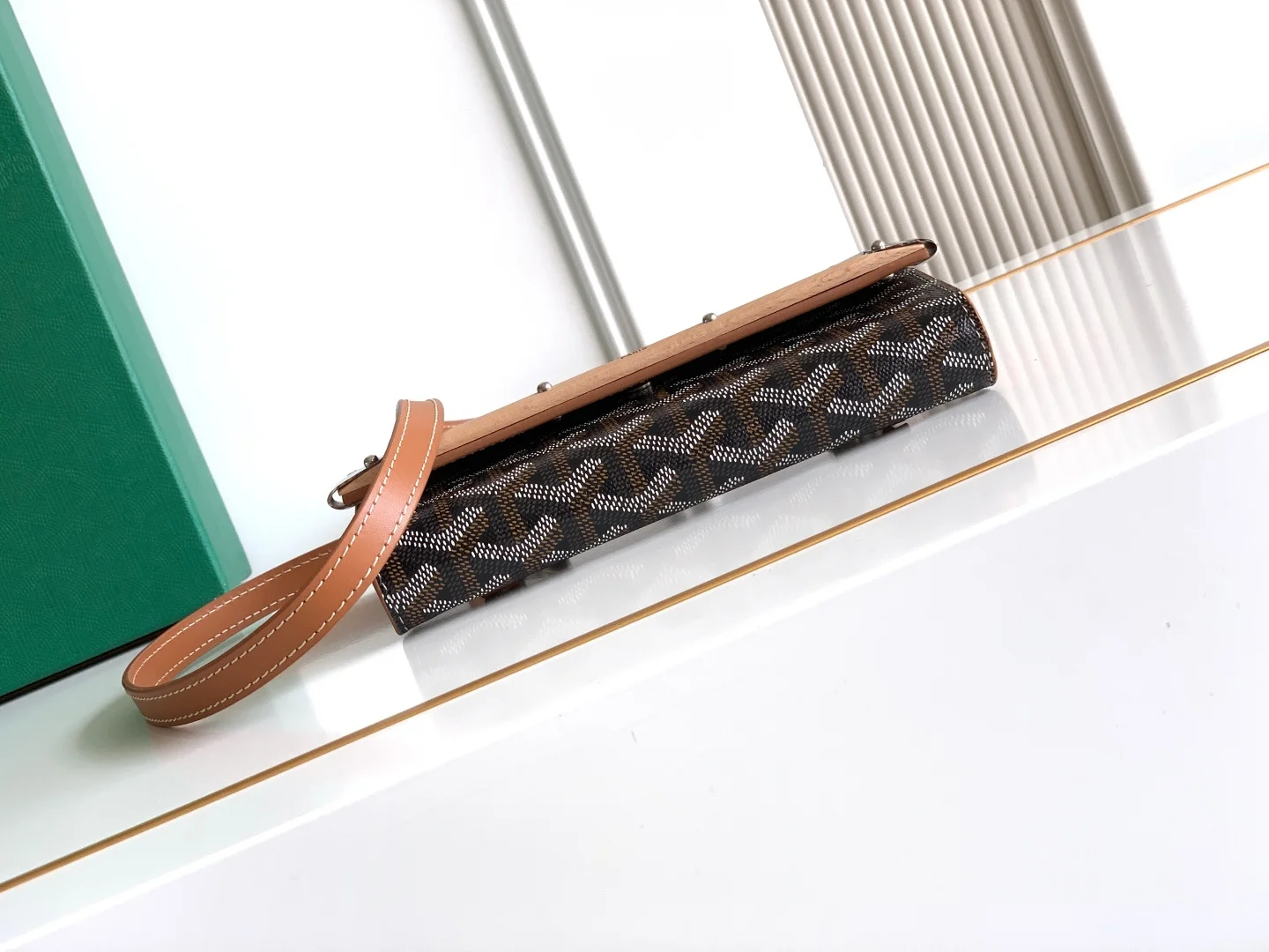 The Goyard Monte-Carlo mini bag reinterprets some of the iconic features of Goyard s signature trunks, such as the wooden slats, corner protectors, and trunk rivets. It is designed as a clutch that can be worn on the belt through two leather loops, and it can also be paired with a small shoulder strap for crossbody wear. Model 6112