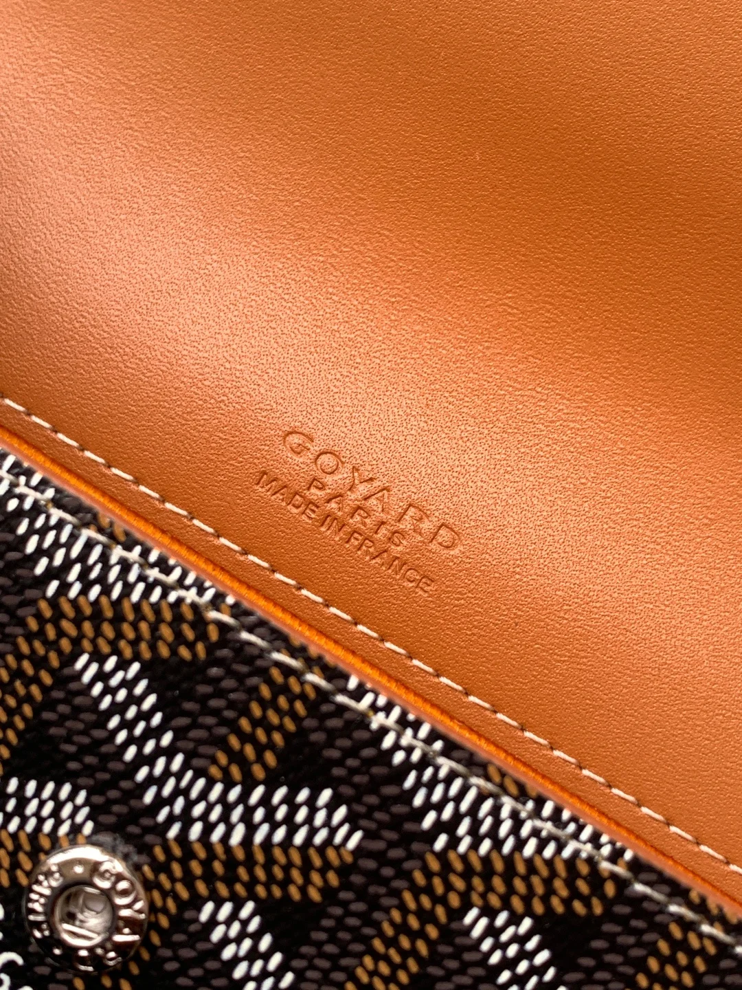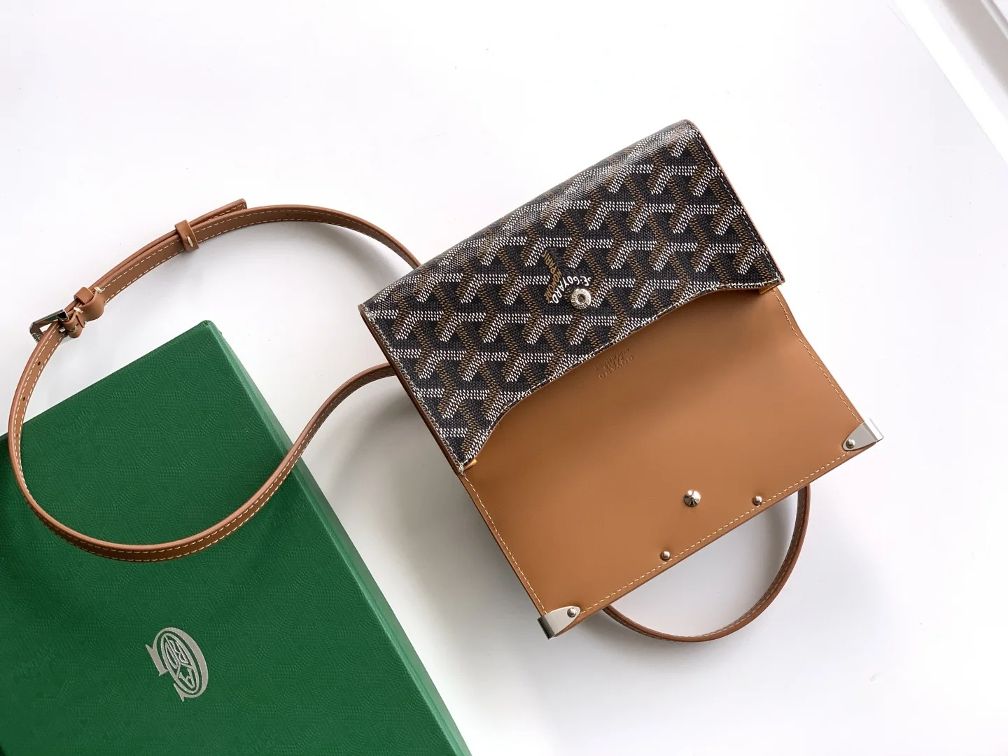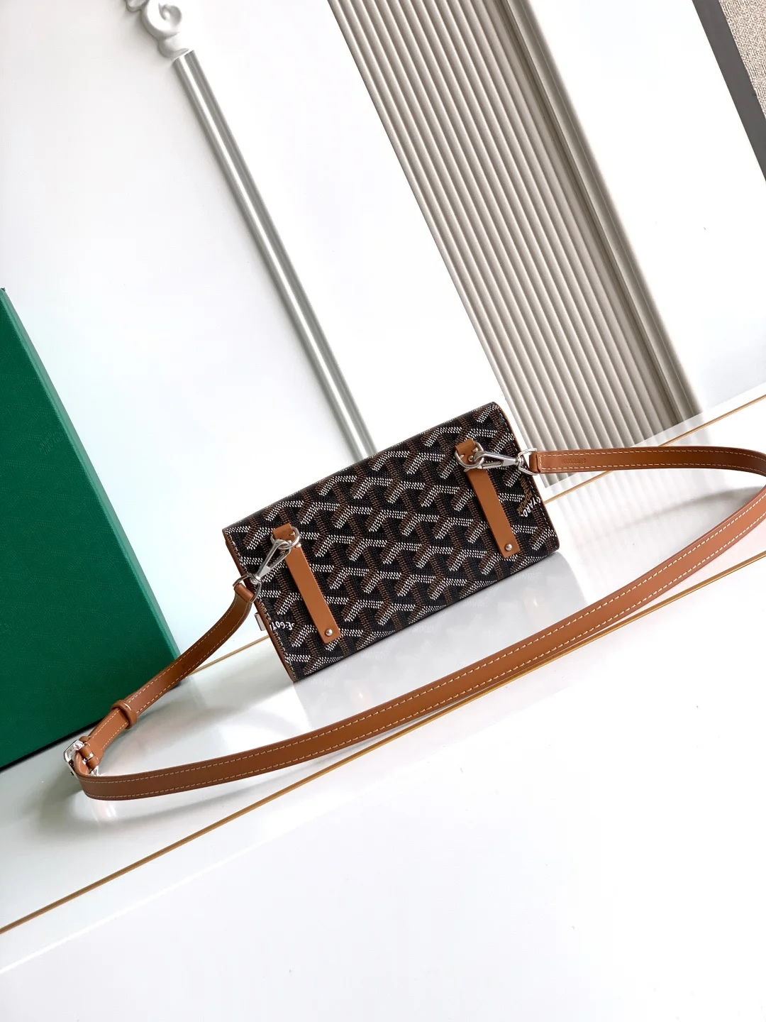The Goyard Monte-Carlo mini bag reinterprets some of the iconic features of Goyard s signature trunks, such as the wooden slats, corner protectors, and trunk rivets. It is designed as a clutch that can be worn on the belt through two leather loops, and it can also be paired with a small shoulder strap for crossbody wear. Model 6112