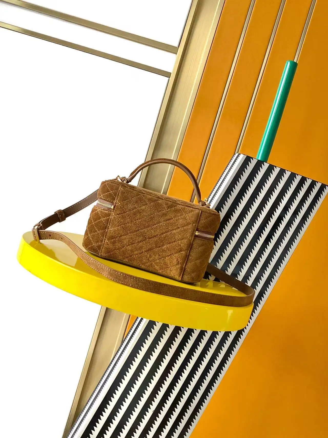 The latest hot item, the 𝙈𝙞𝙣𝙞 lambskin leather shoulder strap clutch makeup bag has arrived! This wrap-around zipper clutch is adorned with 𝙇𝙀 𝘾𝘼𝙎𝙎𝘼𝙉𝘿𝙍𝙀 and diamond quilted stitching, featuring a lambskin lining, antique brass hardware, a zipper closure, and one card slot. This multifunctional piece comes with a leather top handle and an adjustable, detachable shoulder strap, allowing for shoulder or crossbody wear!
