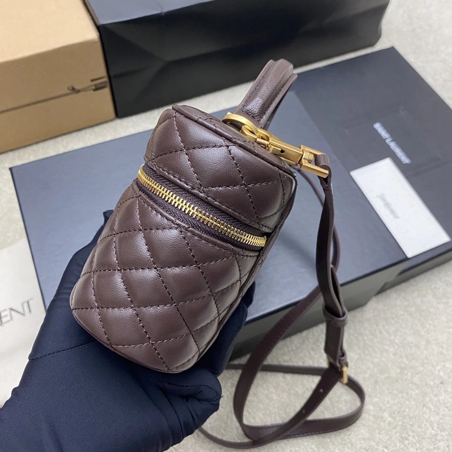 The latest hot item, the 𝙈𝙞𝙣𝙞 lambskin leather clutch and cosmetic bag in coffee lambskin/gold, has arrived! This wrap-around zip clutch features 𝙇𝙀 𝘾𝘼𝙎𝙎𝘼𝙉𝘿𝙍𝙀 and diamond quilted stitching, lambskin lining, antique brass hardware, a zip closure with one card slot, and this multifunctional piece comes with a leather top handle and an adjustable, detachable shoulder strap, allowing for shoulder or crossbody wear!