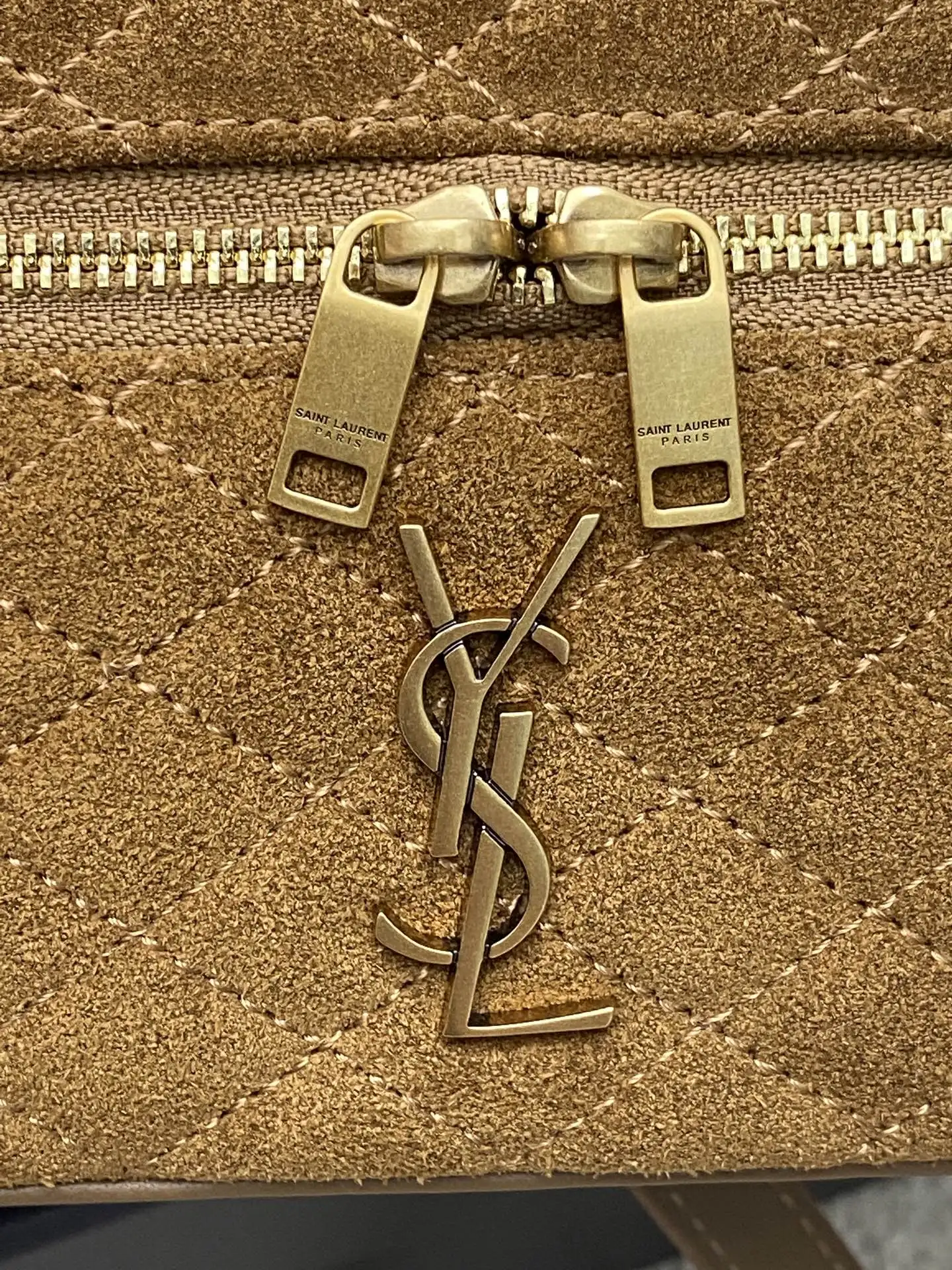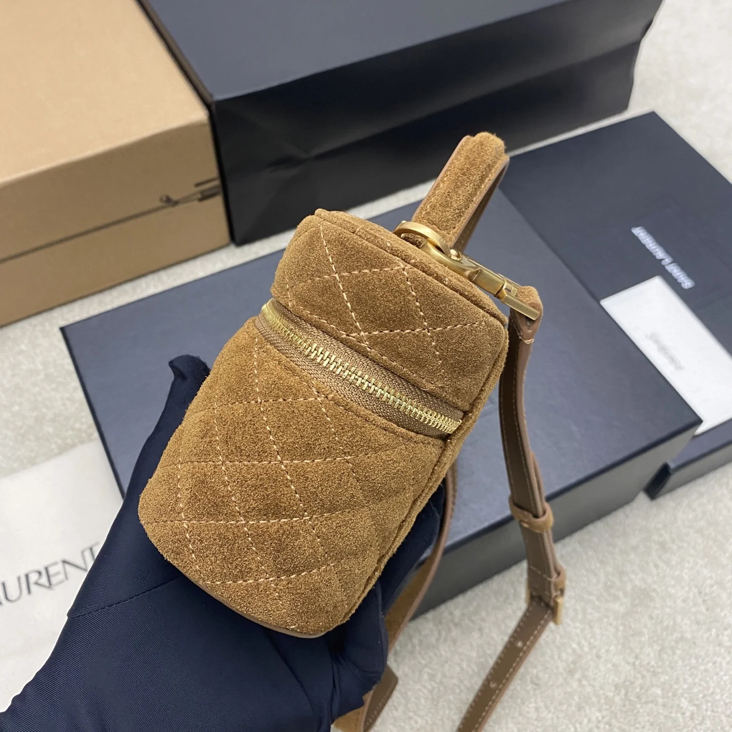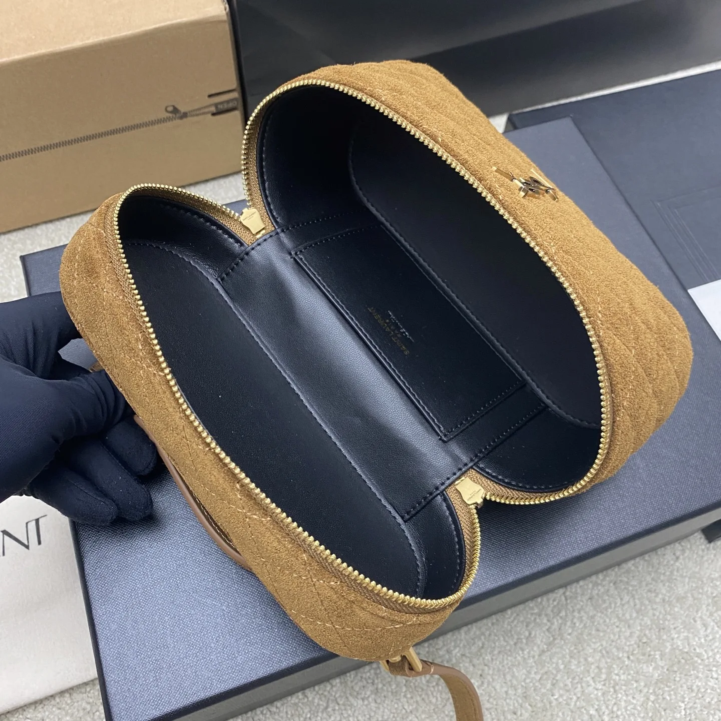P caramel suede / gold YSL Gaby Vanity makeup box bag, coffee suede with diamond quilted stitching, metal YSL logo is highly recognizable! Zipper closure, can be carried by hand or worn crossbody, adjustable and detachable shoulder strap, easy to handle for daily outings and casual occasions. Retro elegant style, adds extra points for autumn and winter outfits, the capacity is just right for holding a phone, cosmetics, and other small items, practical and fashionable, it is a classic popular item from YSL!