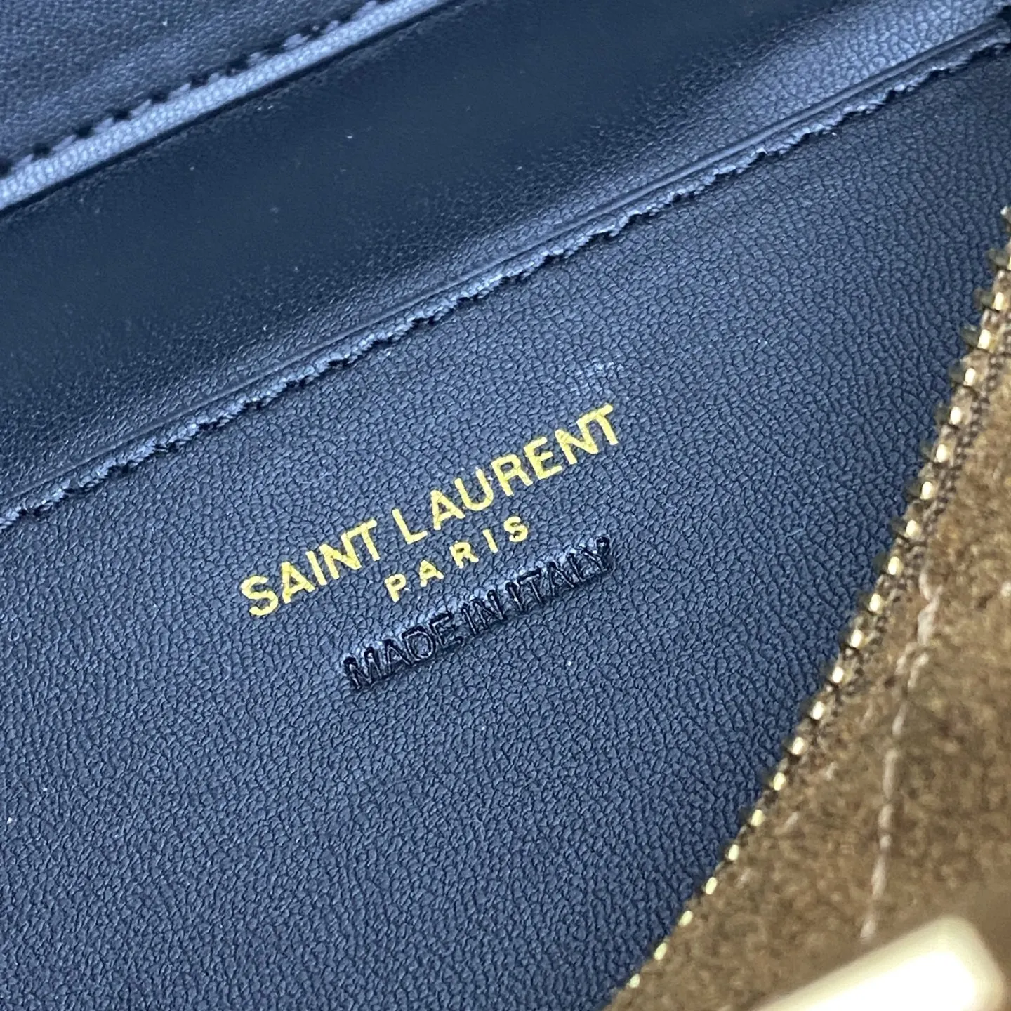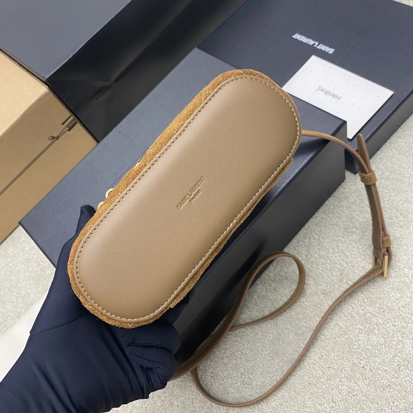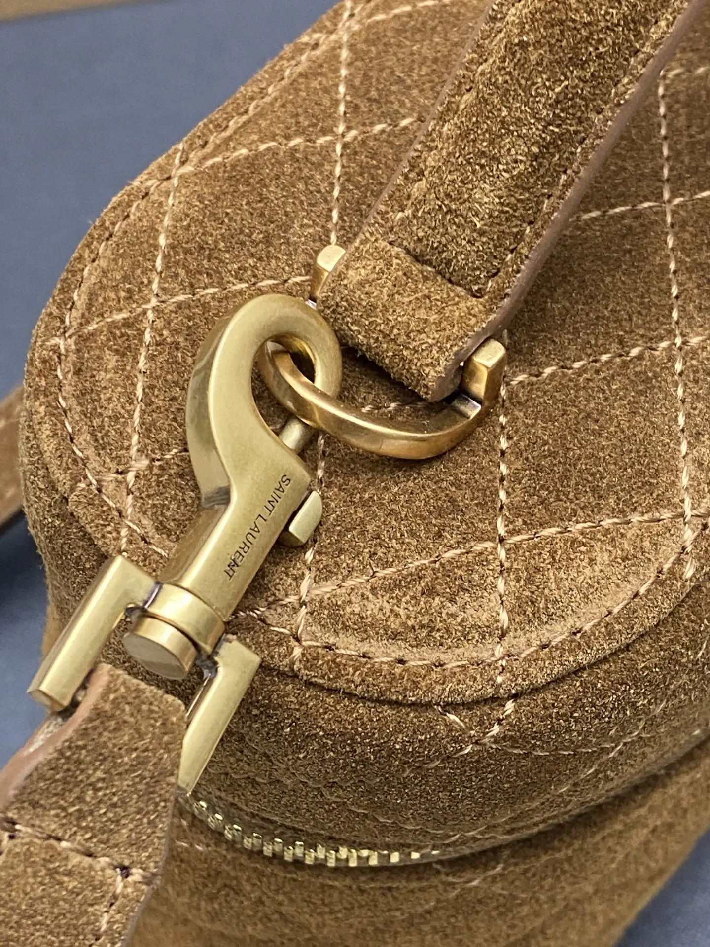 P caramel suede / gold YSL Gaby Vanity makeup box bag, coffee suede with diamond quilted stitching, metal YSL logo is highly recognizable! Zipper closure, can be carried by hand or worn crossbody, adjustable and detachable shoulder strap, easy to handle for daily outings and casual occasions. Retro elegant style, adds extra points for autumn and winter outfits, the capacity is just right for holding a phone, cosmetics, and other small items, practical and fashionable, it is a classic popular item from YSL!