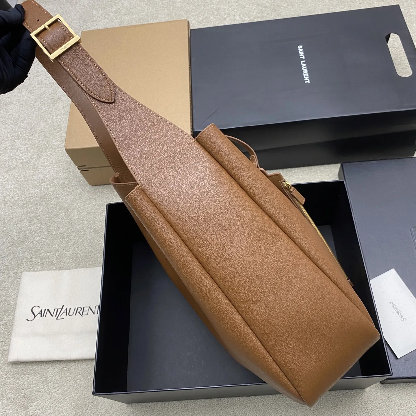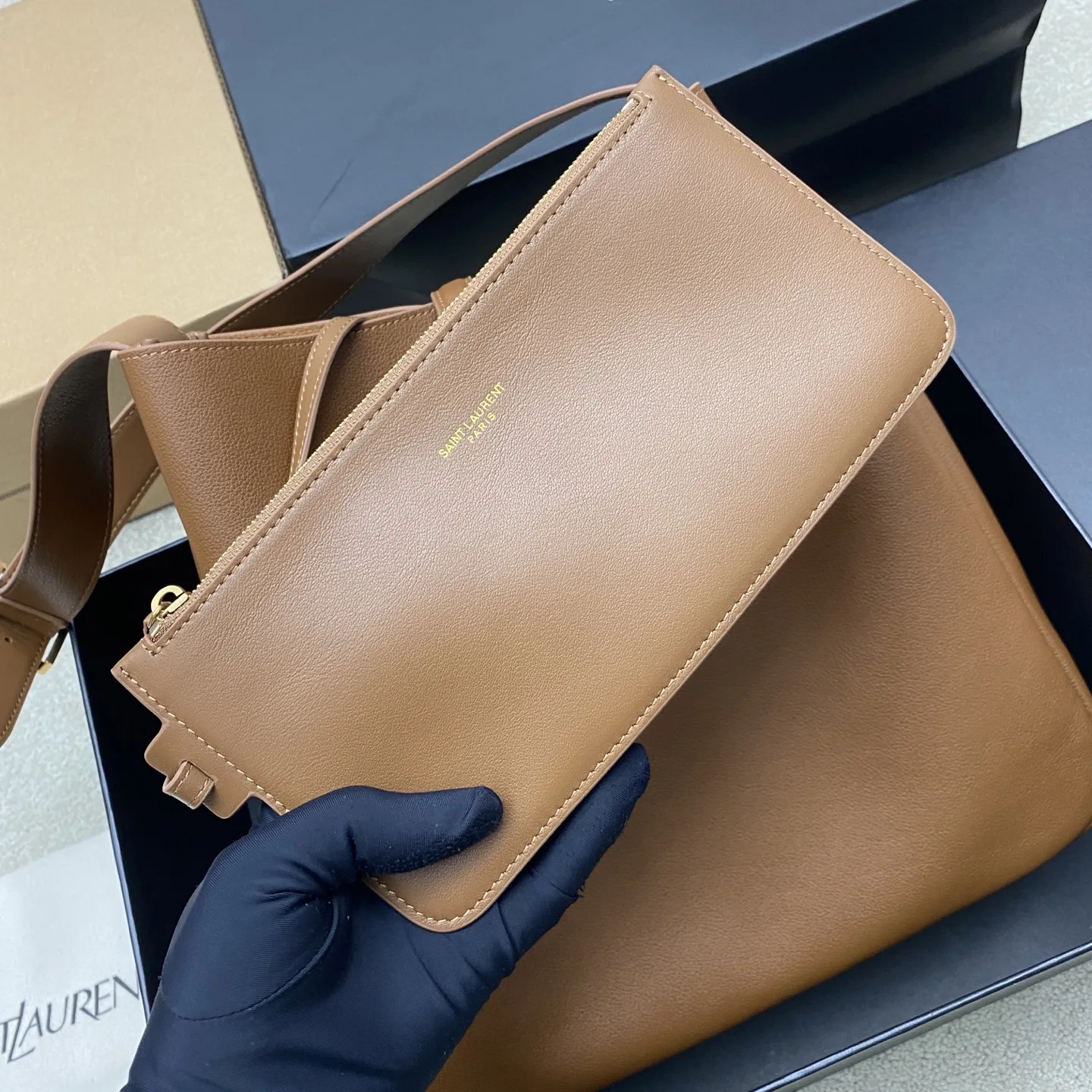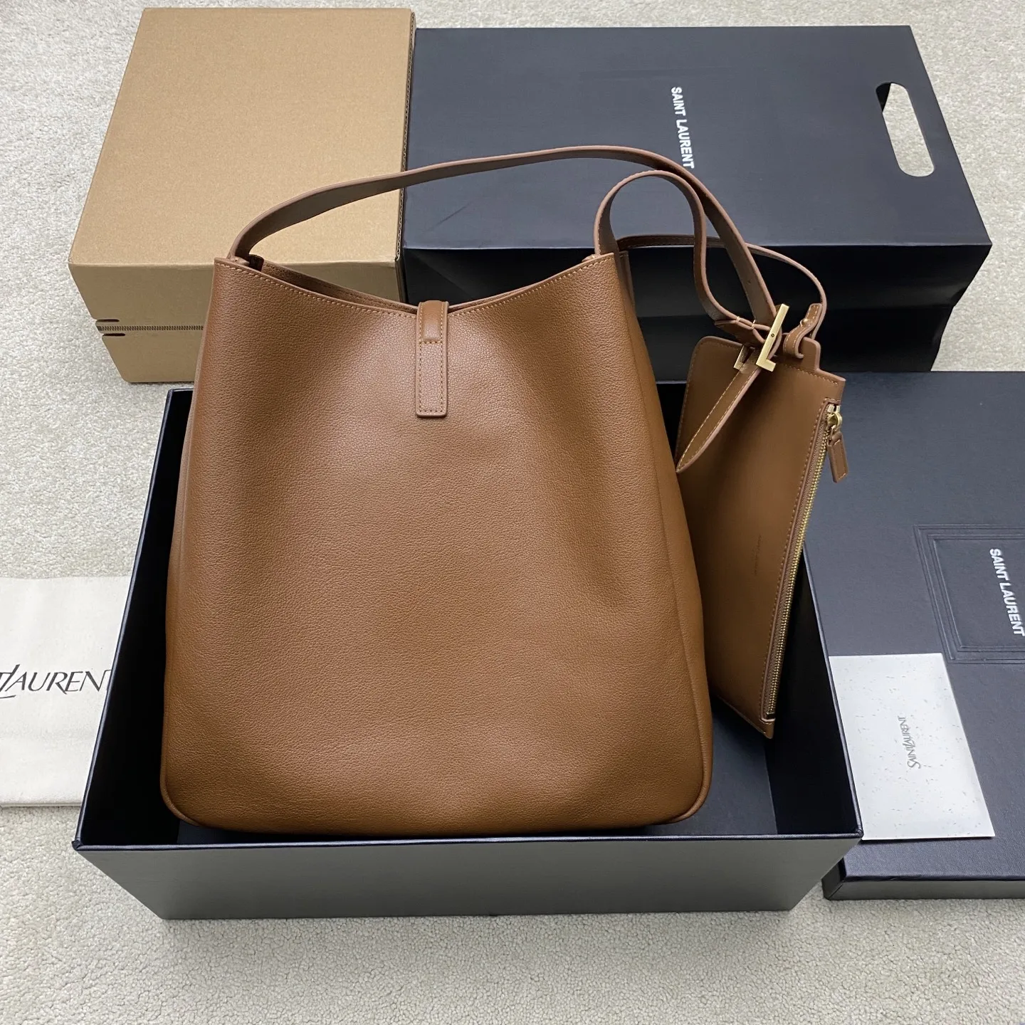 P Brown Plain Weave/Gold YSL Brand New Upgraded Version with Small Bag Hobo Shoulder Bag, made of black top-grain cowhide + gold logo, simple yet sophisticated! The shoulder strap is adjustable, suitable for both shoulder and hand carry, perfect for commuting or casual outings. The small bag is detachable. The interior features compartments and a zipper pocket, making storage extremely convenient! The leather is soft and lightweight, with a moderate capacity that easily accommodates daily essentials. Paired with a DuPont paper inner bag, the bottom is more stable and the space is tidier, practical yet stylish, making it a classic popular item from YSL!