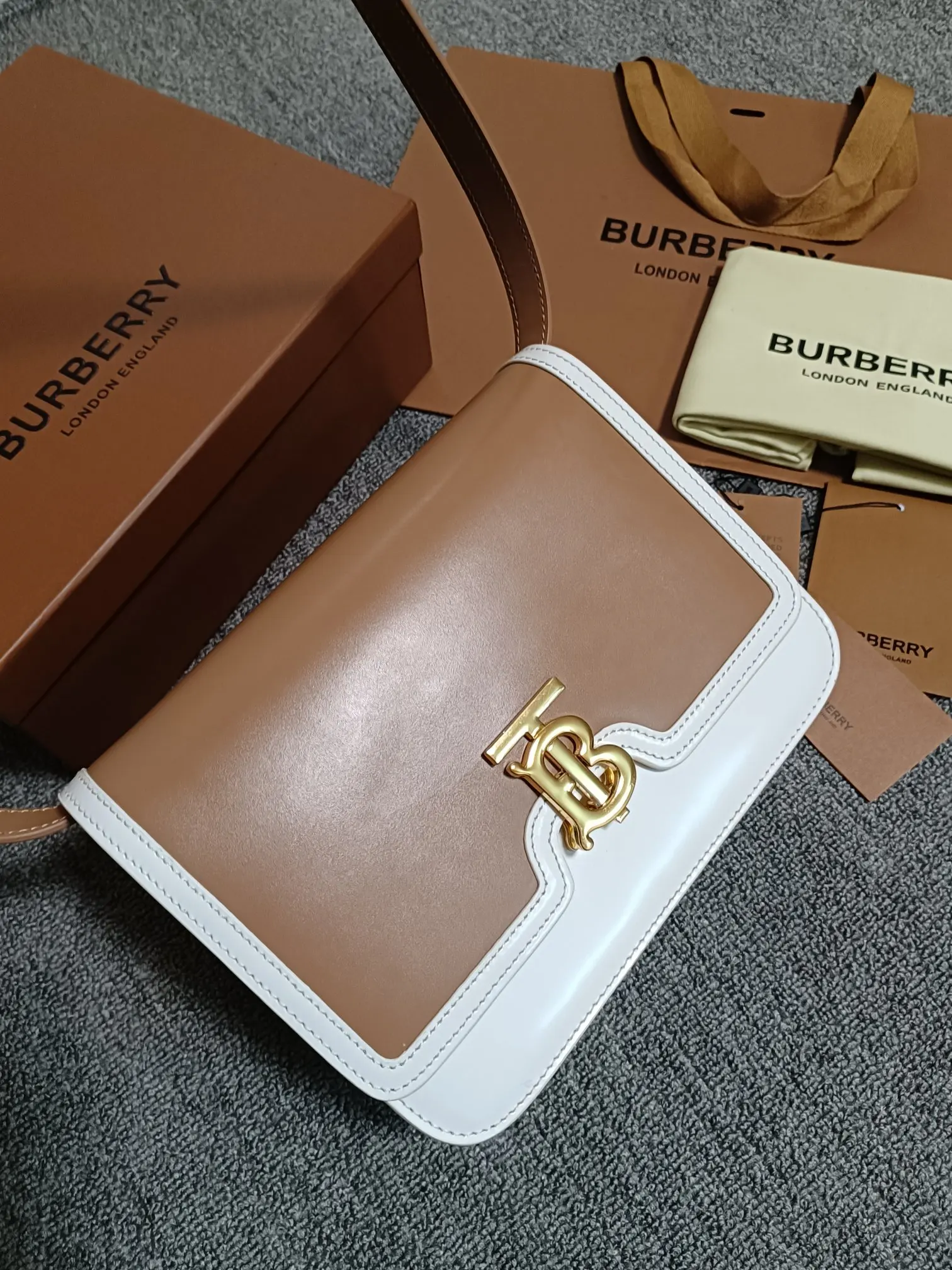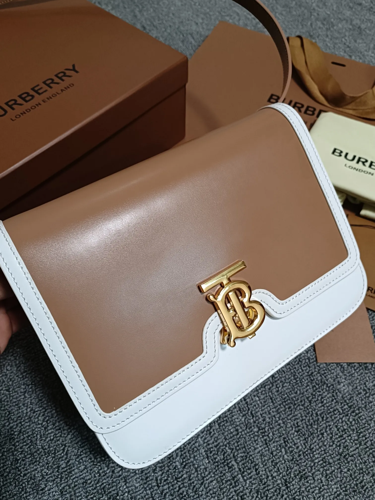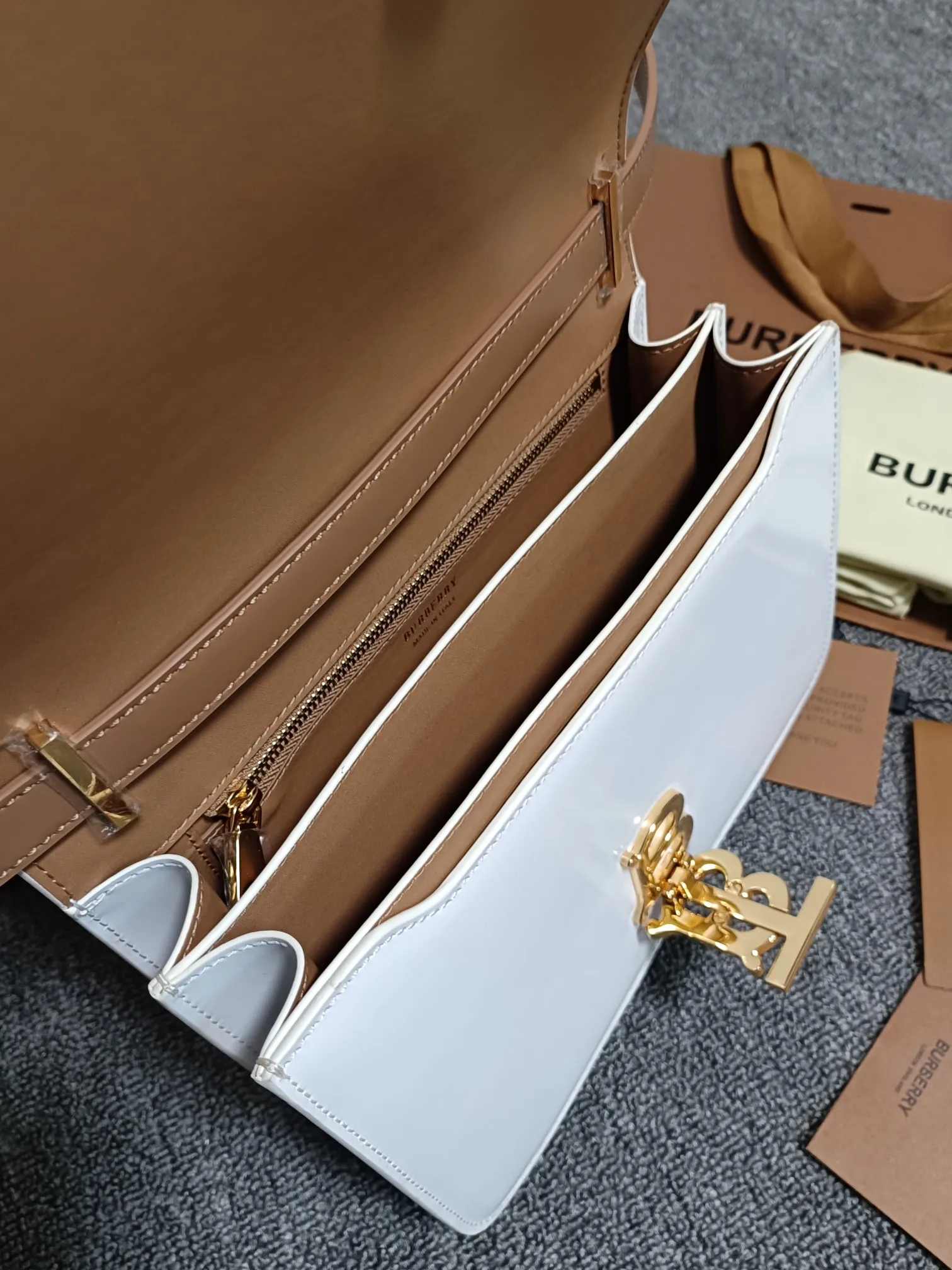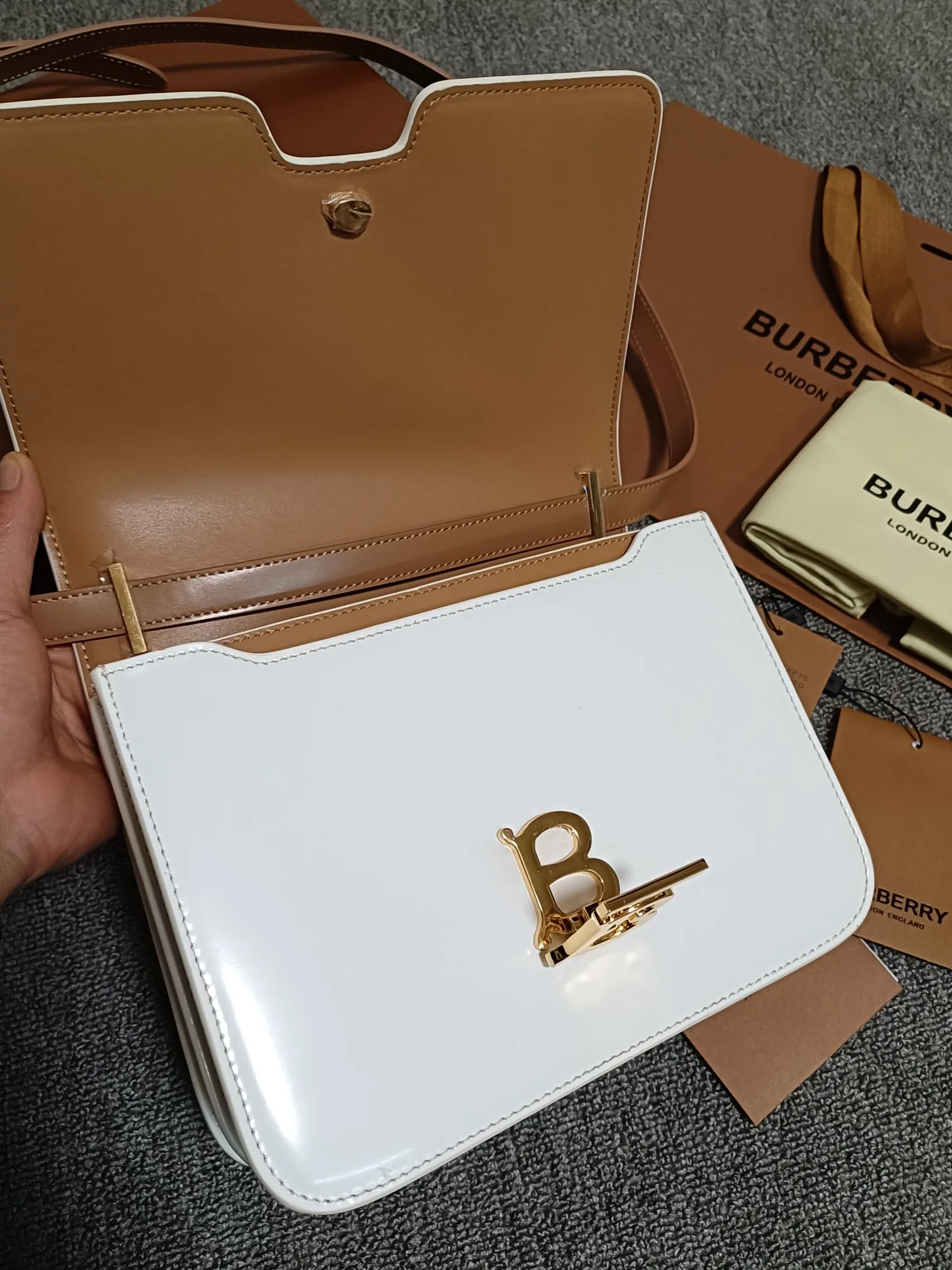 B family s TB medium exclusive logo two-tone leather lock bag, a structured leather shoulder bag with a smooth texture, featuring a lock decoration inspired by Thomas Bur s exclusive logo. It can be easily transformed into a crossbody bag or a clutch. Item number: 89063