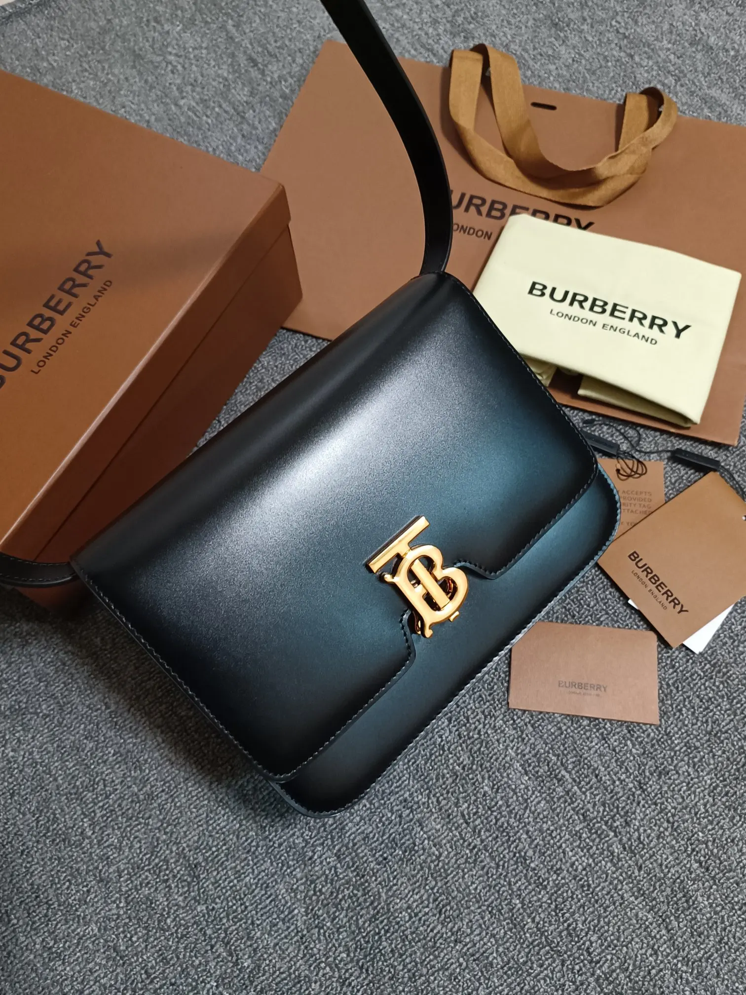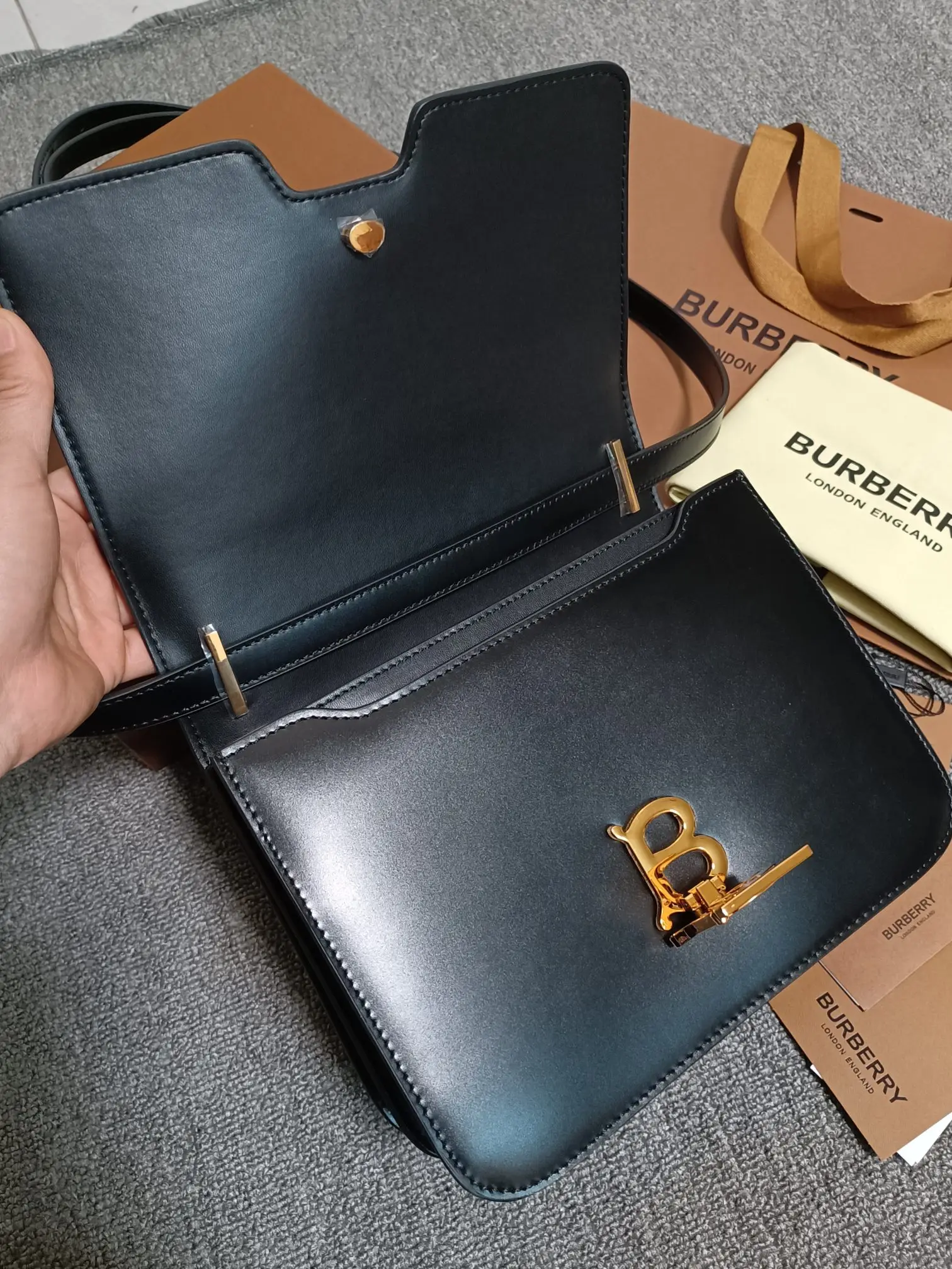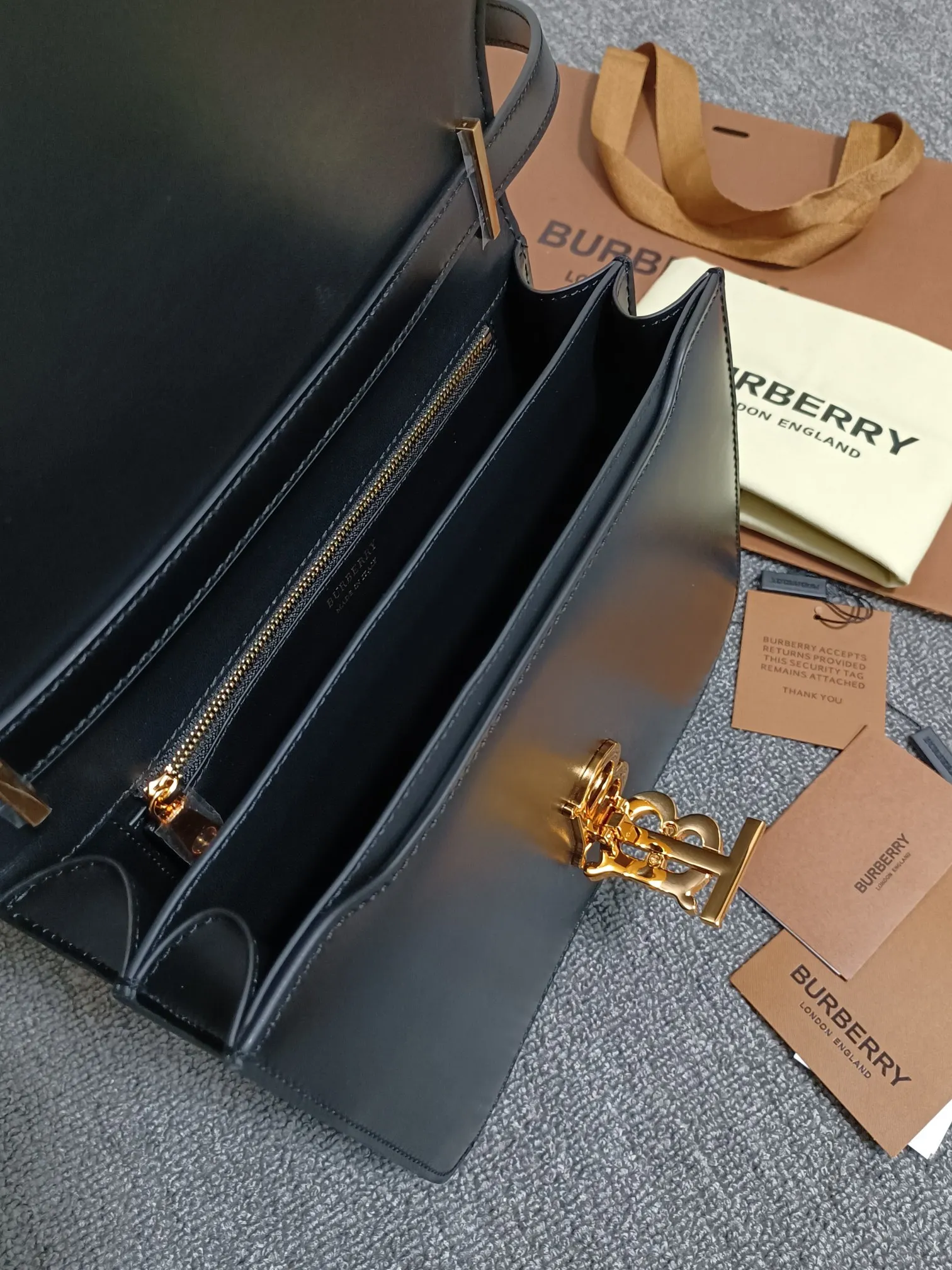 B family s TB medium exclusive logo leather lock bag, a structured leather shoulder bag with a smooth texture, featuring a lock decoration inspired by Thomas Bur s exclusive logo...