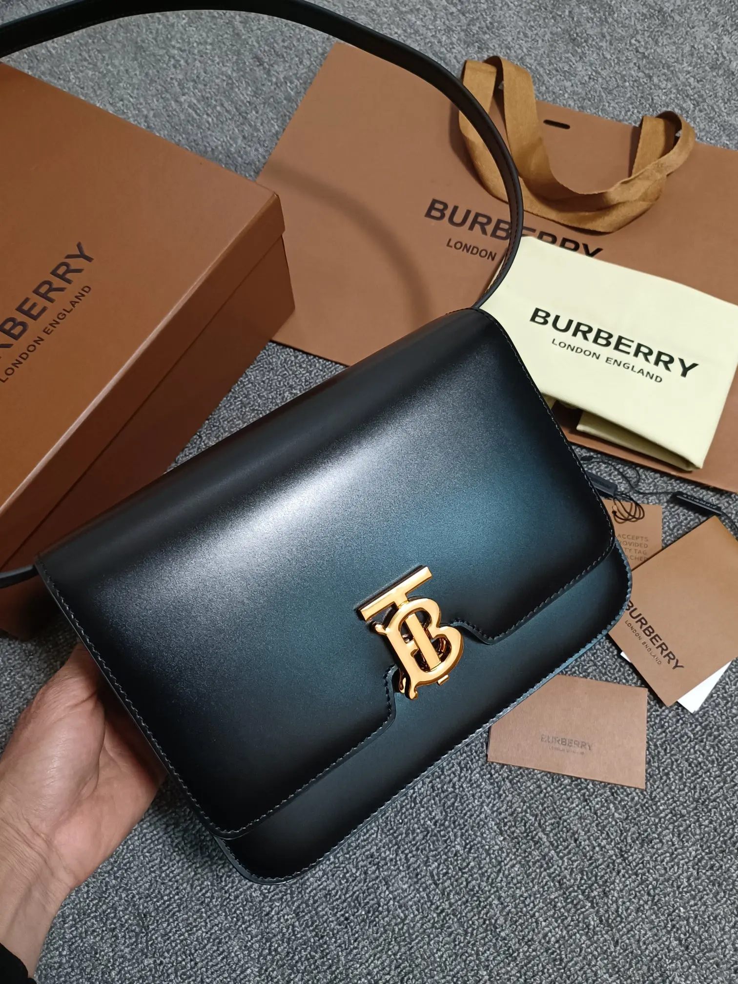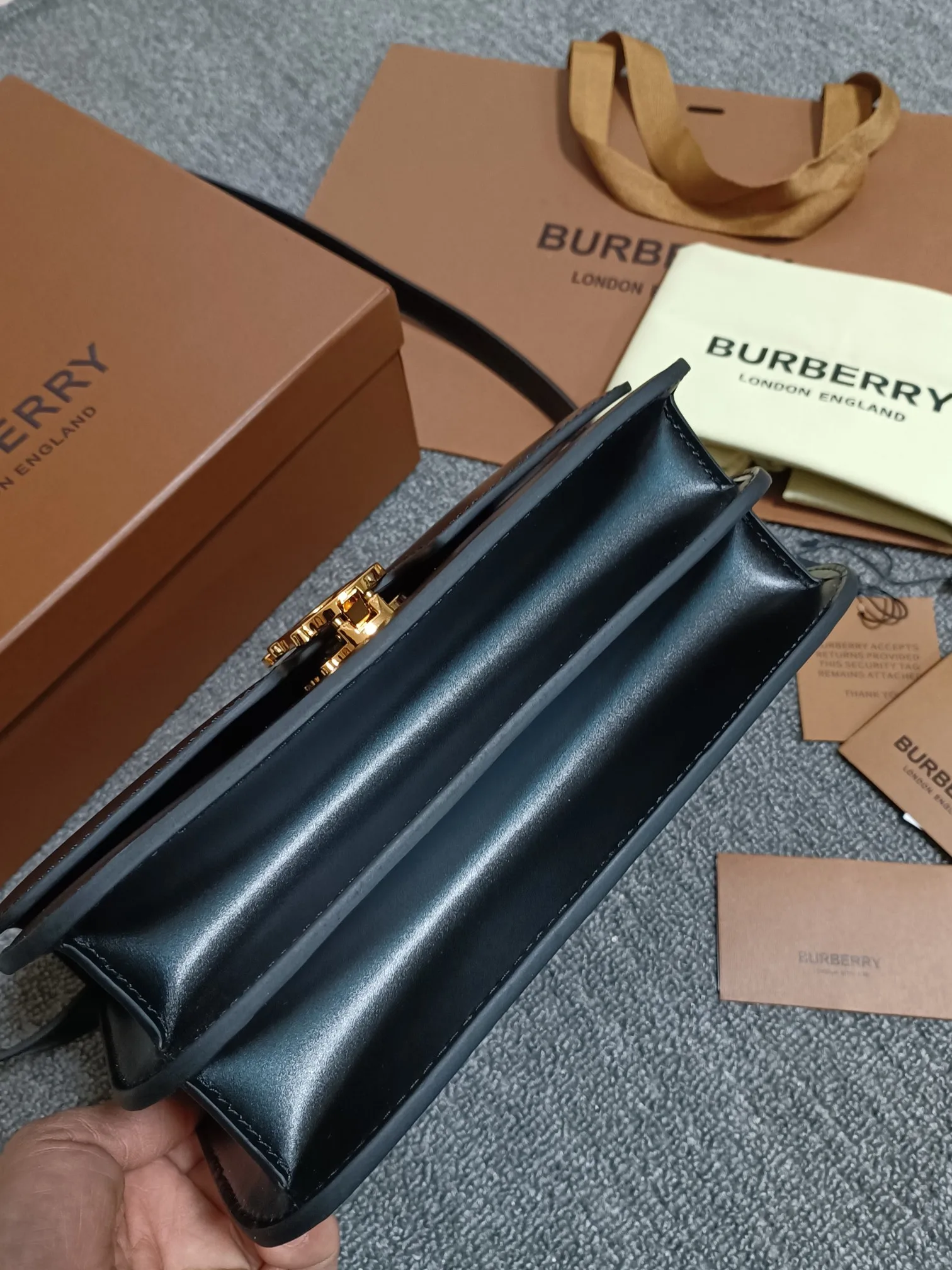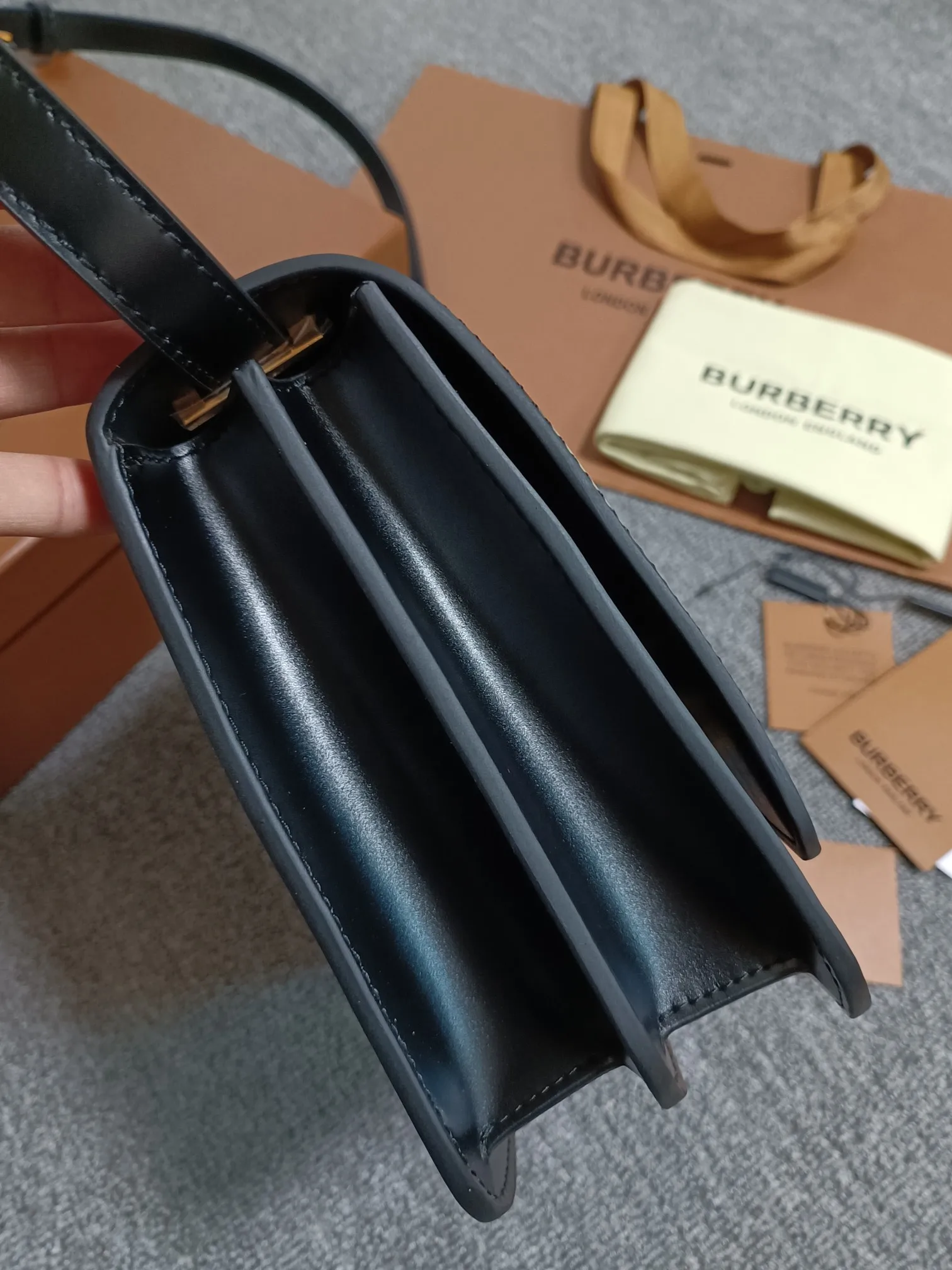 B family s TB medium exclusive logo leather lock bag, a structured leather shoulder bag with a smooth texture, featuring a lock decoration inspired by Thomas Bur s exclusive logo...