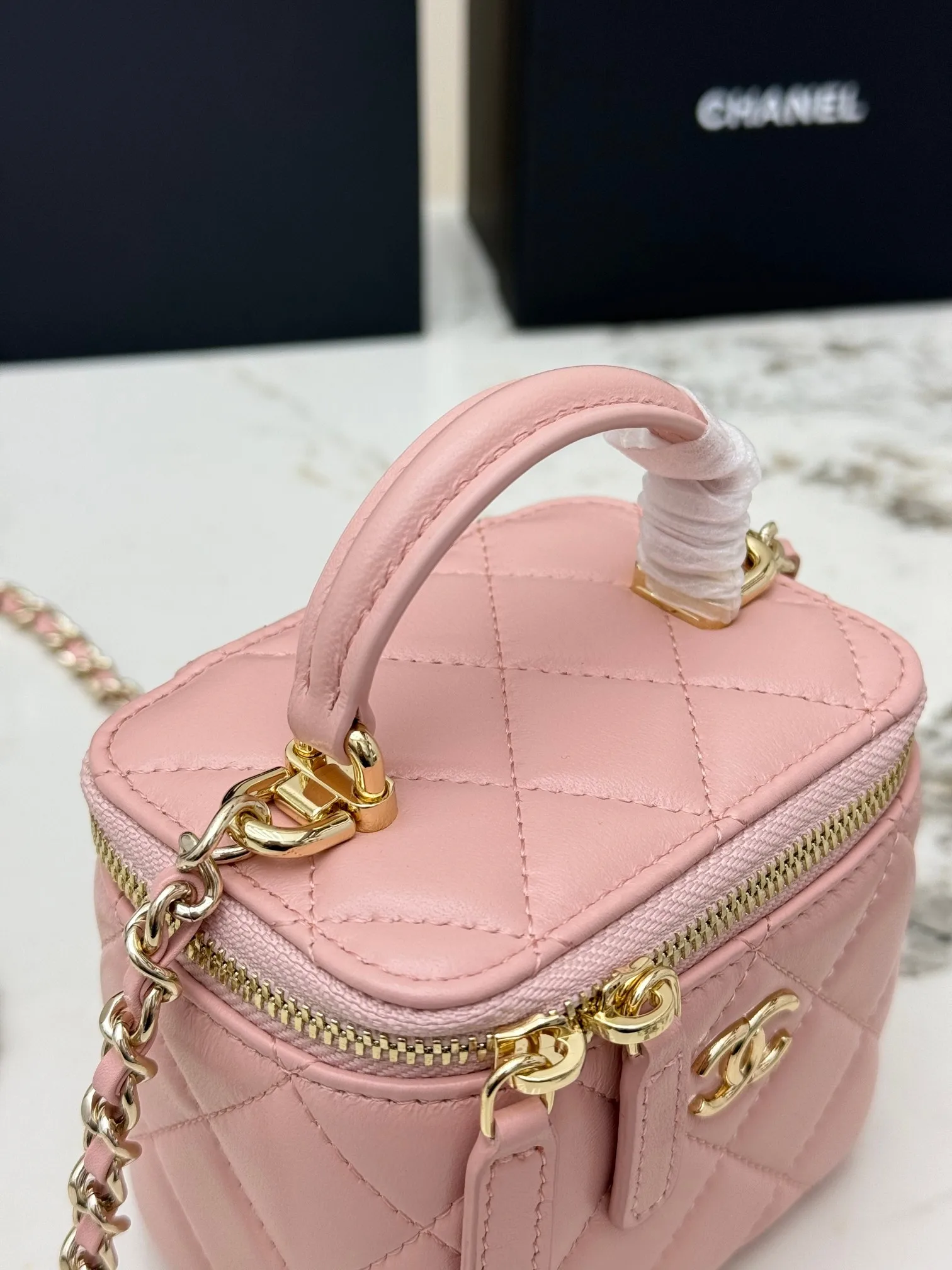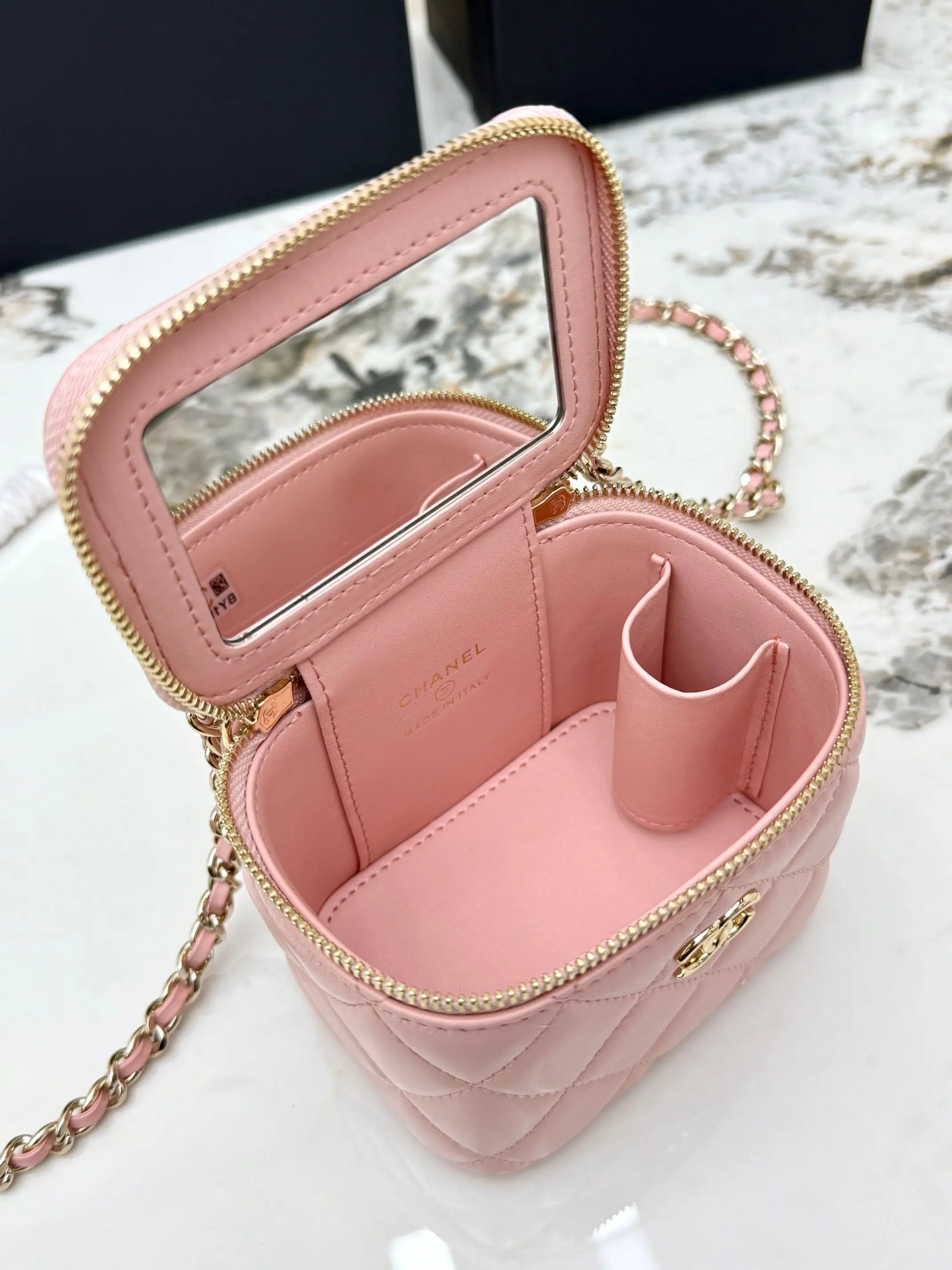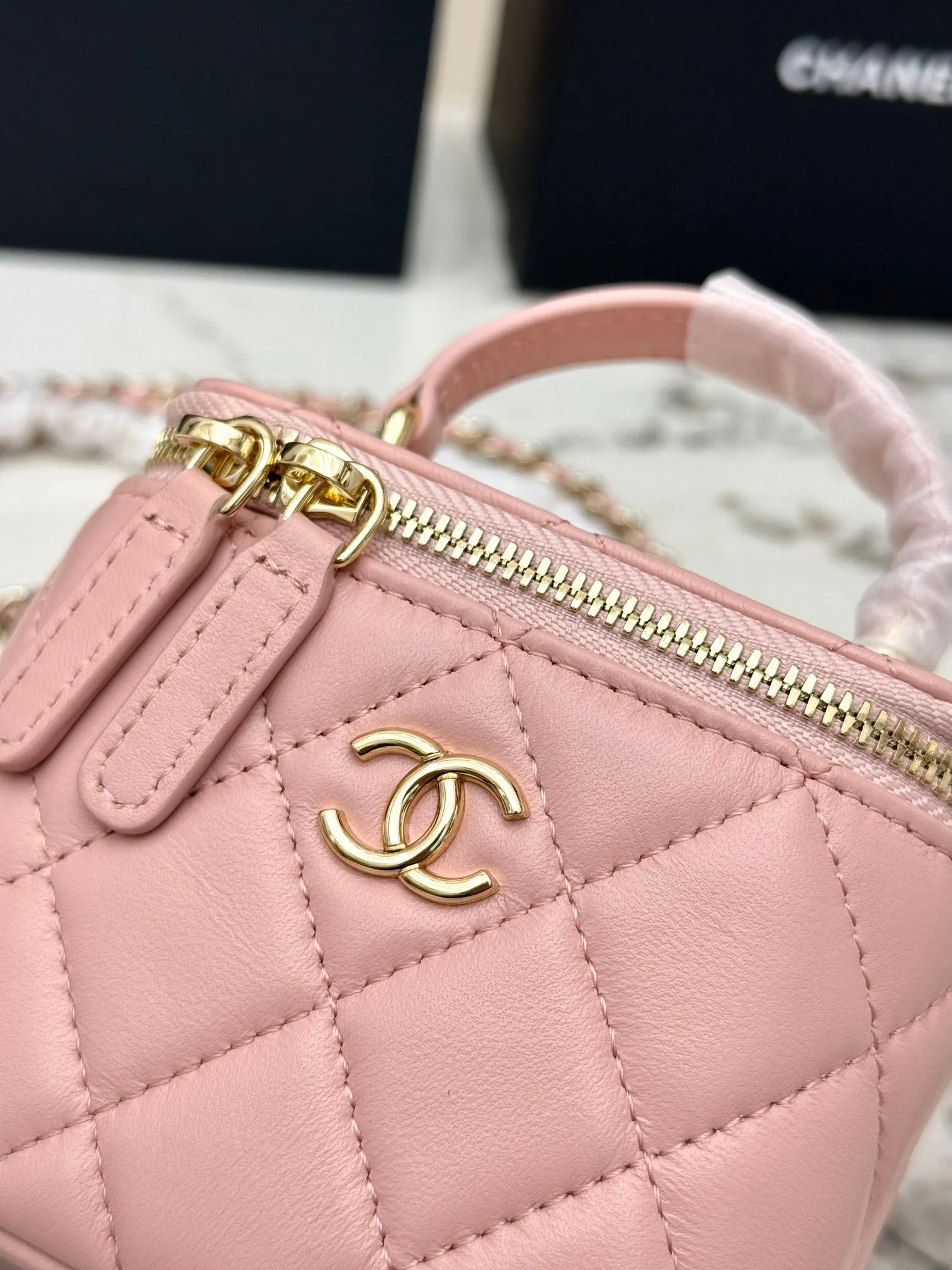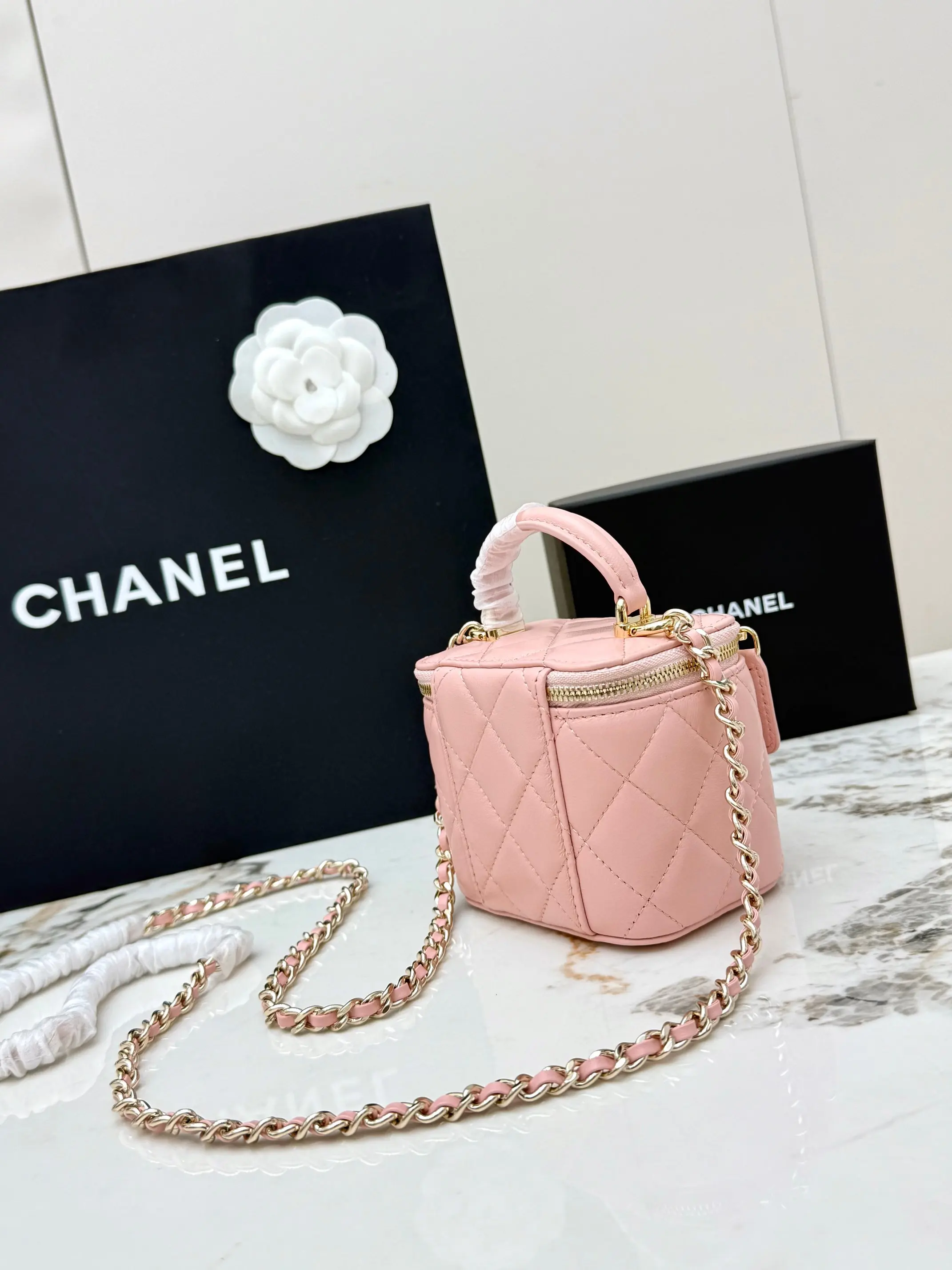 [Imported Original Leather ] [With Box] CHANEL [Rose] (Small) Chanel [Coffee] 21K Makeup Bag. This new box chain makeup bag from Grandma Chanel is truly a popular item this year. Since its launch, this series has captured the hearts of many girls! Compact and cute, it can be worn crossbody or carried by hand, making it youthful and stylish [Strong]. The entire bag features a classic diamond quilted design made of imported lambskin material.