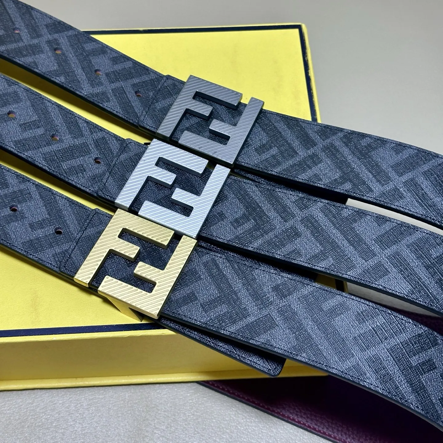 FENDI (Fendi) boutique same style 4.0CM wide double-ring reversible belt with FF stud buckle in burgundy Cuoio Romano leather material, reverse side fabric features tobacco yellow ..