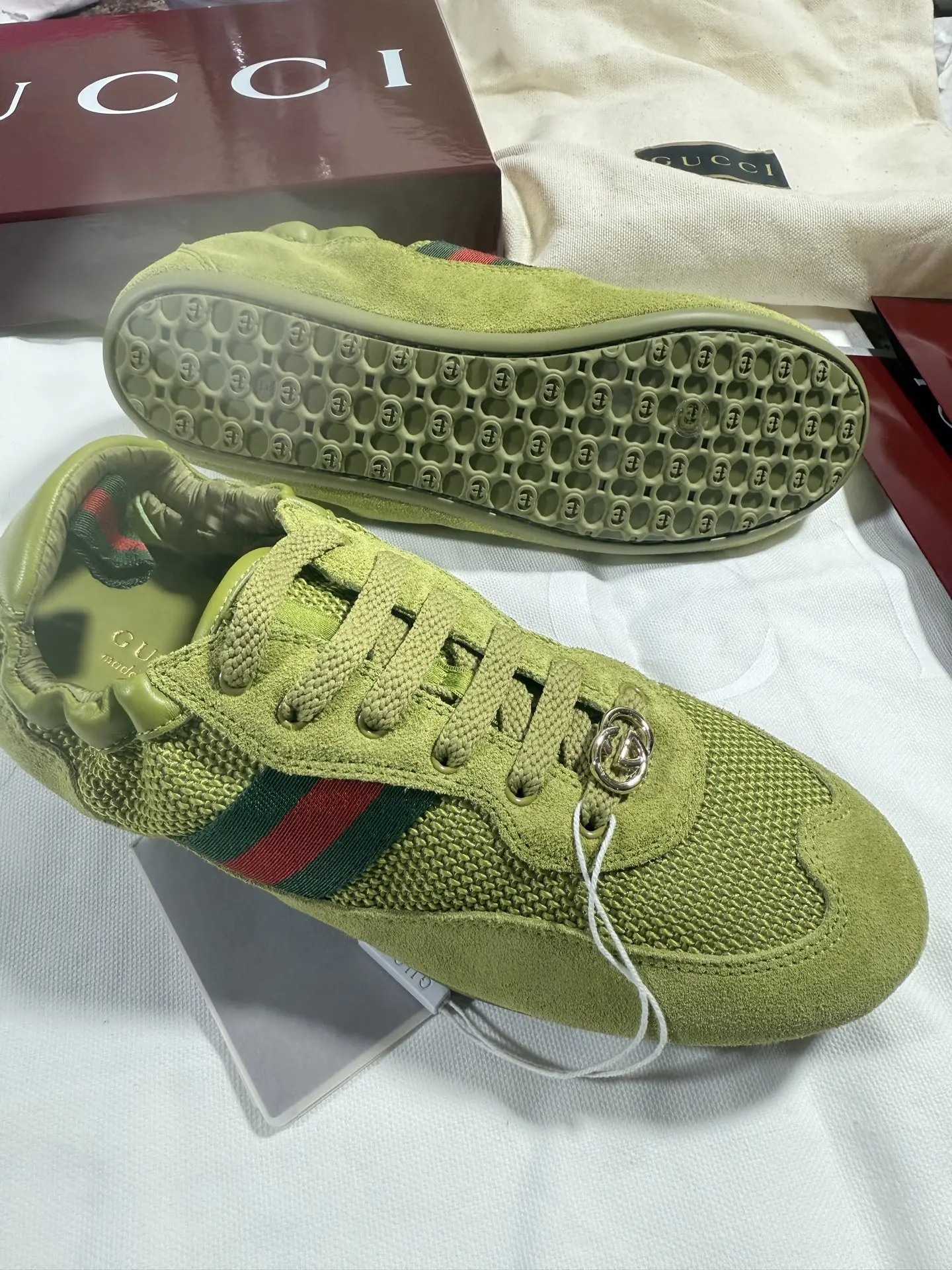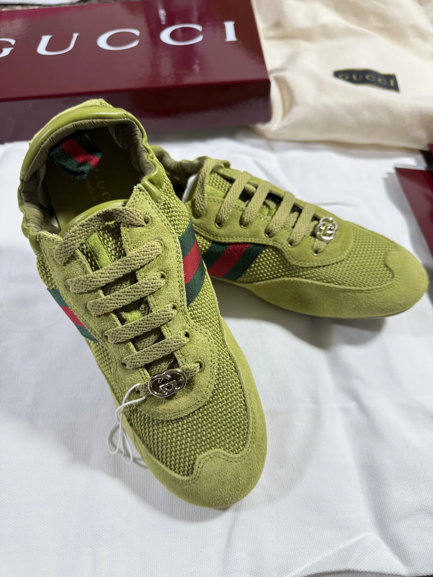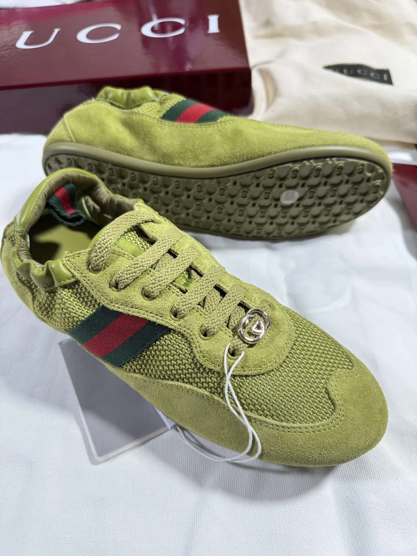 GG elastic shoes dance shoes in brown suede + GG fabric, meticulously adorned with GG hardware buckle. Combines lightweight texture with a dazzling appearance. The shoe opening features lambskin wrapped elastic craftsmanship. Flexible and unrestricted, allowing for free movement! Lambskin + latex insole! TPU outsole! Sizes 35-40. Emerald green:
