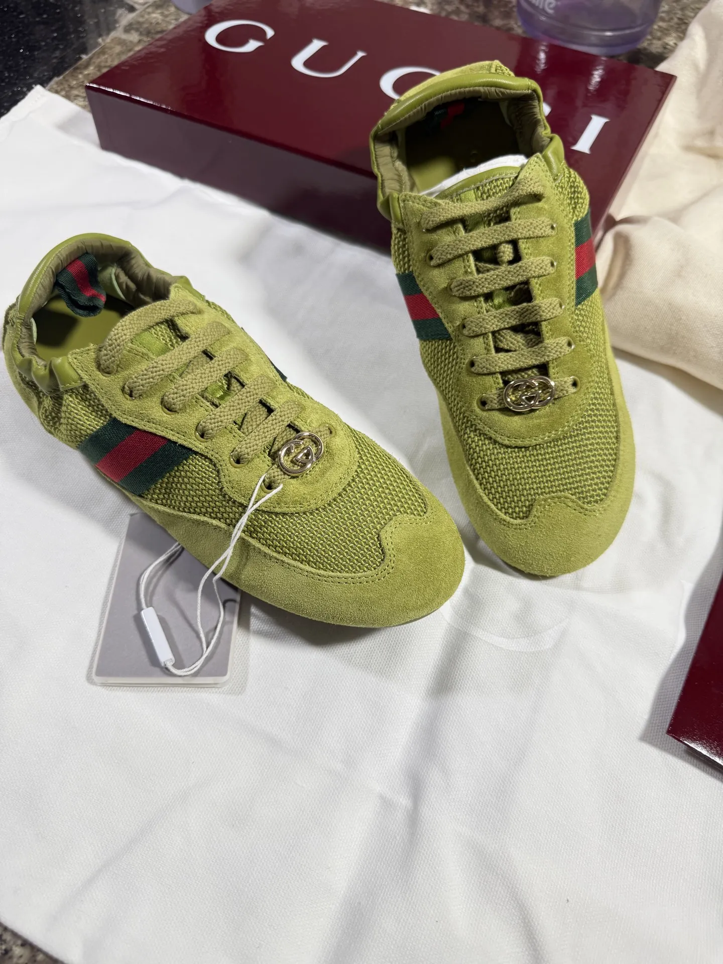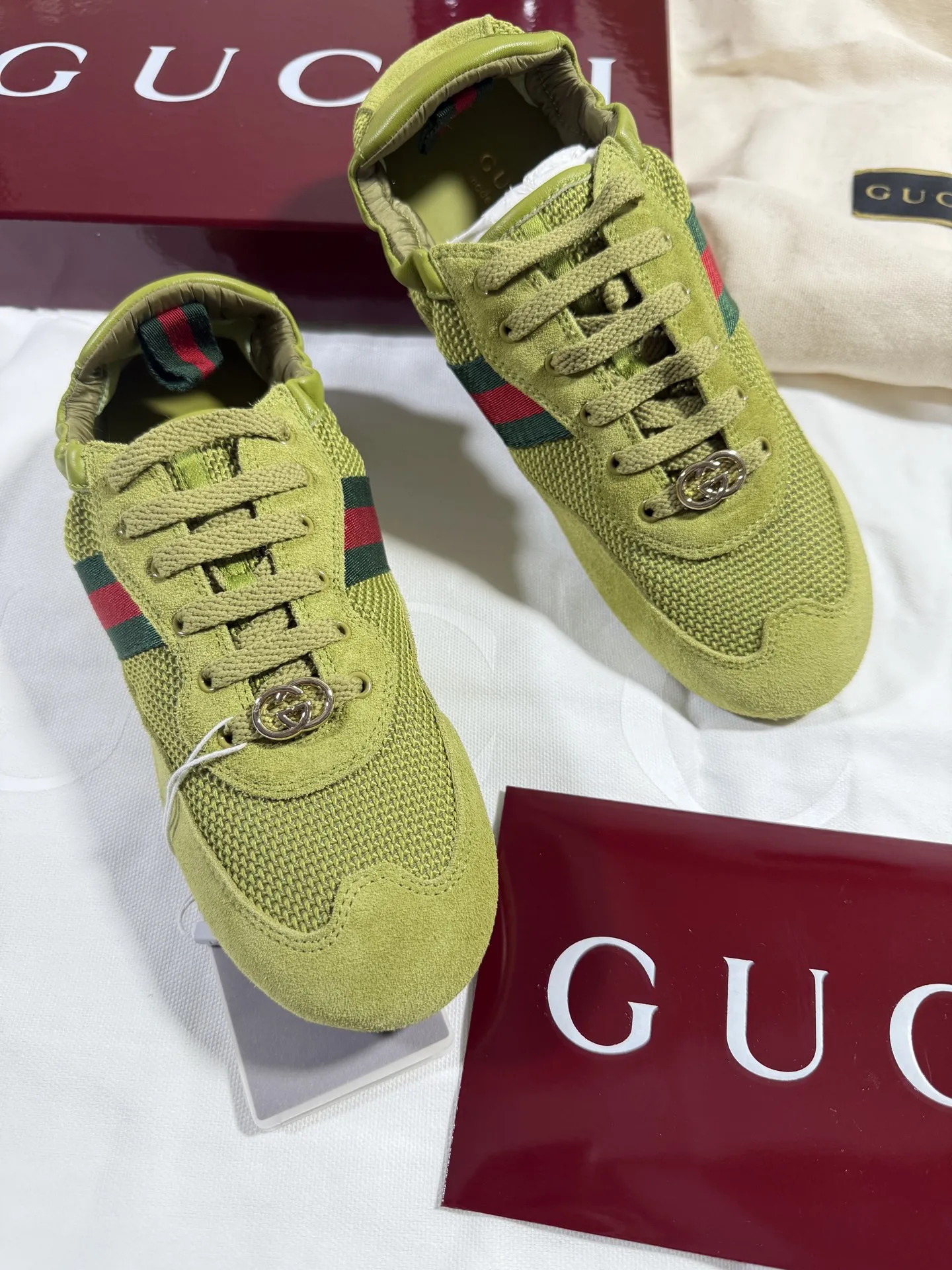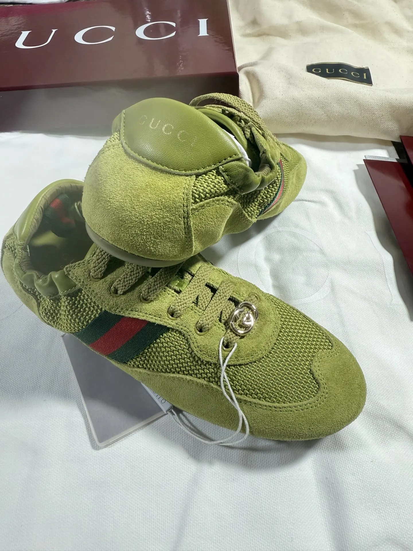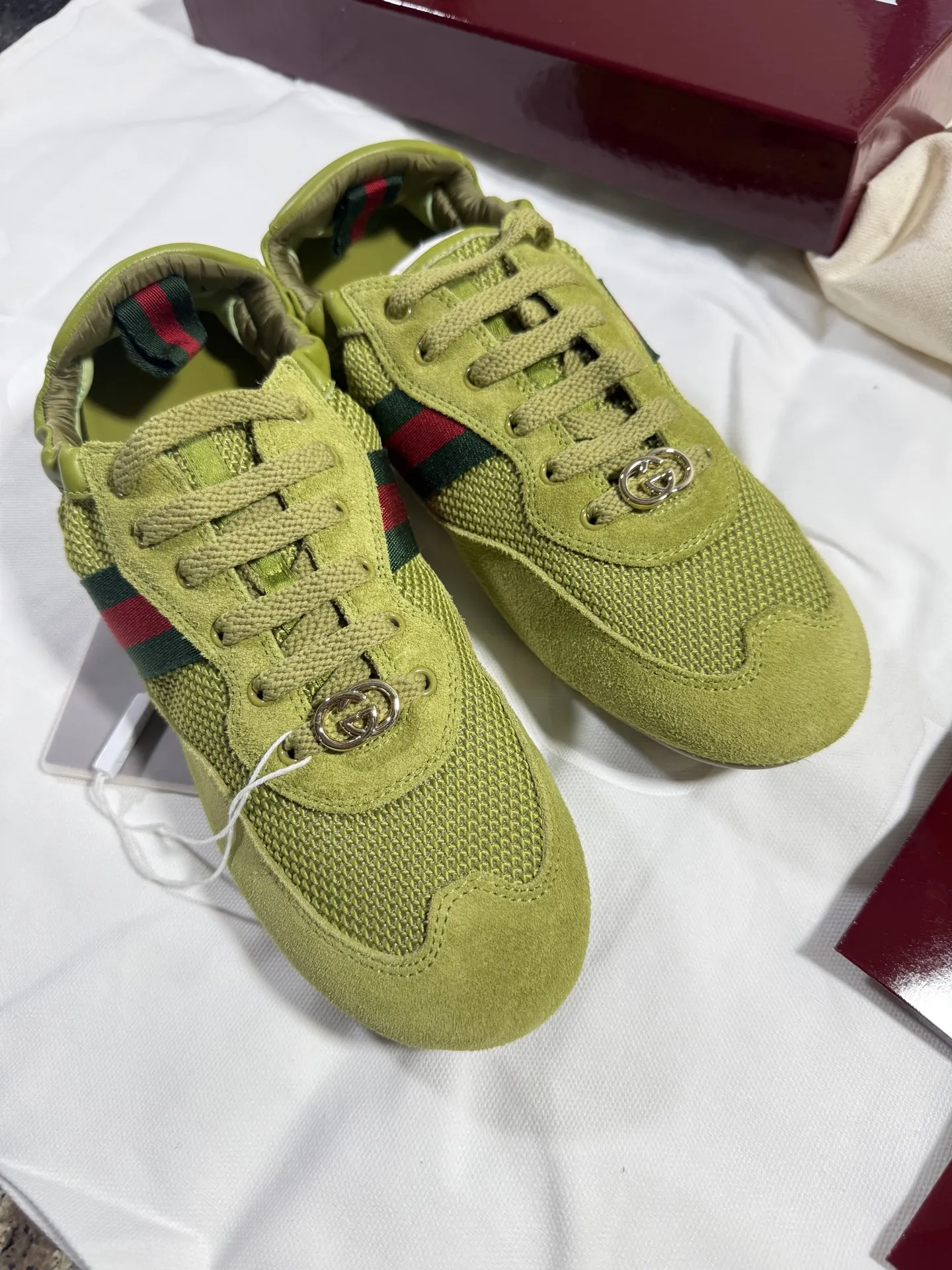 GG elastic shoes dance shoes in brown suede + GG fabric, meticulously adorned with GG hardware buckle. Combines lightweight texture with a dazzling appearance. The shoe opening features lambskin wrapped elastic craftsmanship. Flexible and unrestricted, allowing for free movement! Lambskin + latex insole! TPU outsole! Sizes 35-40. Emerald green: