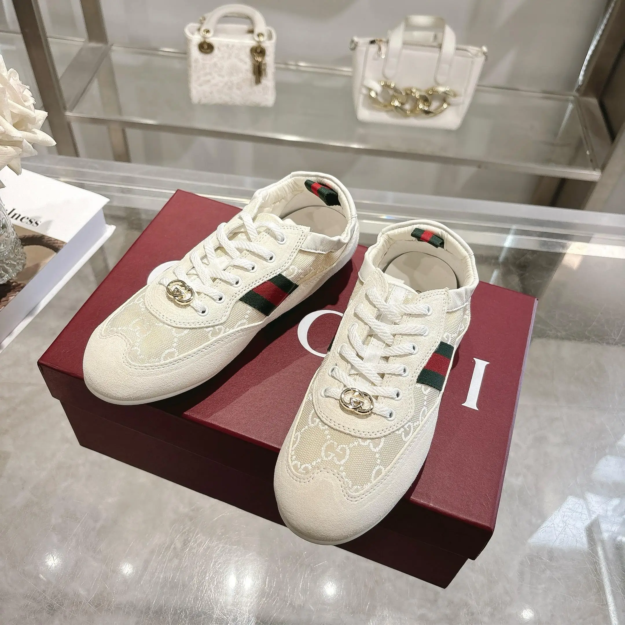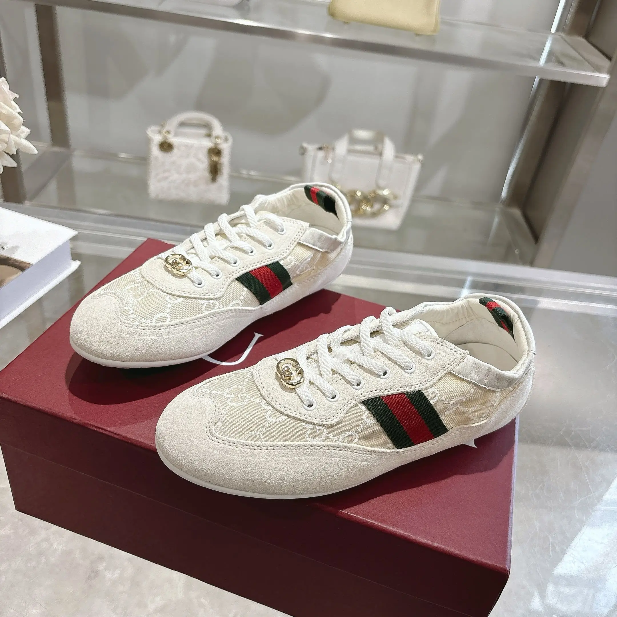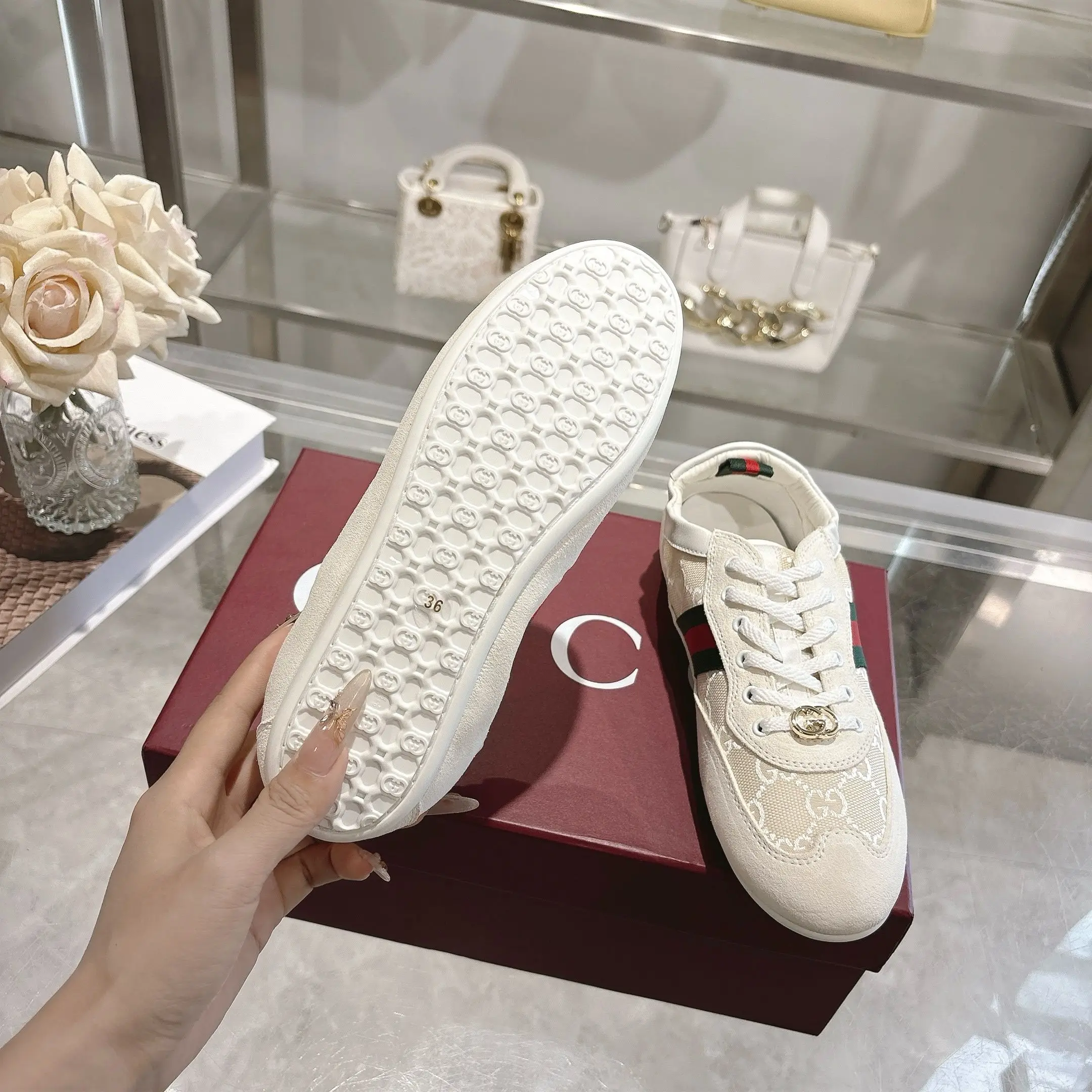 GG elastic shoes dance shoes. Off-white suede leather + GG fabric, meticulously adorned with GG hardware buckle. Combines lightweight texture with a dazzling appearance. The shoe opening features lambskin wrapped elastic craftsmanship. Flexible and unrestricted, allowing for free movement! Lambskin + latex insole! TPU outsole! Sizes 35-40.