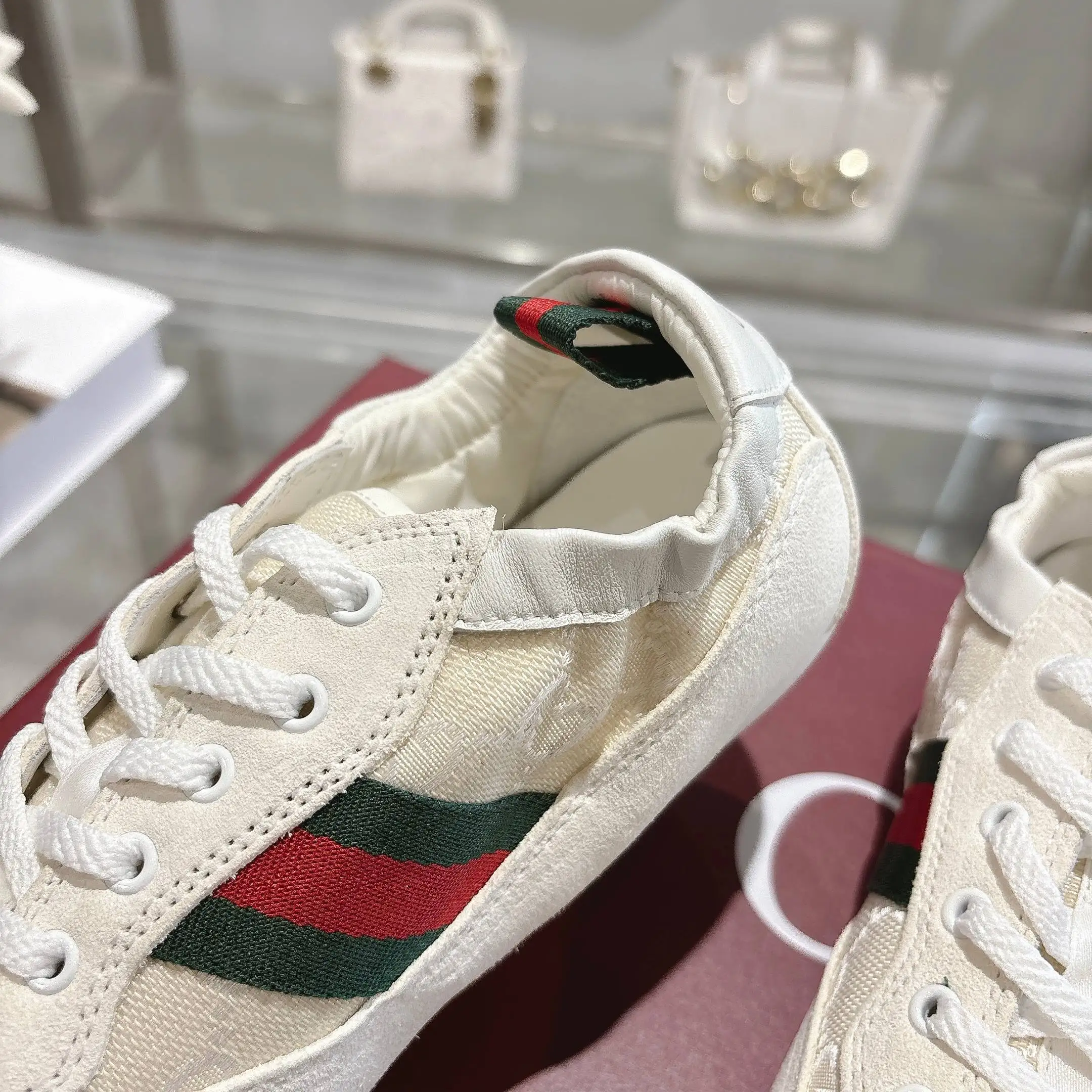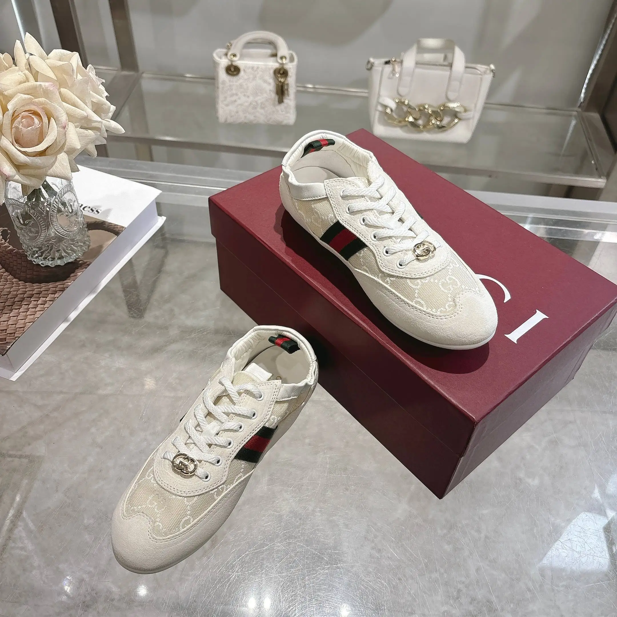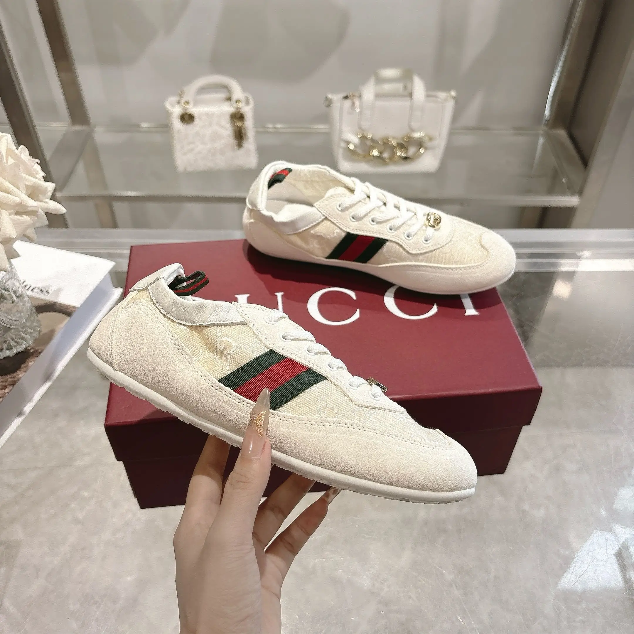 GG elastic shoes dance shoes. Off-white suede leather + GG fabric, meticulously adorned with GG hardware buckle. Combines lightweight texture with a dazzling appearance. The shoe opening features lambskin wrapped elastic craftsmanship. Flexible and unrestricted, allowing for free movement! Lambskin + latex insole! TPU outsole! Sizes 35-40.