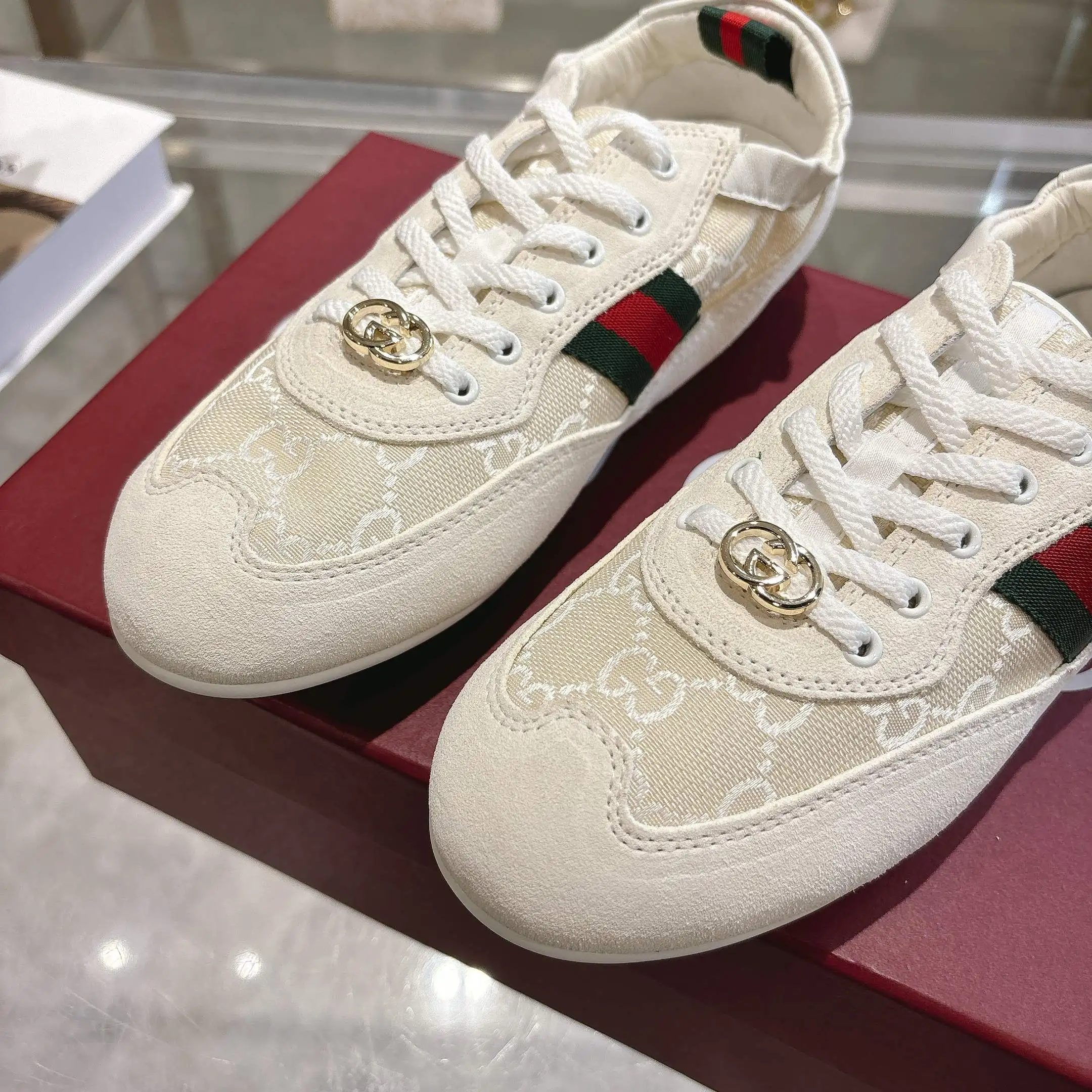 GG elastic shoes dance shoes. Off-white suede leather + GG fabric, meticulously adorned with GG hardware buckle. Combines lightweight texture with a dazzling appearance. The shoe ..