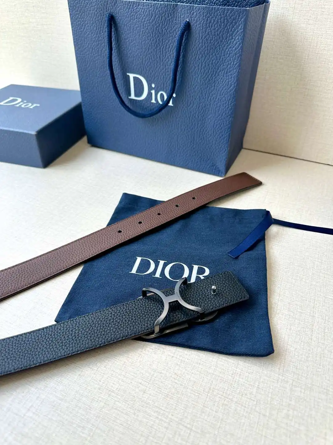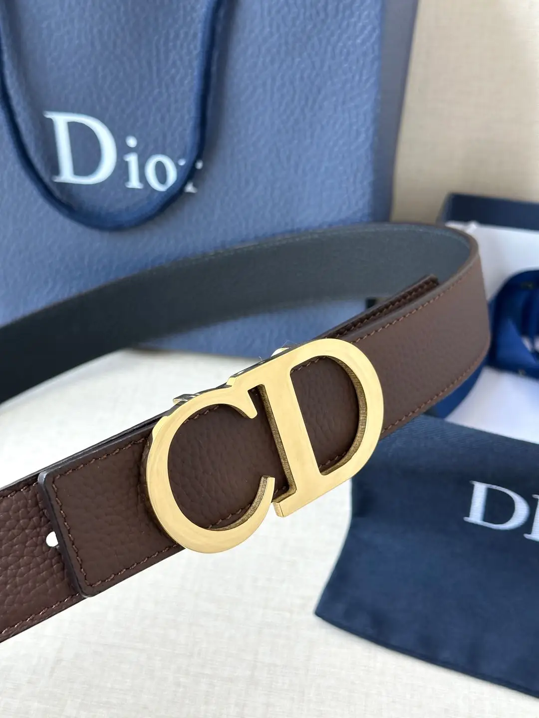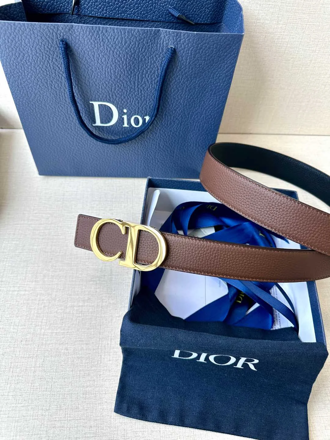 Dior width 3.5cm This 35mm reversible belt combines elegant temperament with modern style. Both sides are meticulously crafted from grain leather, one side is black, while the other offers multiple color options, allowing for pairing with various 35mm belt buckles to create a uniquely personalized accessory that is stylish and versatile.