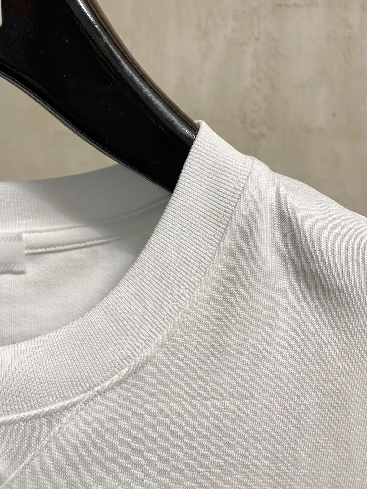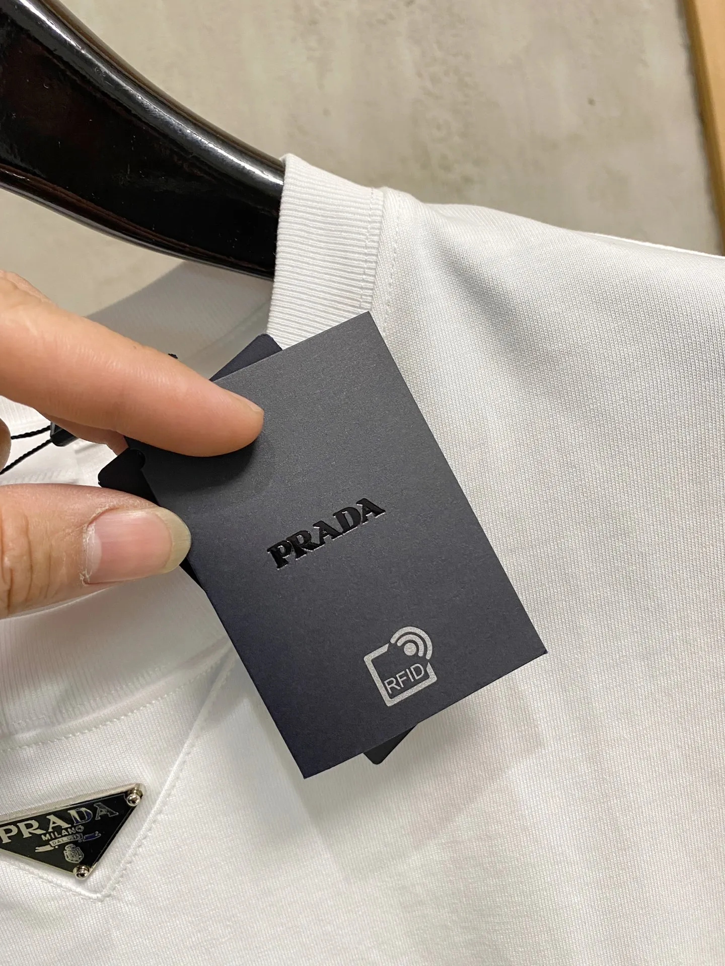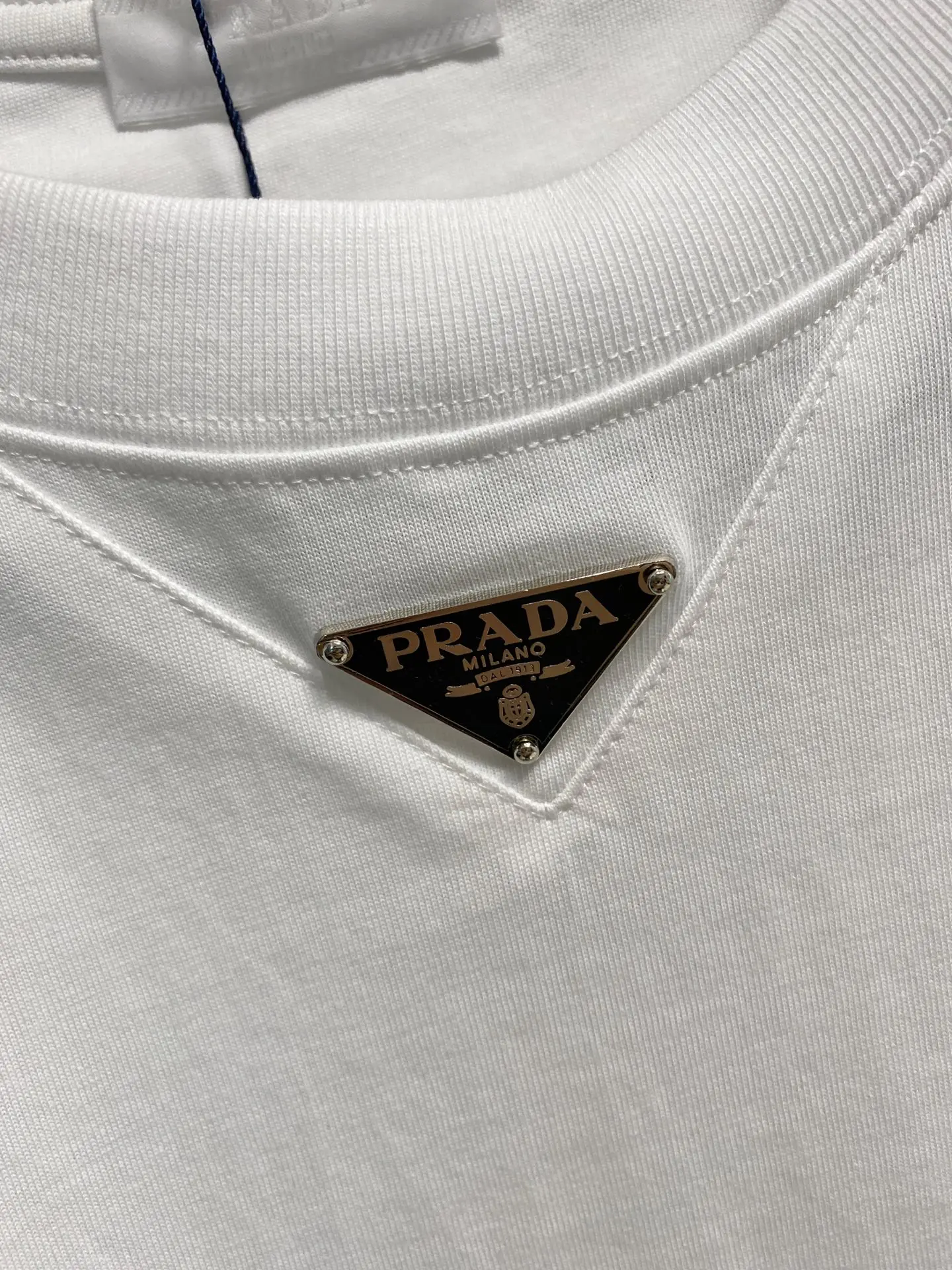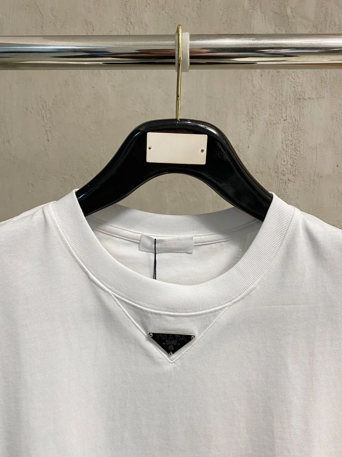 Prada 26ss Spring/Summer new classic logo enamel metal triangle logo short-sleeve T-shirt features the brand s iconic triangular metal logo on the front chest, providing high recognition. It is a timeless piece, extremely versatile, comfortable, breathable, soft, delicate, and slightly stretchy, made from high-quality fabric;