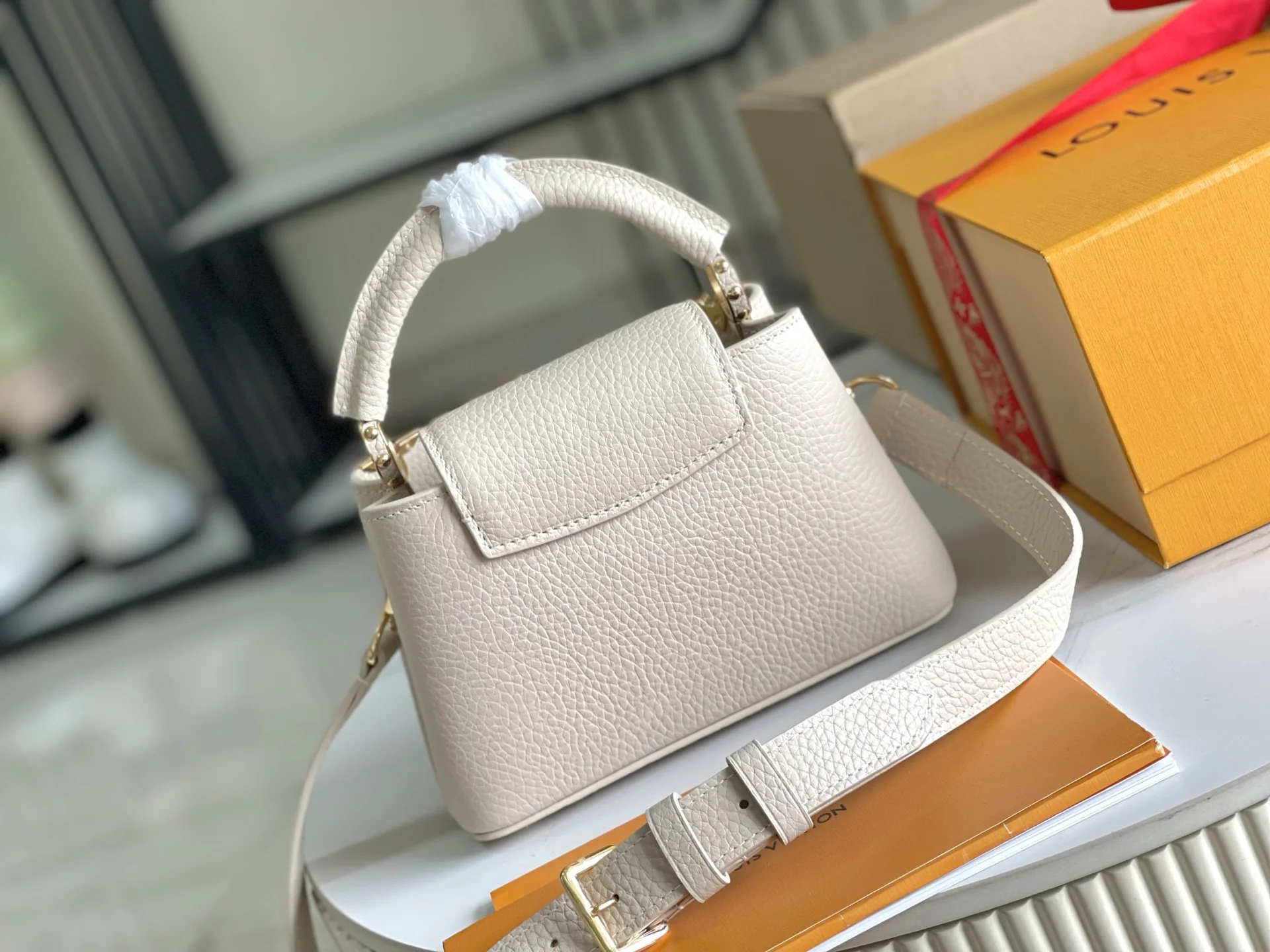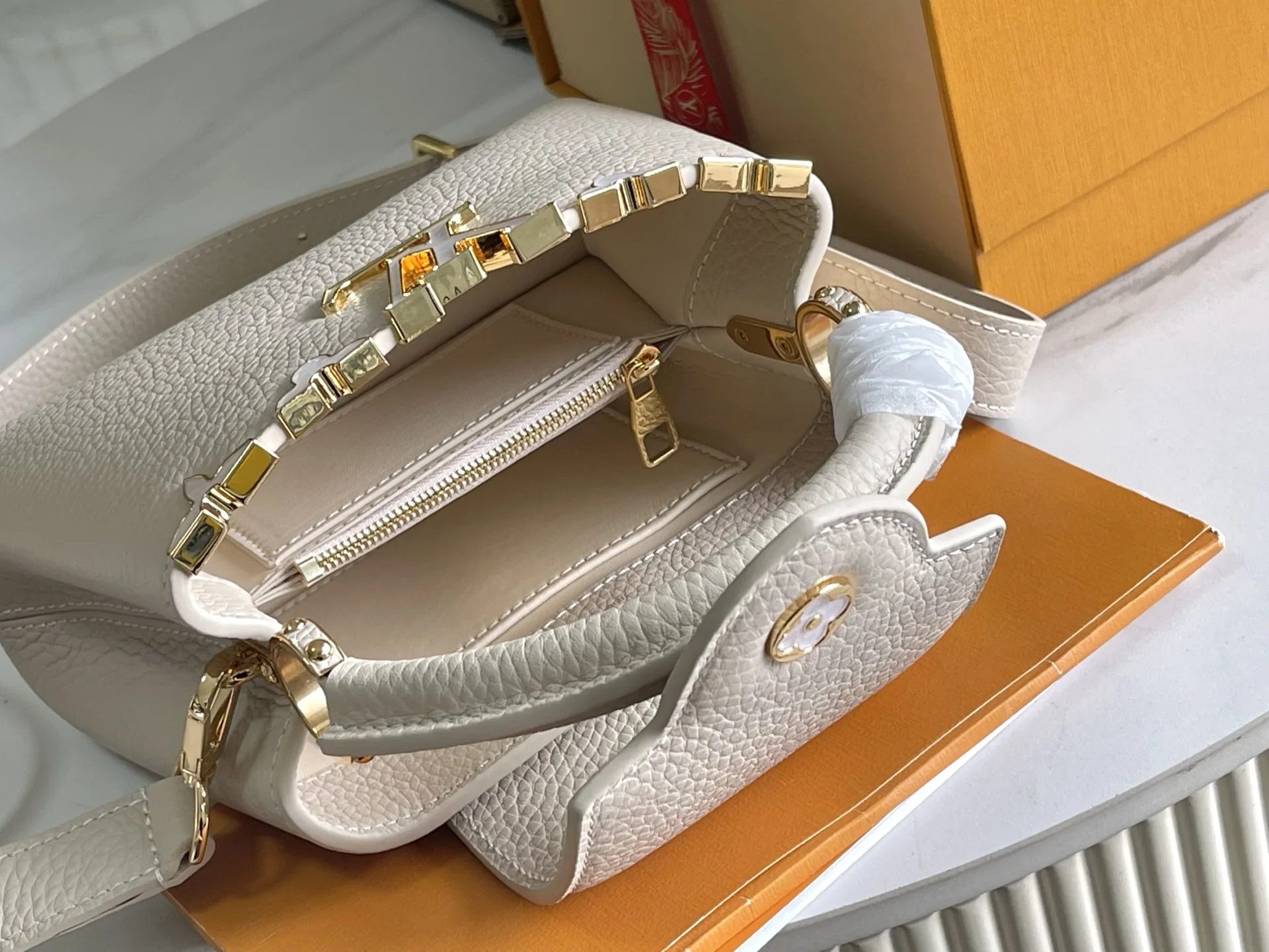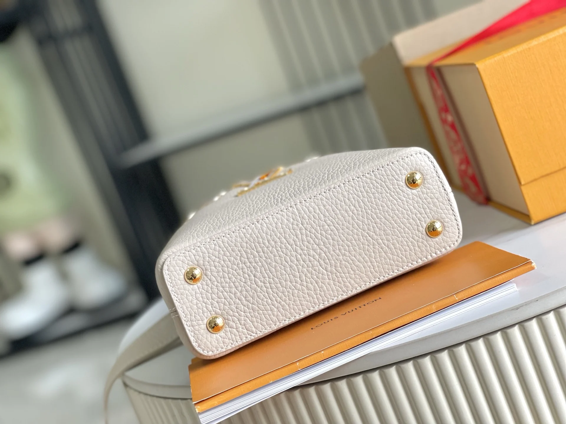 (163 chip) New version Premium original leather M11341 mini off-white Capucines with gold crown buckle The Capucines BB handbag tells a new story this season. The exquisite metall..