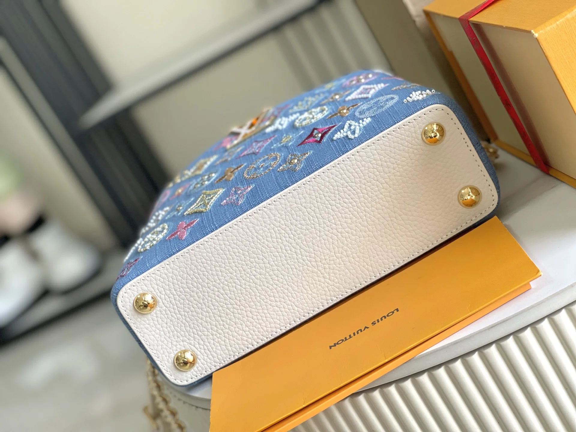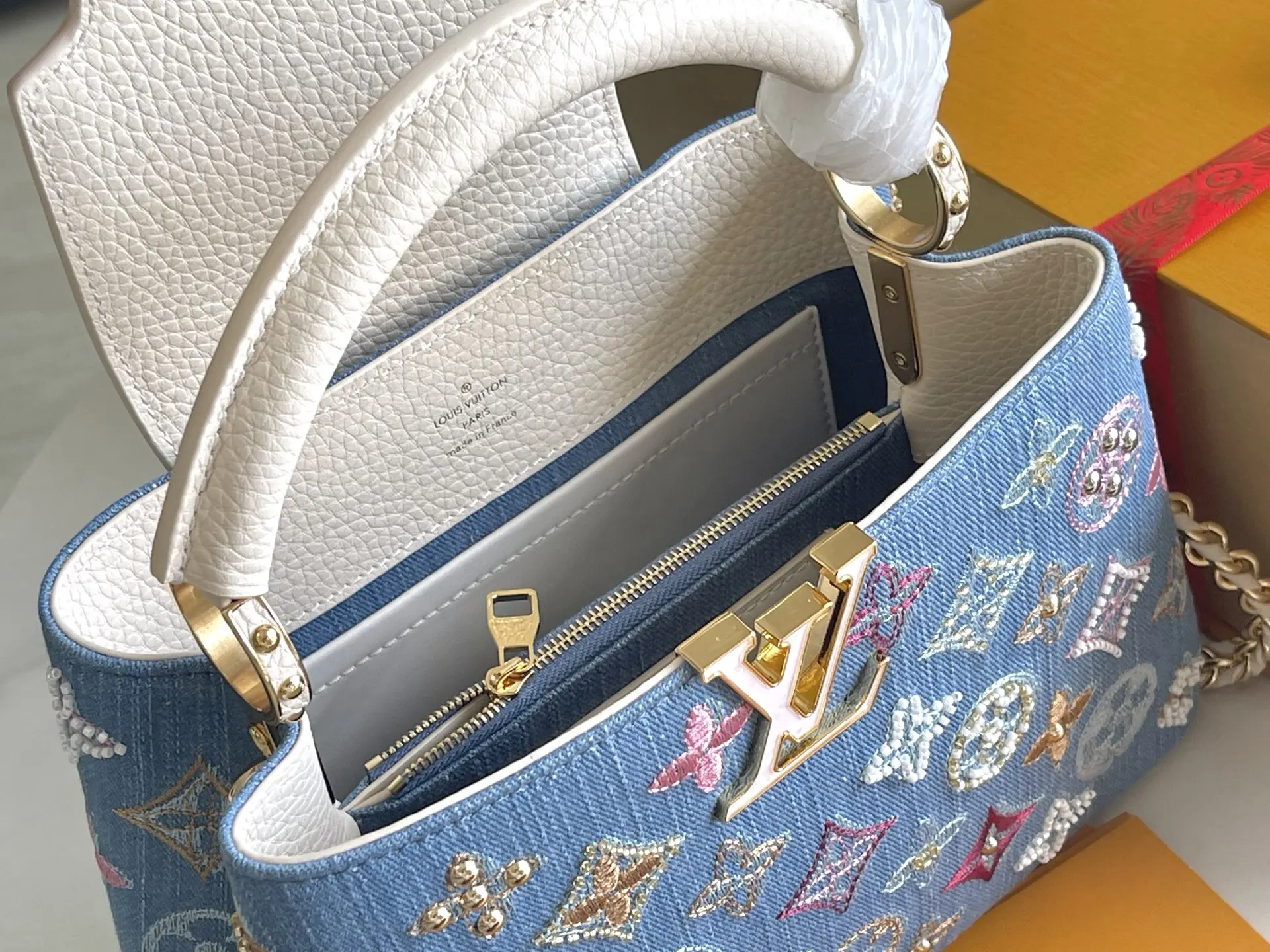 (163 chip) Premium Quality Original Leather M12947 Denim SmallThe Capucines BB handbag tells a new story this season. The exquisite metallic Monogram floral strap gives this class..