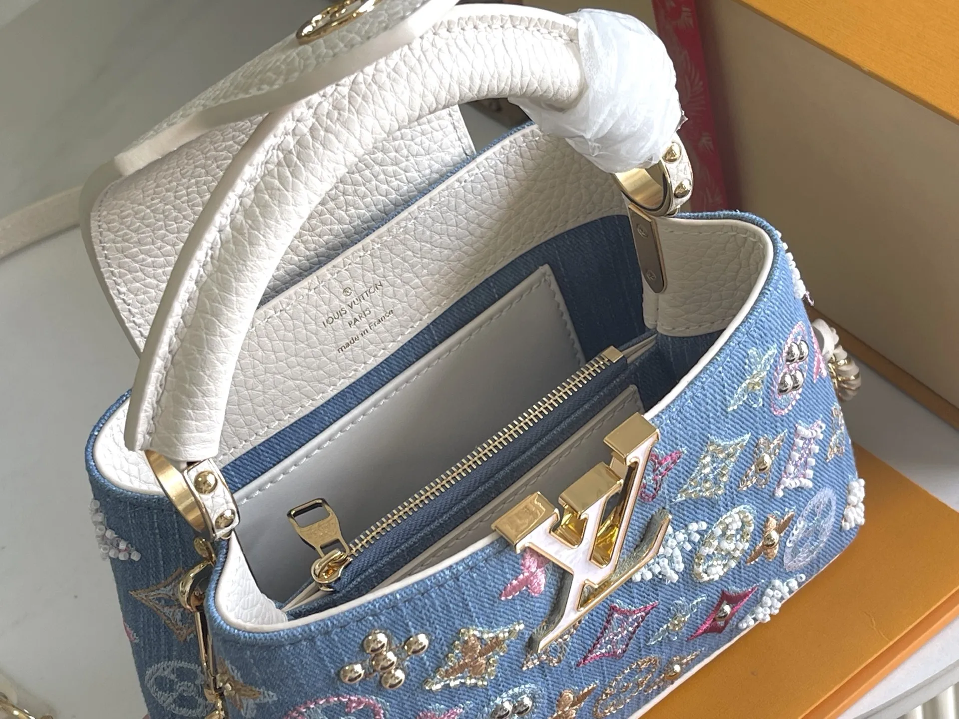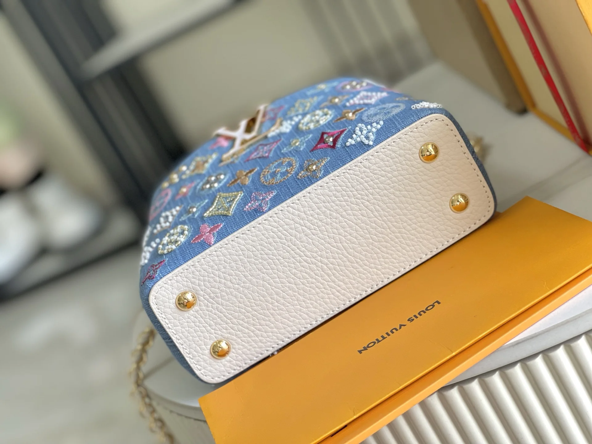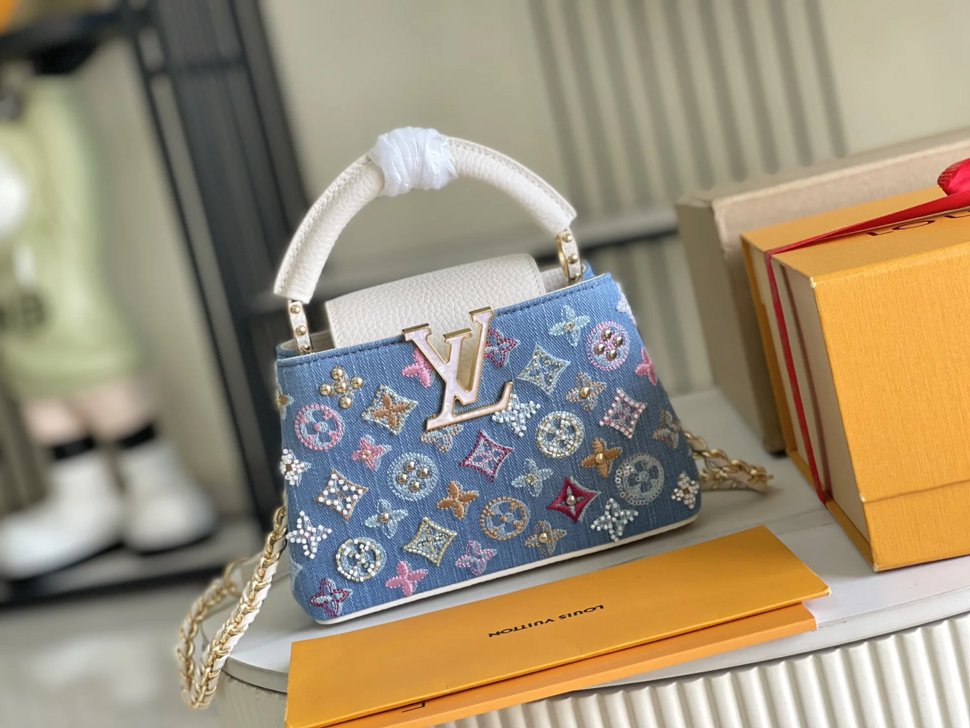 (163 chip) Premium Quality Original Leather M12947 Denim MiniThe Capucines BB handbag tells a new story this season. The exquisite metallic Monogram floral strap adds a softer ch..