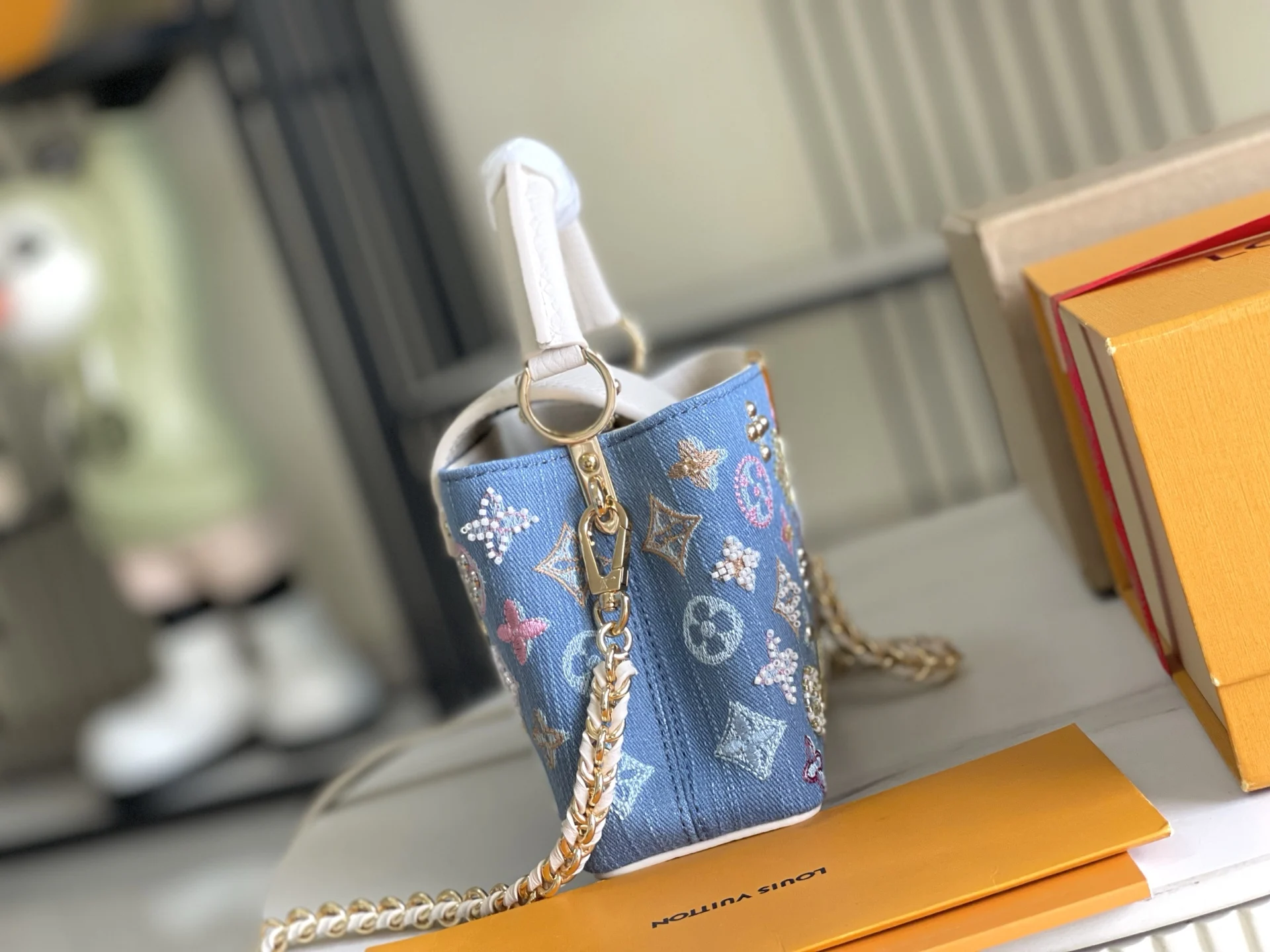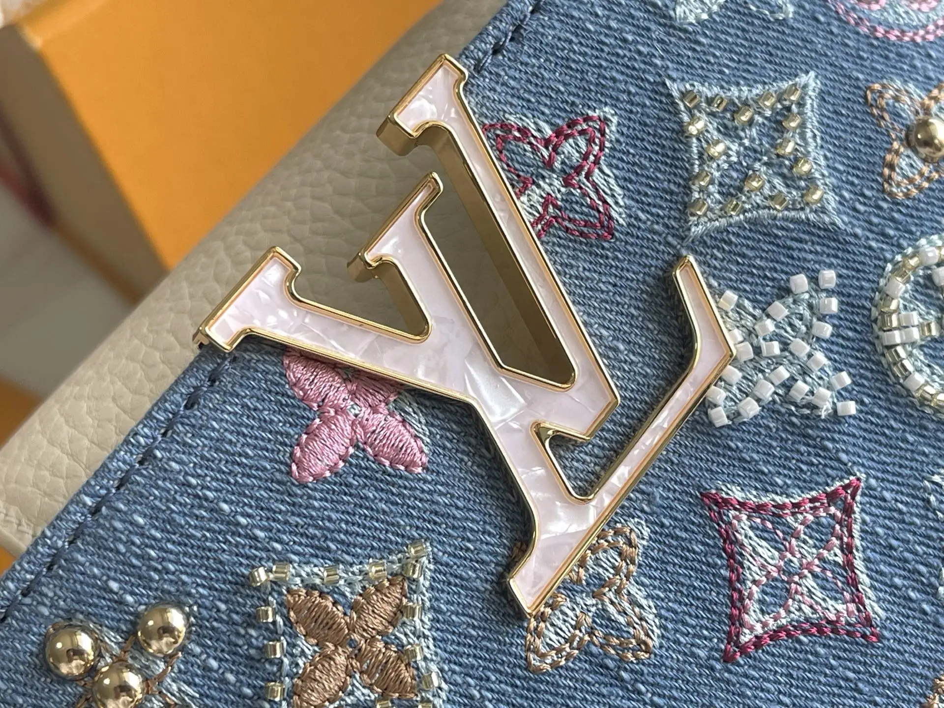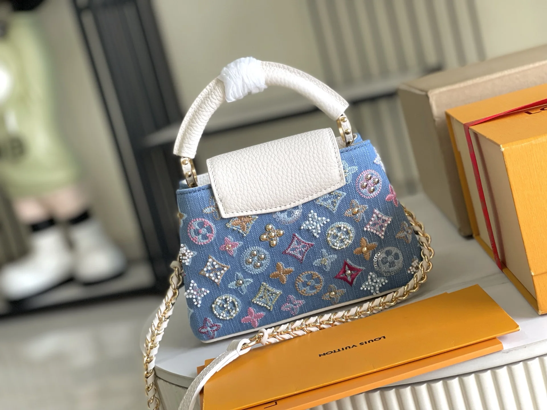 (163 chip) Premium Quality Original Leather M12947 Denim MiniThe Capucines BB handbag tells a new story this season. The exquisite metallic Monogram floral strap adds a softer ch..