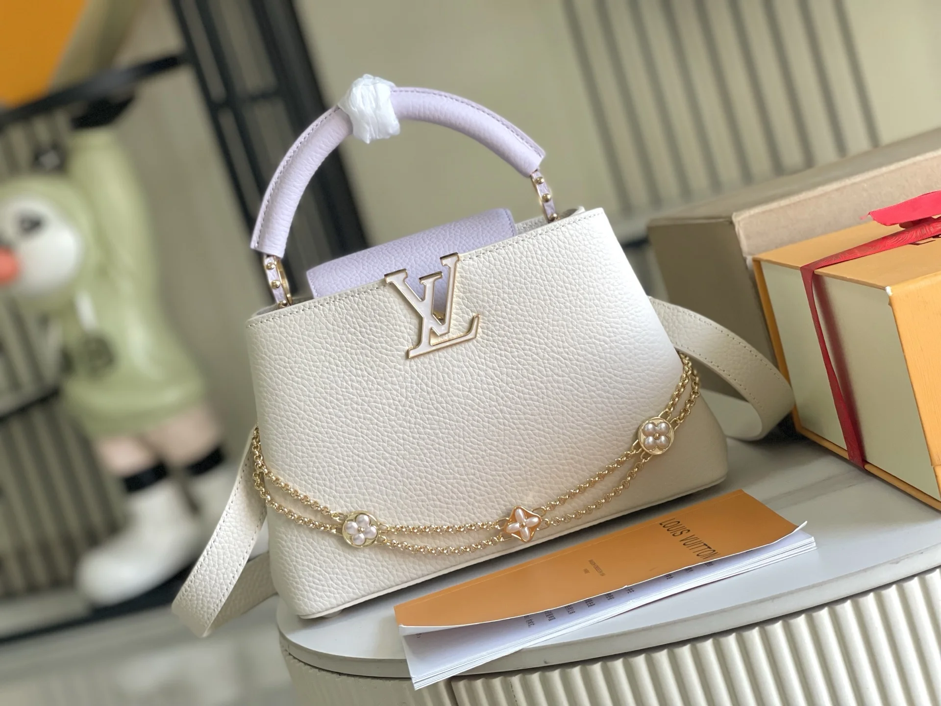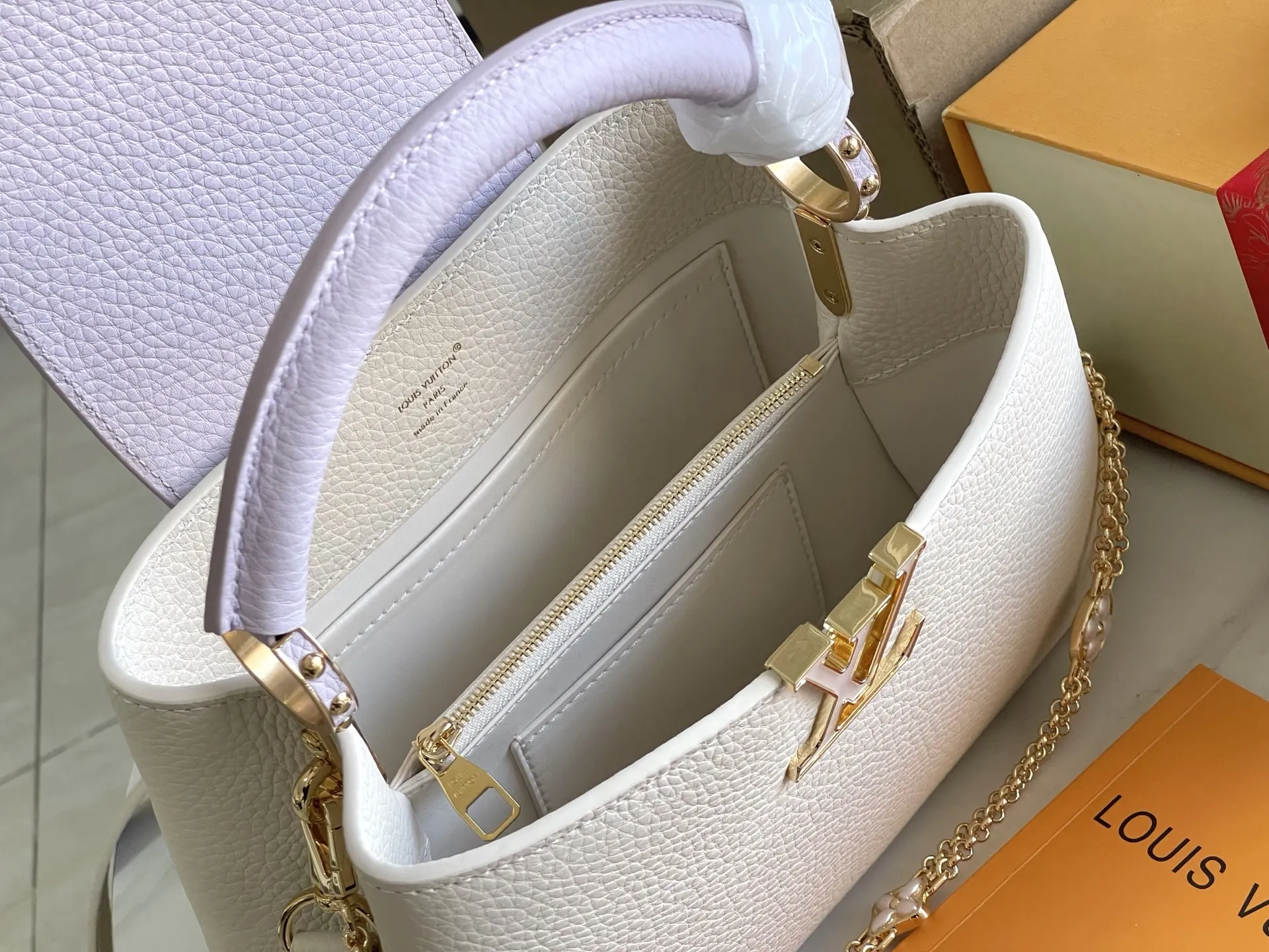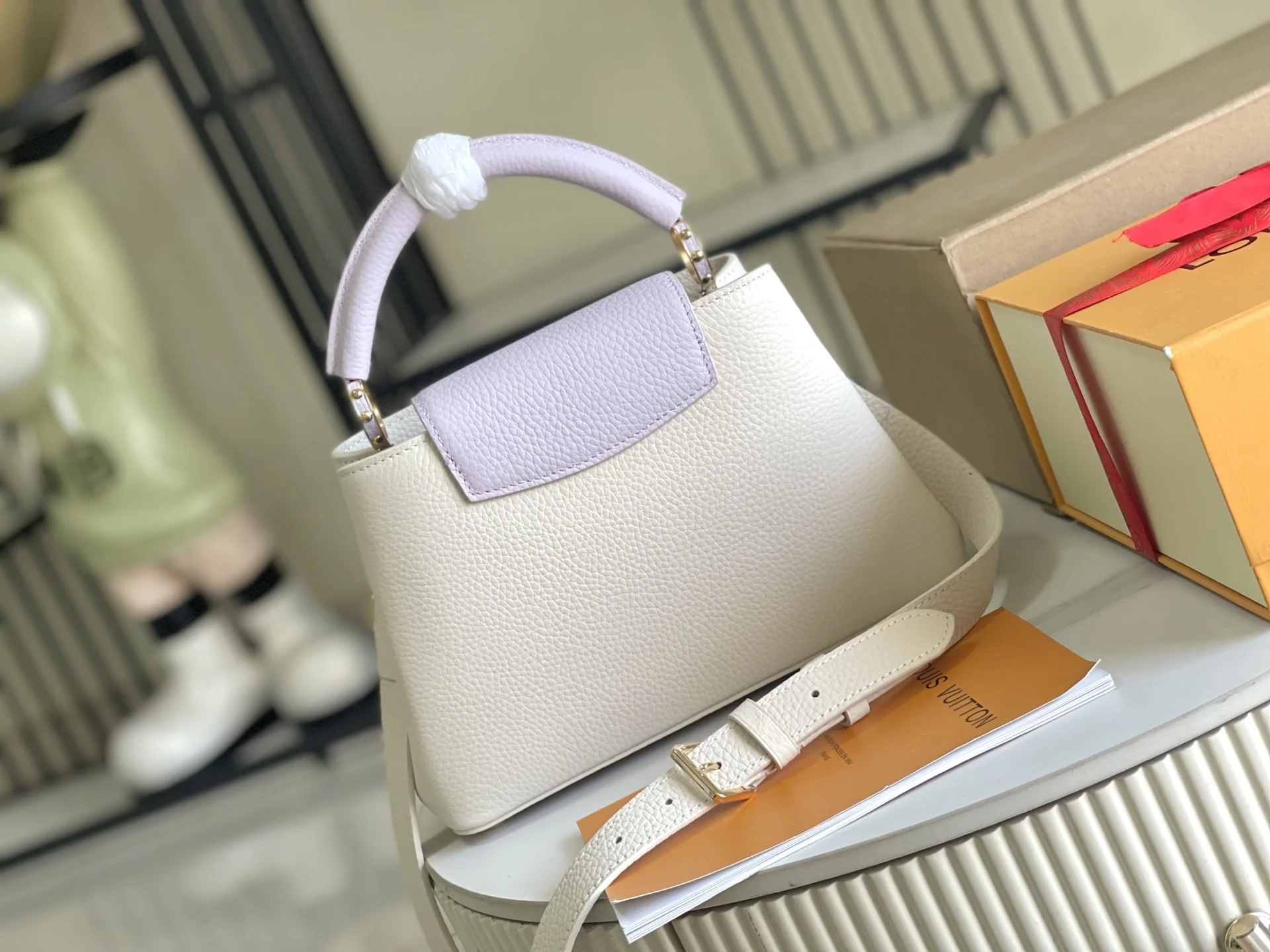 (163 chip) Premium Quality Original Leather M25461 Off-white with Lavender Purple Small Size Upgraded HardwareThis Capucines handbag is made from Taurillon leather, featuring an e..