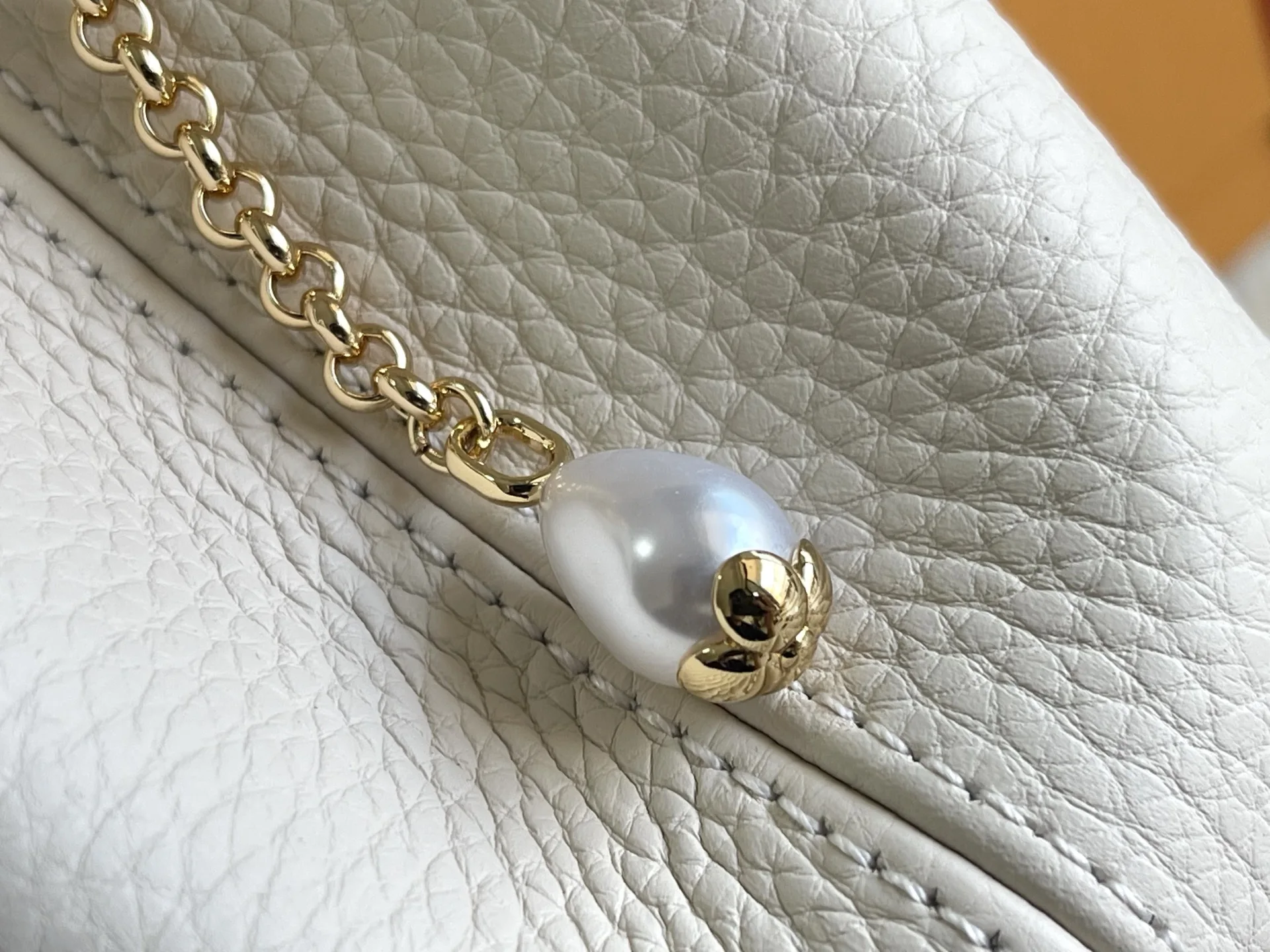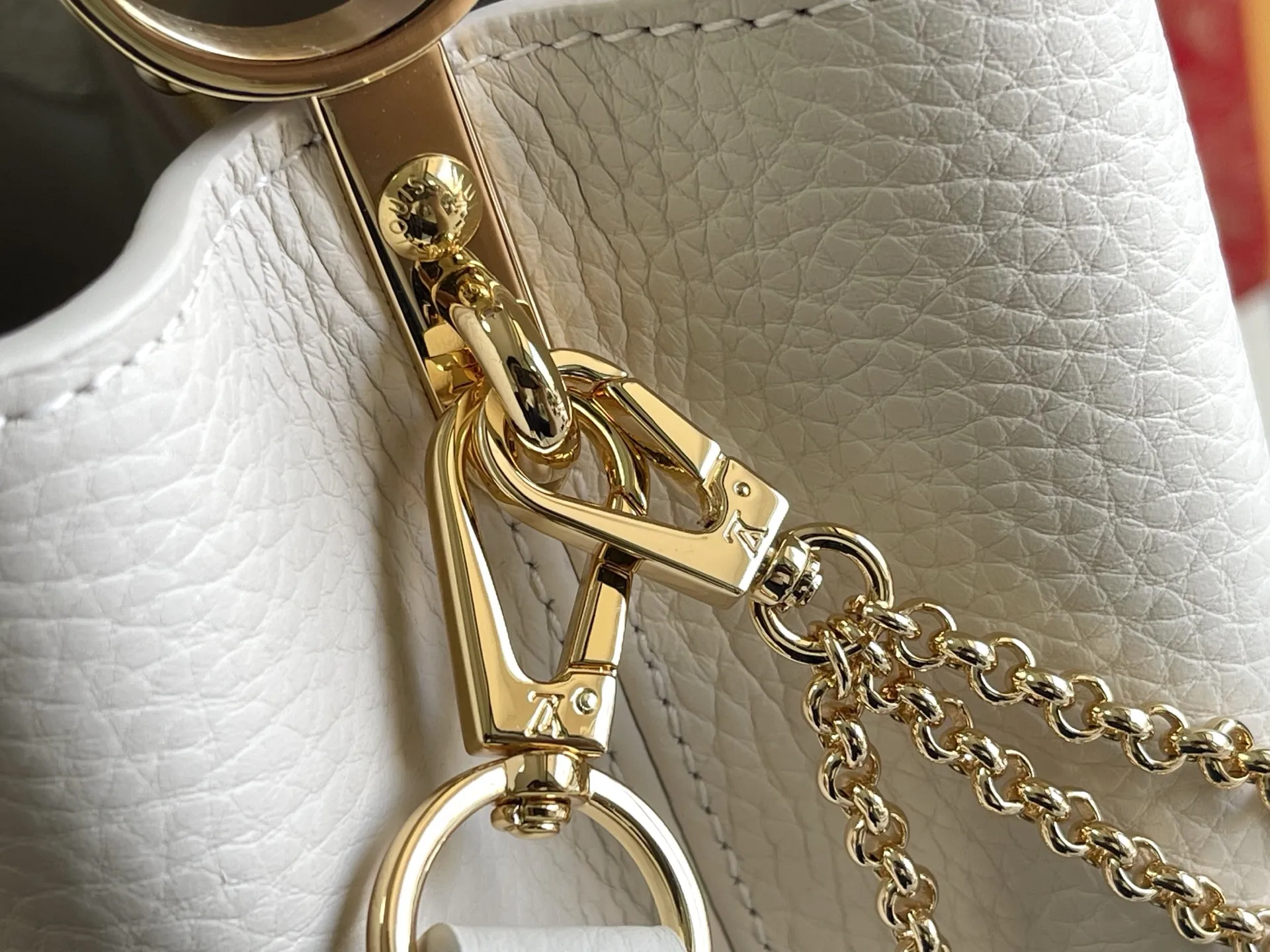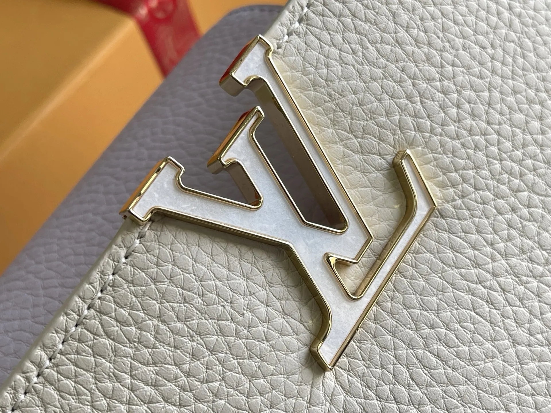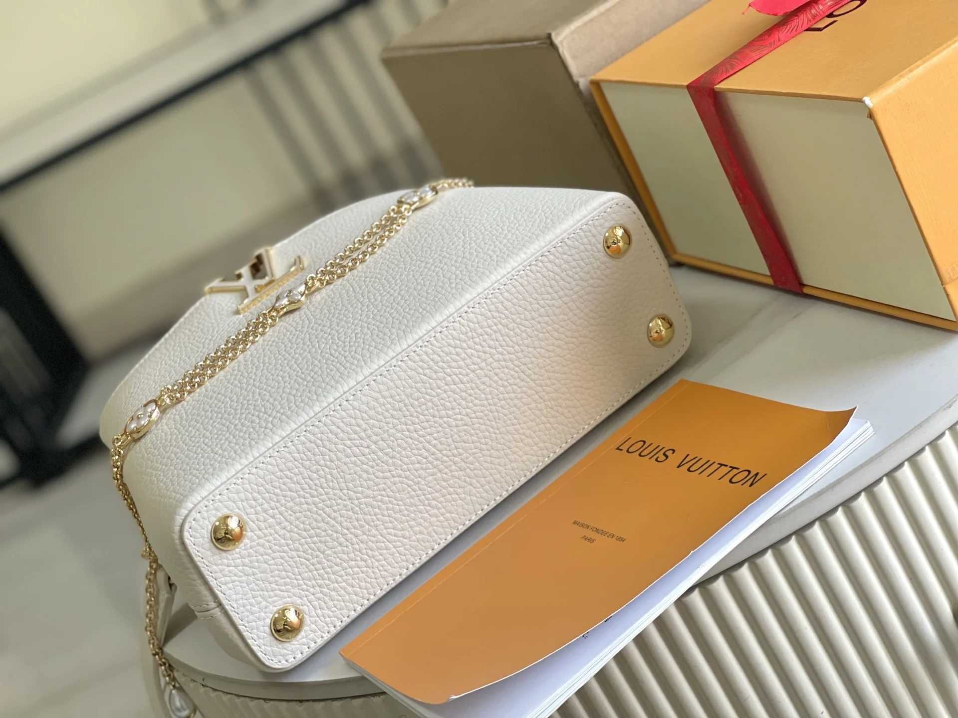 (163 chip) Premium Quality Original Leather M25461 Off-white with Lavender Purple Small Size Upgraded HardwareThis Capucines handbag is made from Taurillon leather, featuring an e..