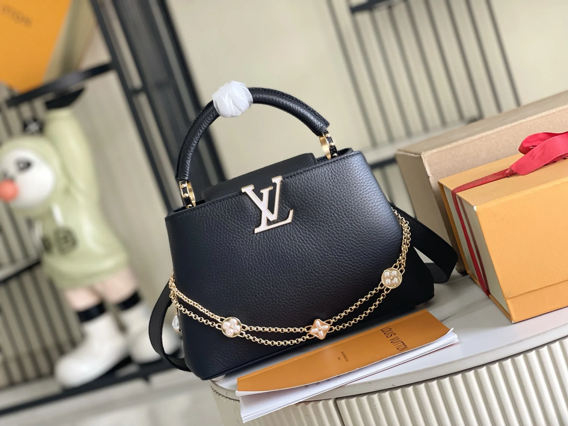 This Capucines handbag is made from Taurillon leather, featuring an enamel Monogram flower cluster and dazzling chain links that form a floral chain. Each flower is hand-polished and glazed to showcase the brand s exquisite craftsmanship. Dimensions: 27 x 18 x 9 cm
