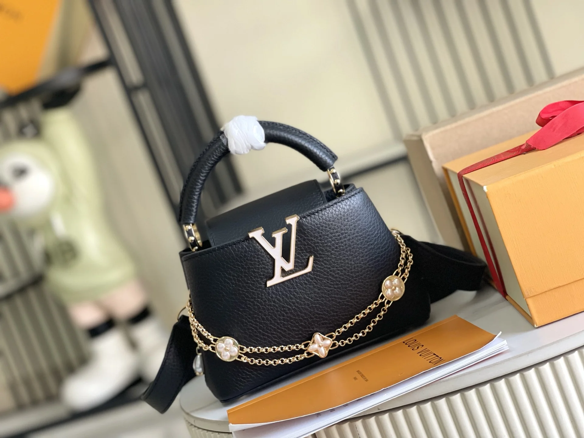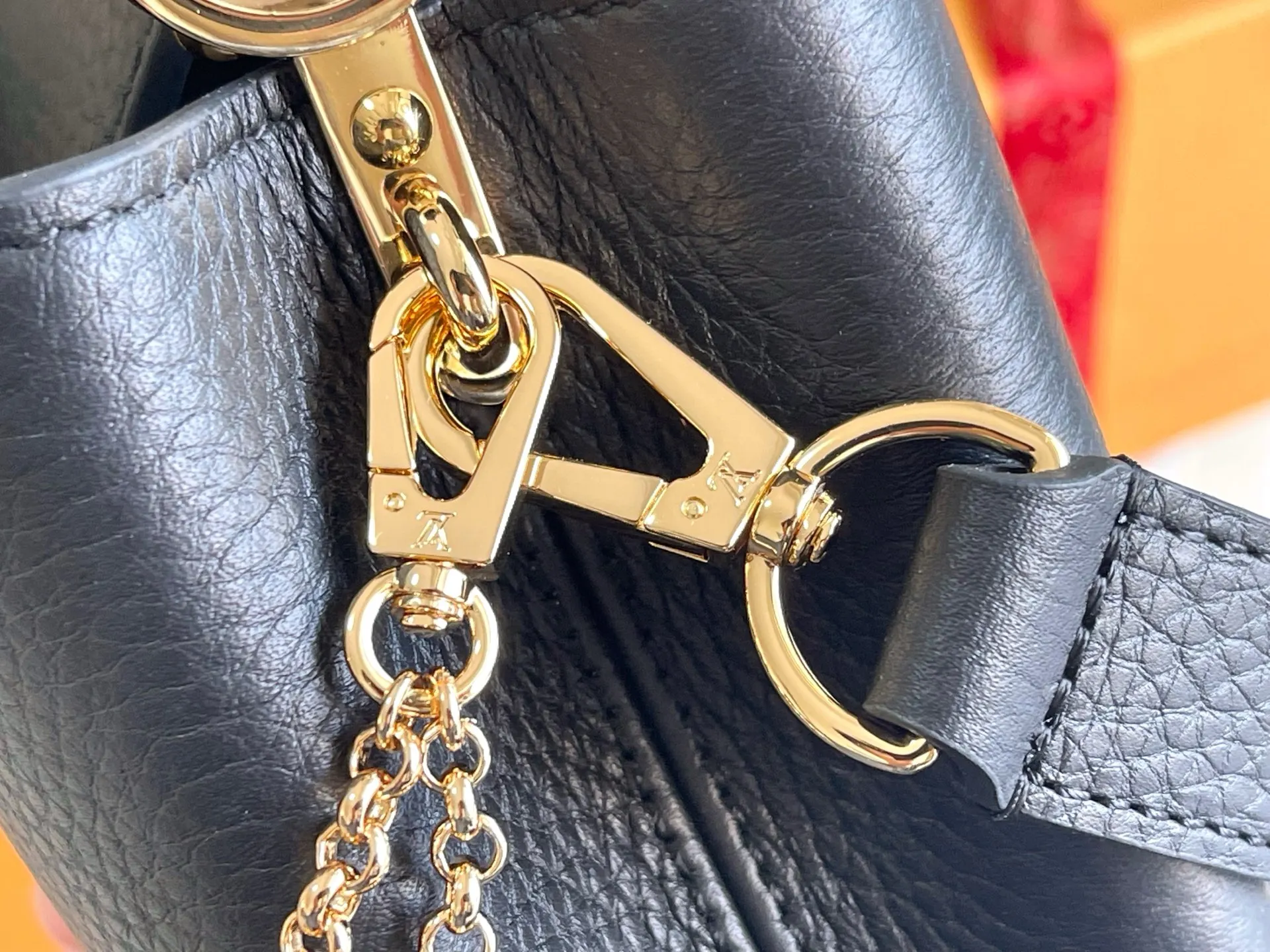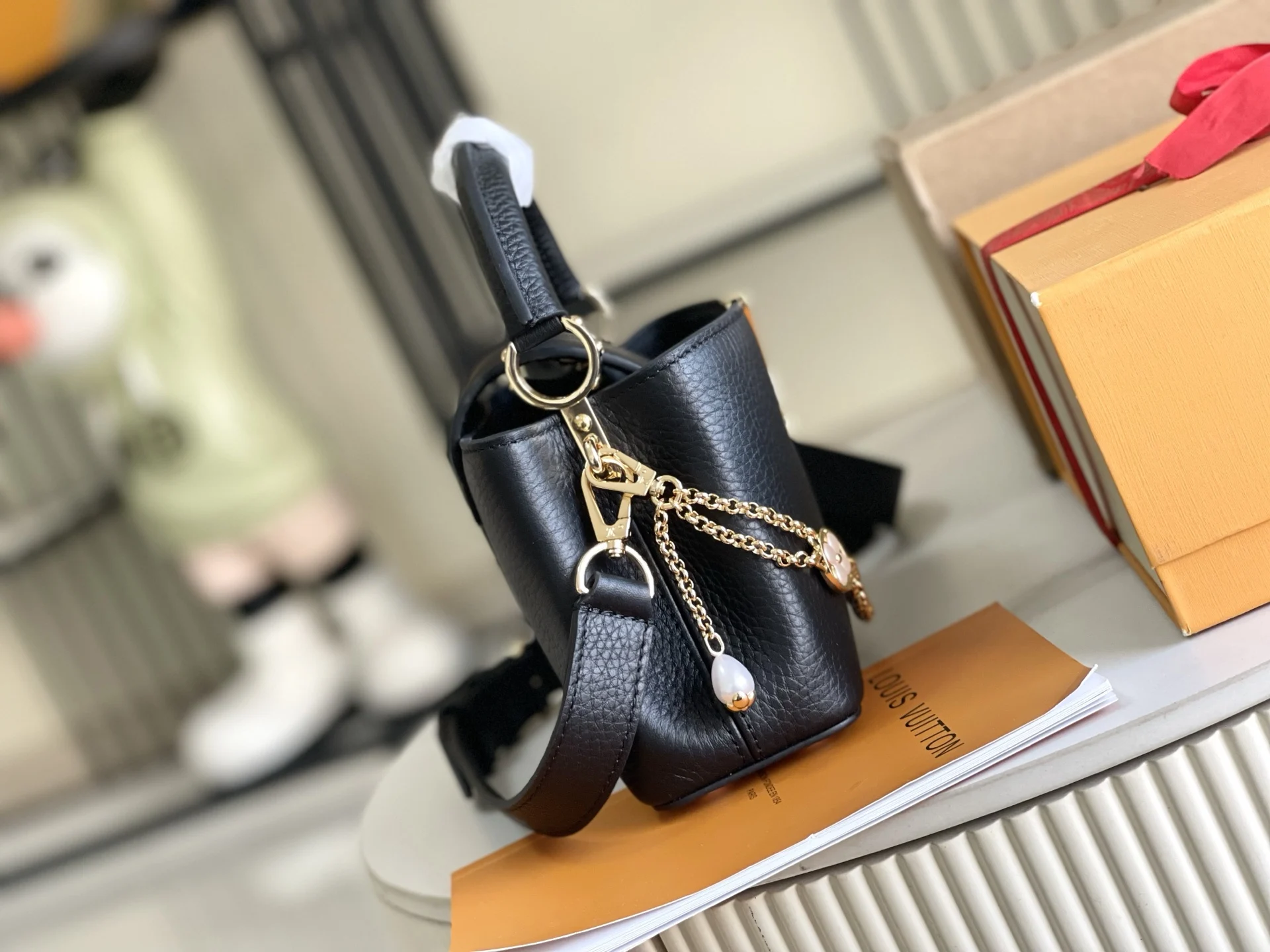 Made from full-grain Taurillon leather, it embodies quiet luxury. The iconic LV signature is crafted from glossy mother-of-pearl, adding a subtle sheen to the piece. The compact size of the bag belies its actual capacity: it can hold two smartphones, a long wallet, and other essentials. Dimensions: 21 x 14 x 8 cm