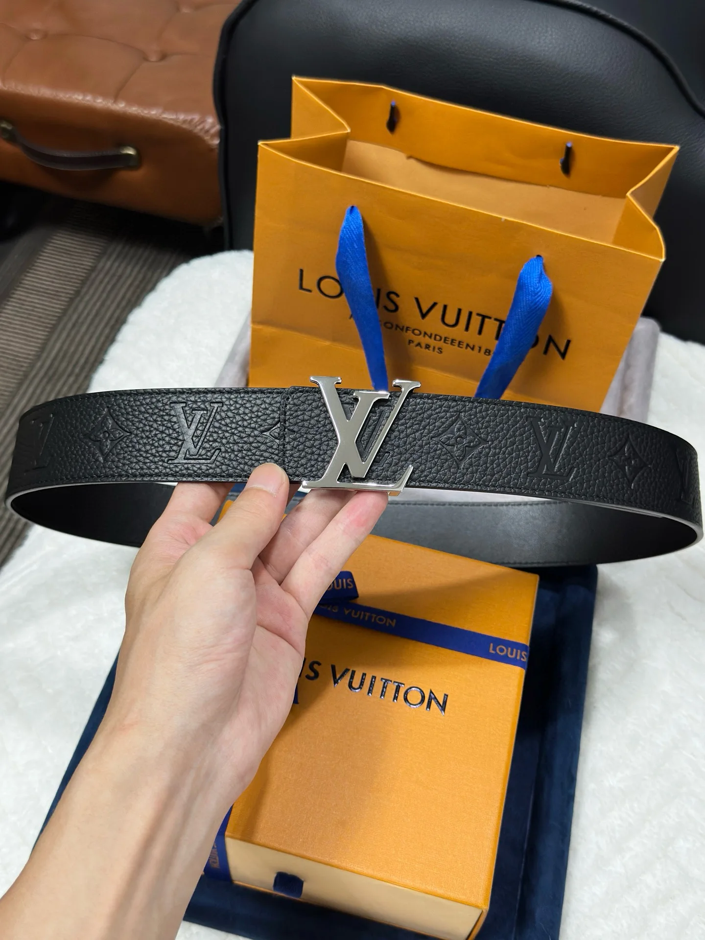 LV. Louis Vuitton Width 40mm Genuine one-piece cast hardware steel buckle Original factory leather Double-sided original factory custom imported fabric Can be used on both sides