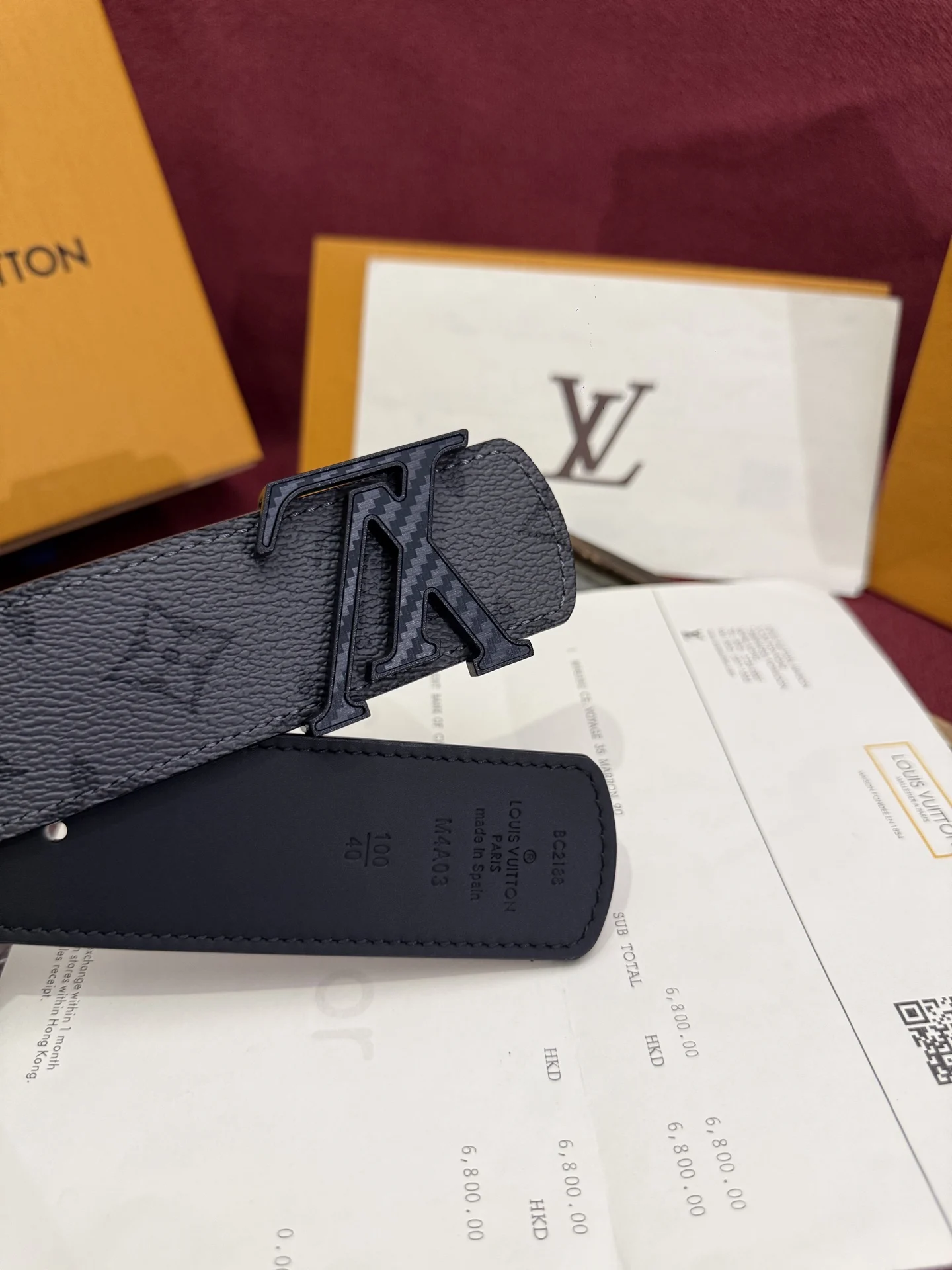 This LV Dimension Monogram Midnight 40mm reversible belt presents a bold and avant-garde monochromatic modern style. One side features Monogram canvas, while the other is made of smooth leather, adorned with an architecturally inspired iconic LV buckle. The combination of materials, harmonized in color, enhances its sophistication, adding a unique charm to both casual and formal outfits.