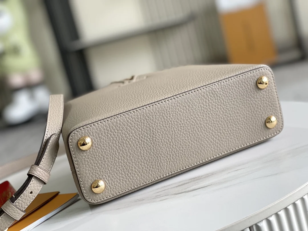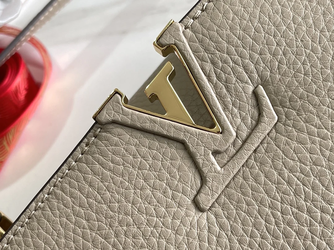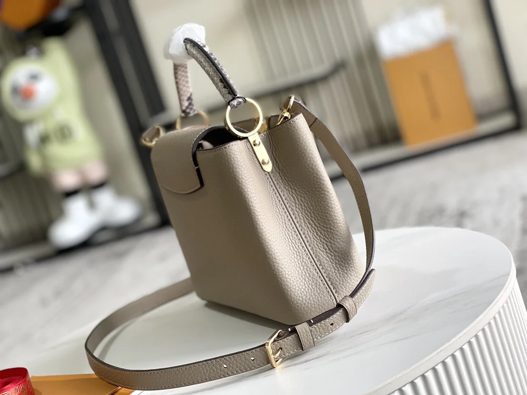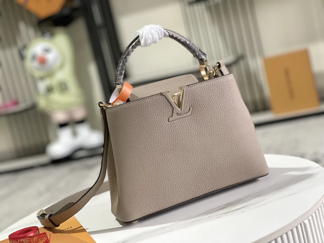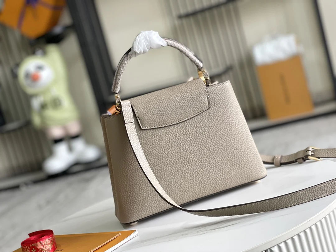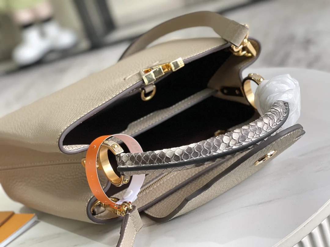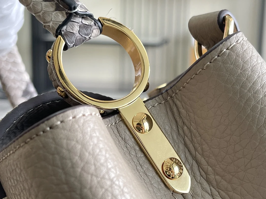 (163 chip) Premium original leather M92802 N92041 elephant gray with python gold buckle This Capucines BB handbag features a classic silhouette crafted from full-grain Taurillon le..