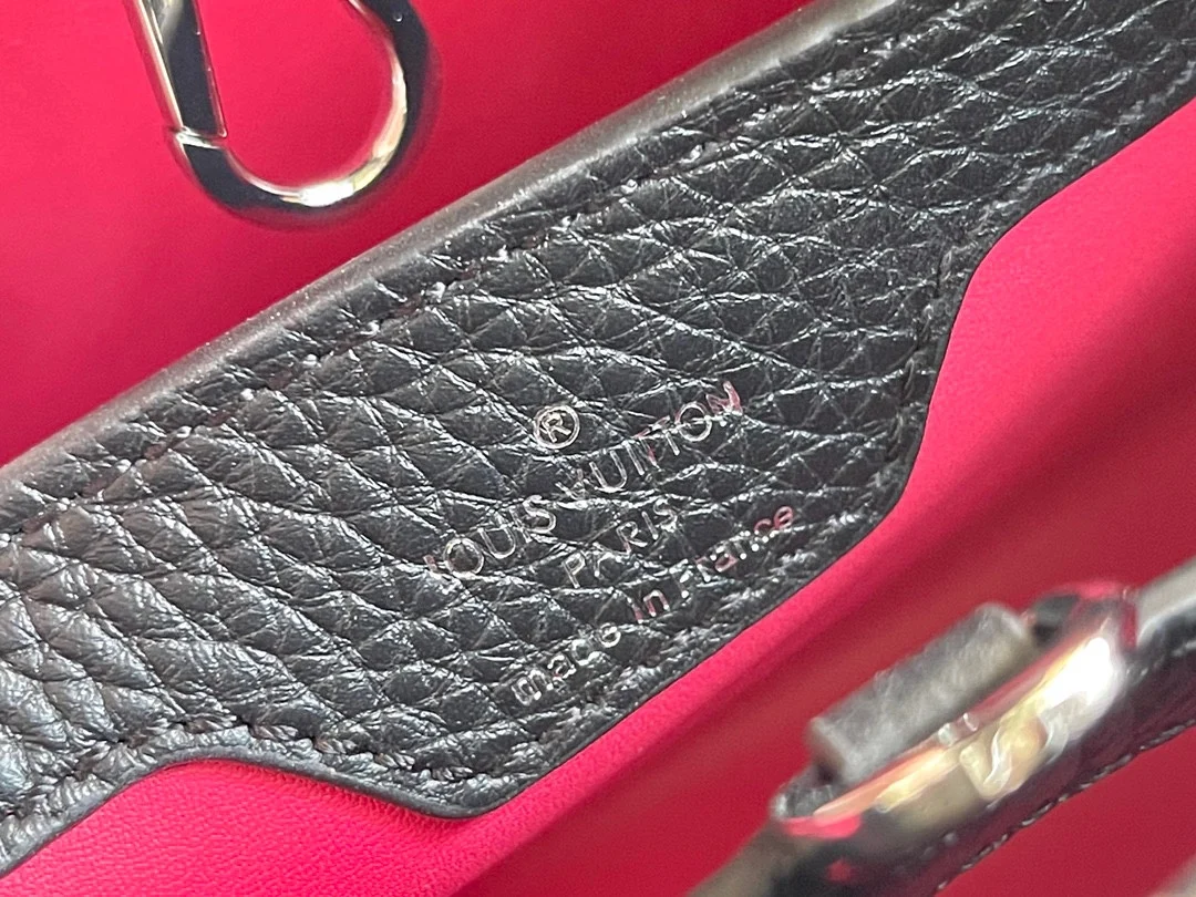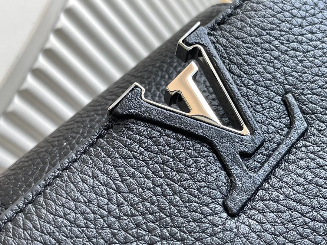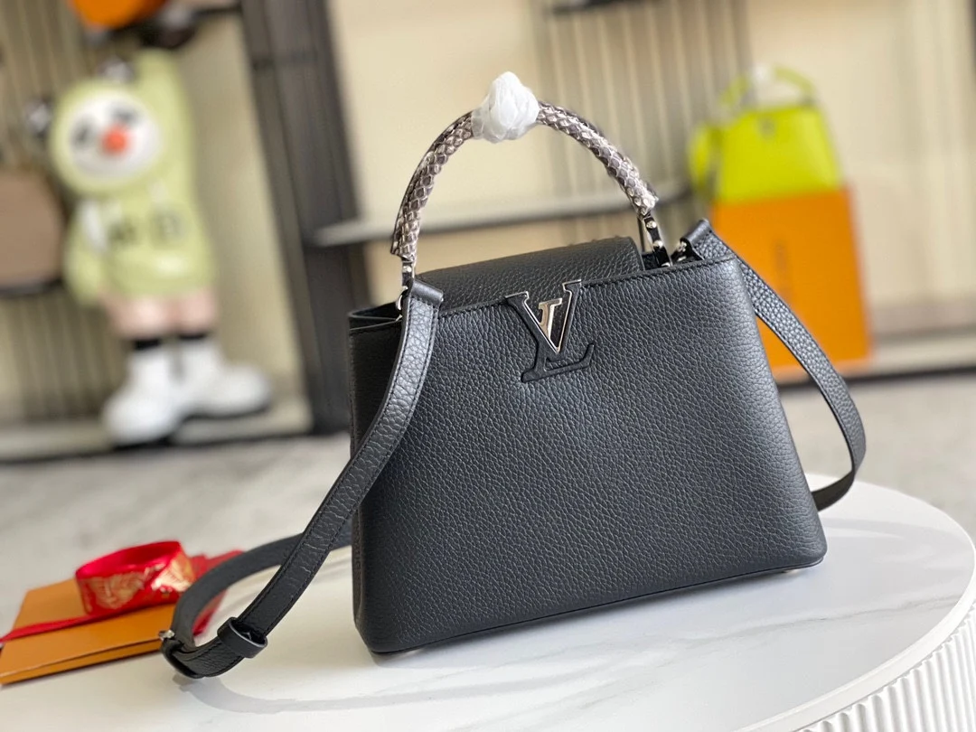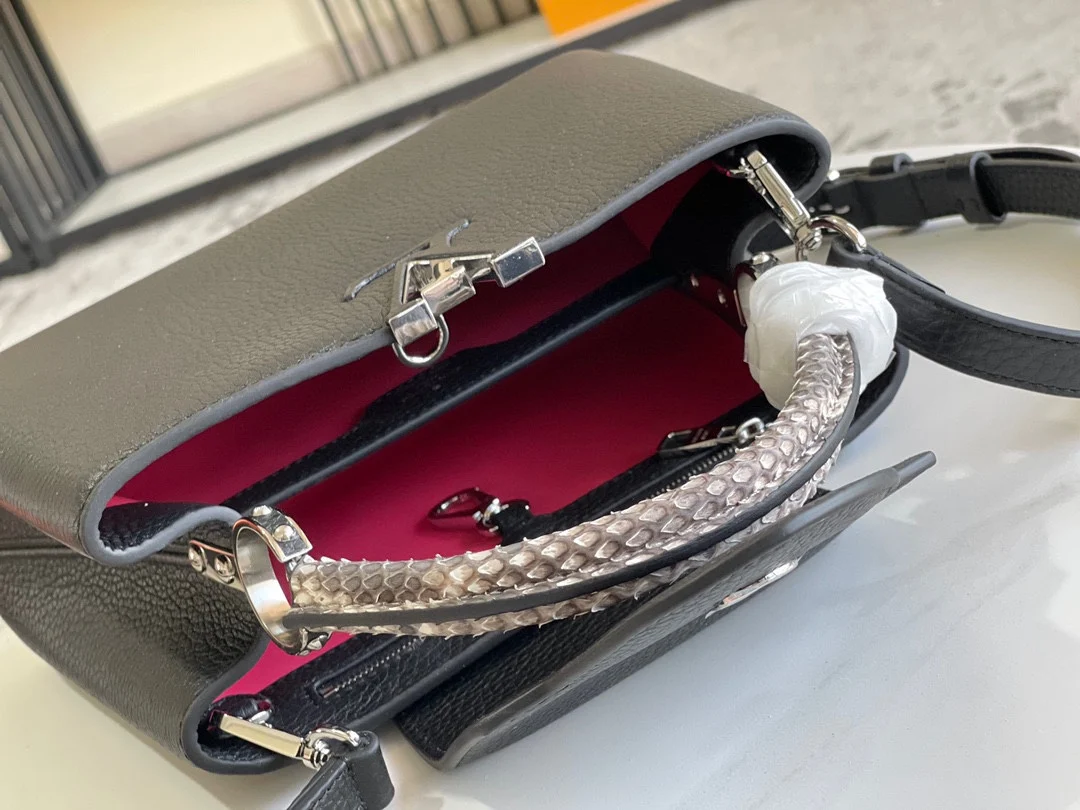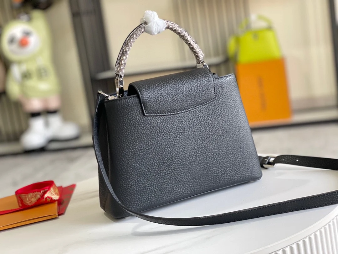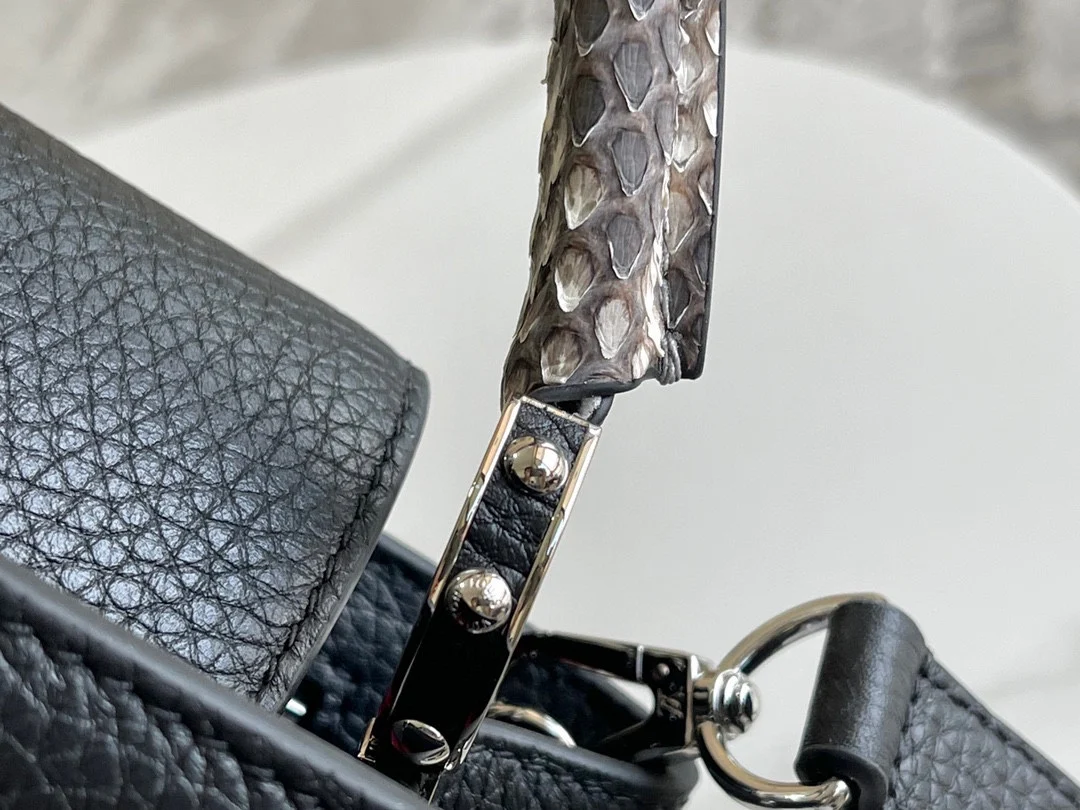 (163 chip) Premium Original Leather M92800 N92041 Black with Python Silver Buckle This Capucines BB handbag features a classic silhouette crafted from full-grain Taurillon leather..