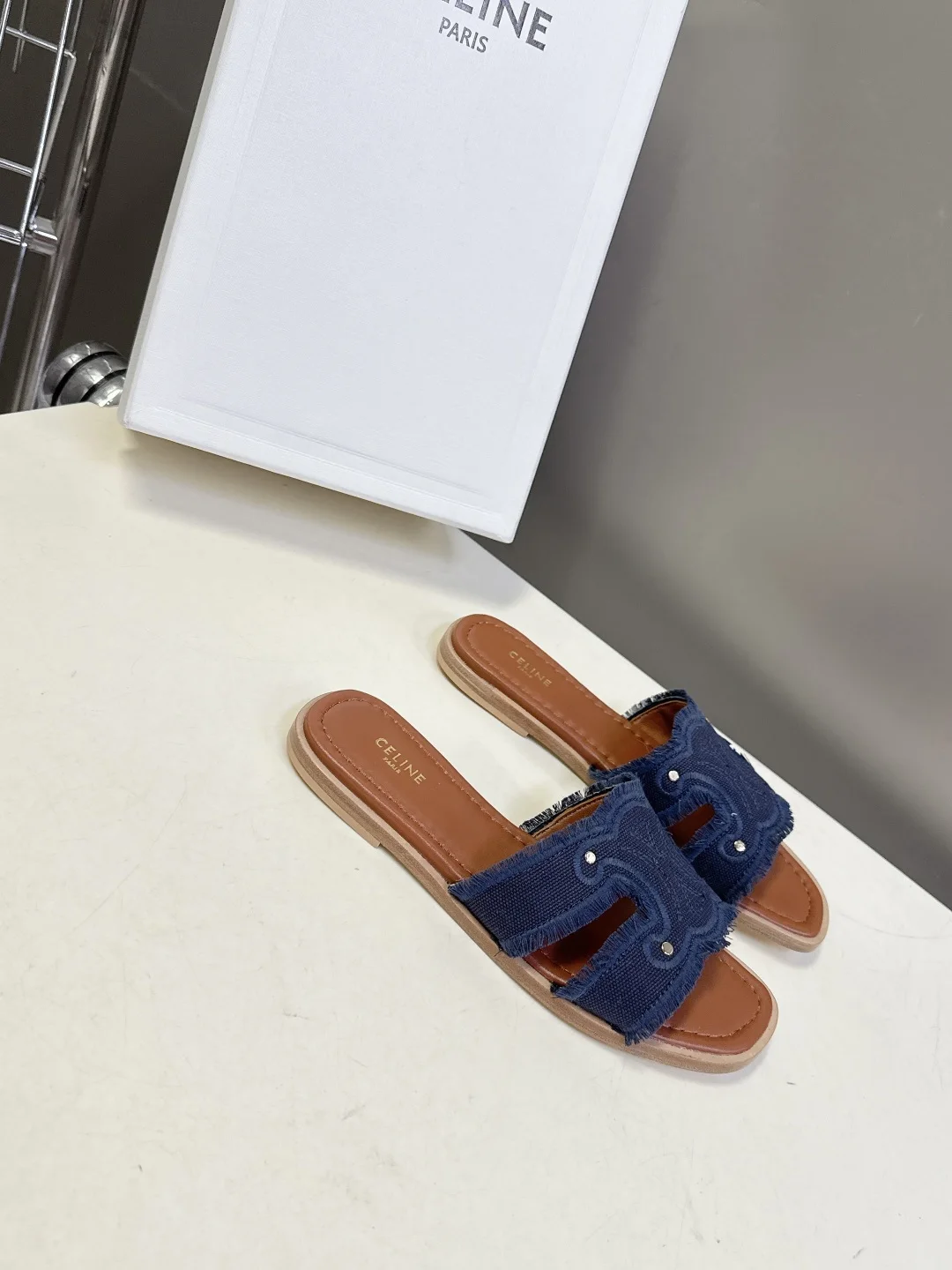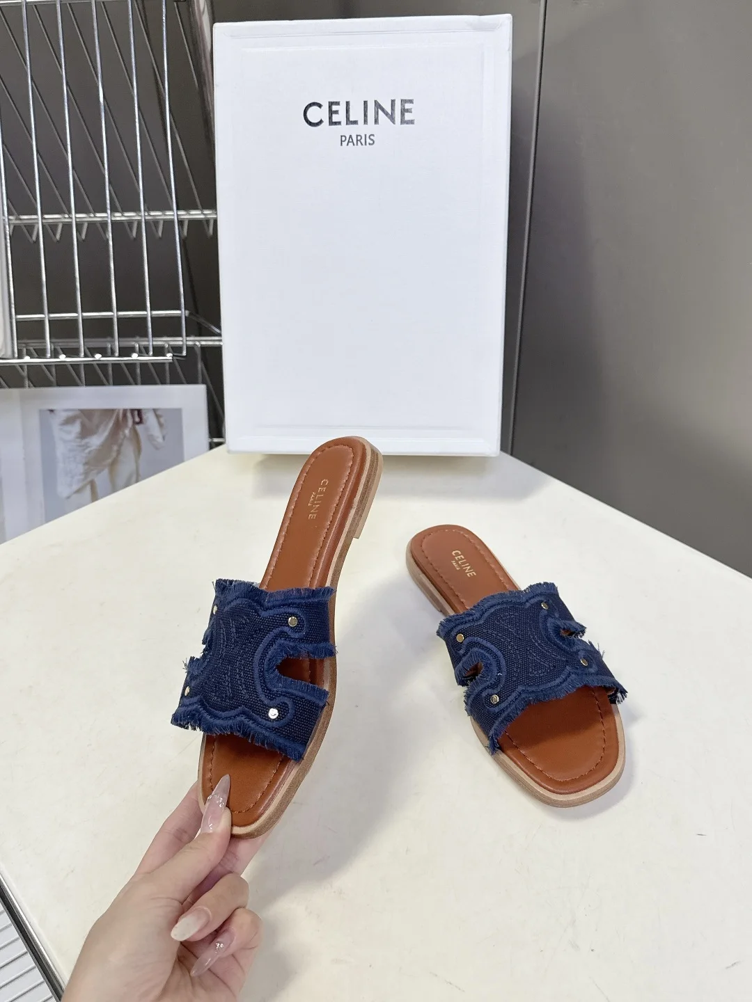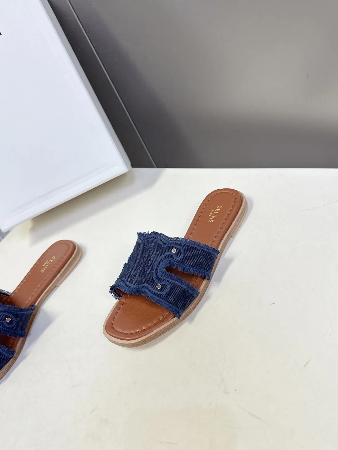 Celine Spring/Summer latest retro Arc de Triomphe fashionable slippers, absolutely original purchase development, still the highest output restoring the original customized washed denim material, inner leather, original mold genuine leather outsole with anti-slip bottom plate Size: 35-40
