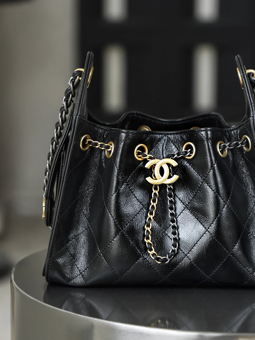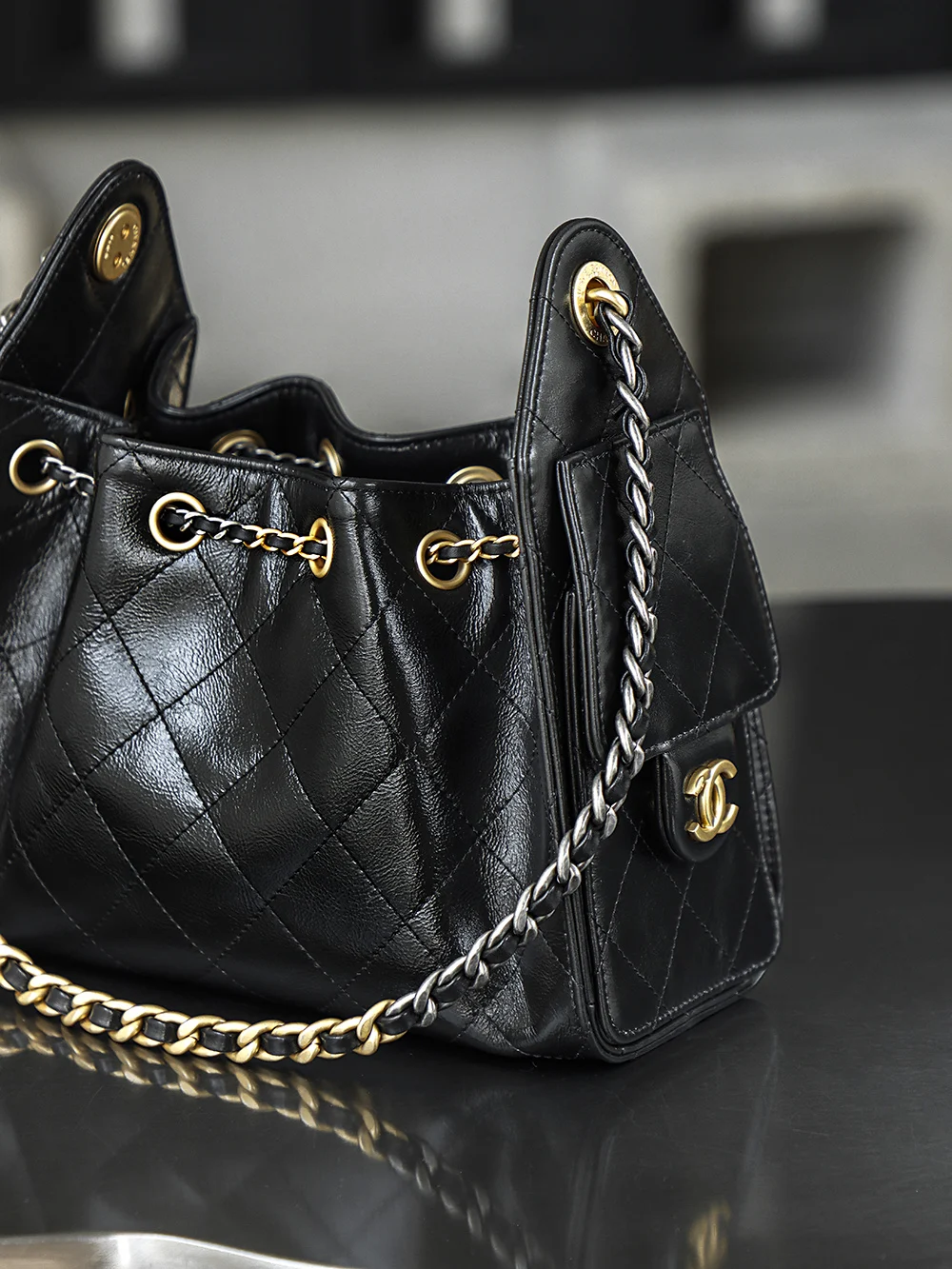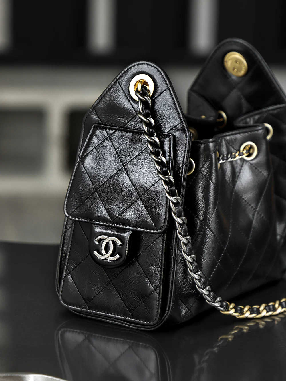 Premium Original Factory 26C 25bag Mini Premium Edition 26C New Season Oiled Wax Leather, with a breathtaking high gloss, the first sight of this 25bag mini black gold strikes the heart, featuring a Yin-Yang Design interwoven with gold and silver, one chain with two styles: gold - vintage luxury, silver - cool and fashionable!