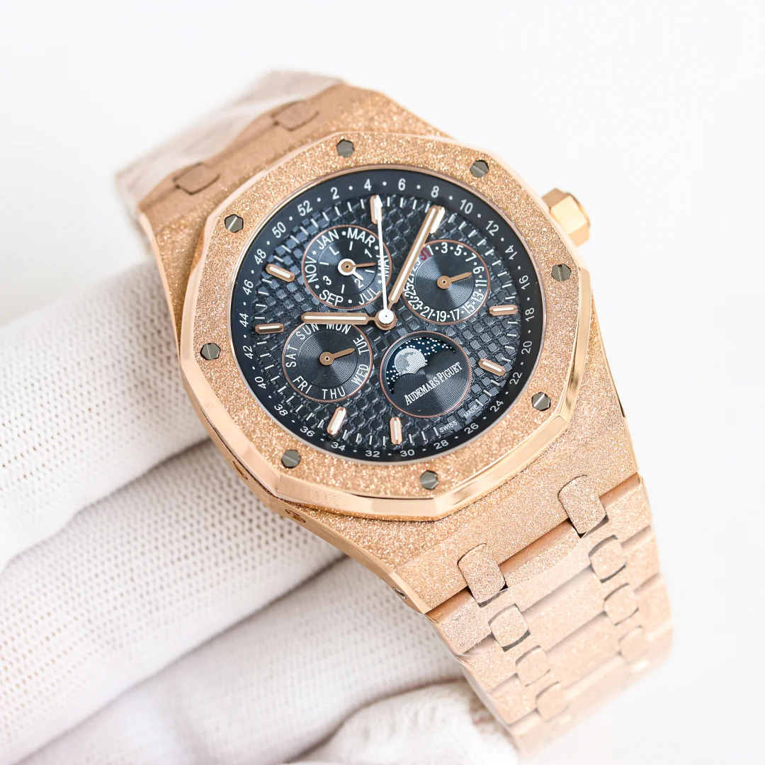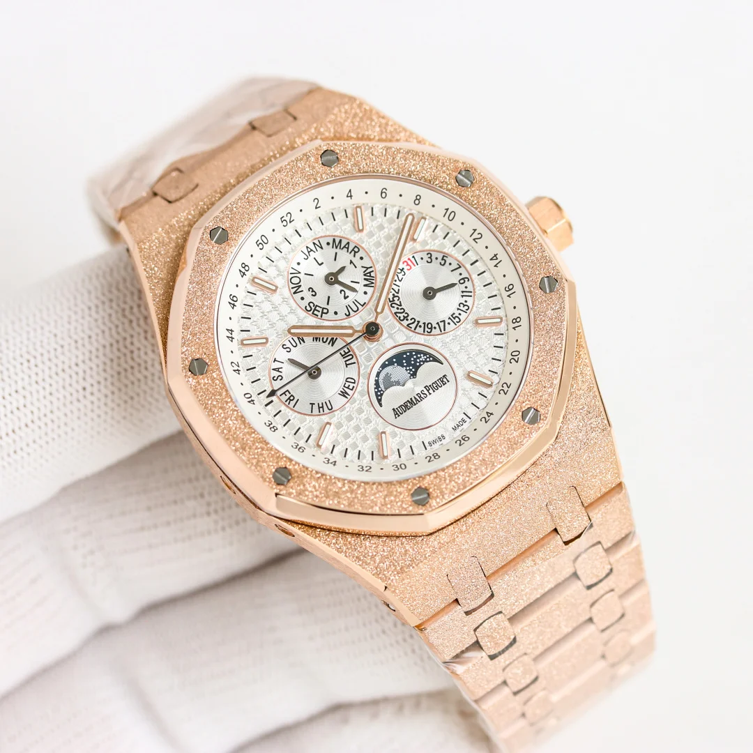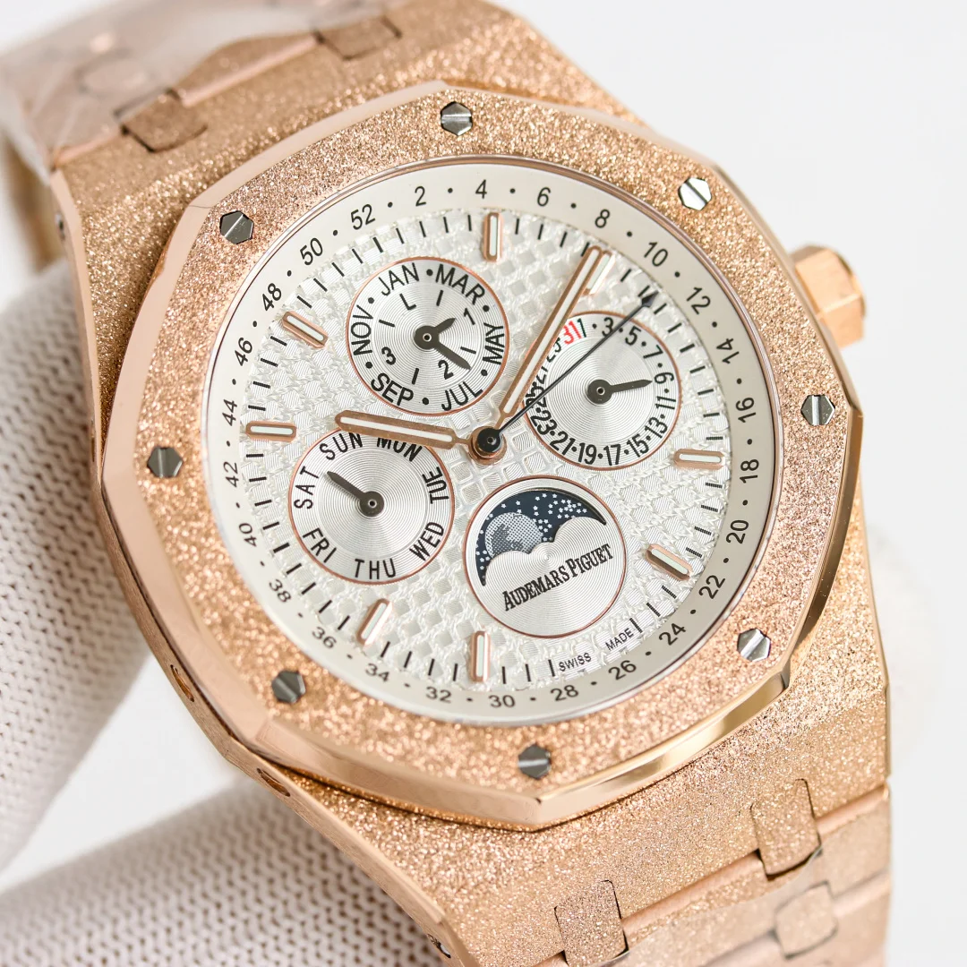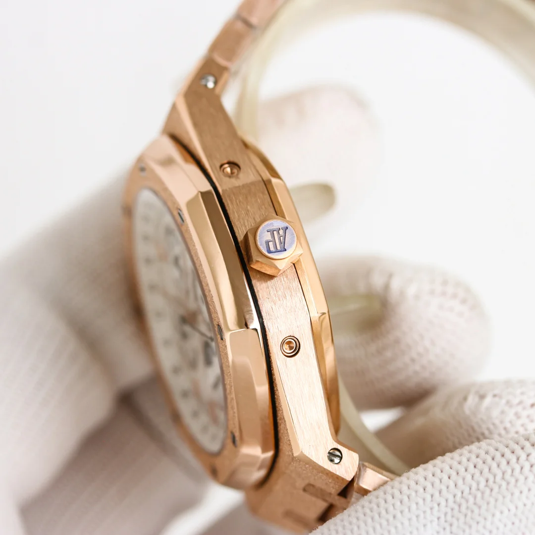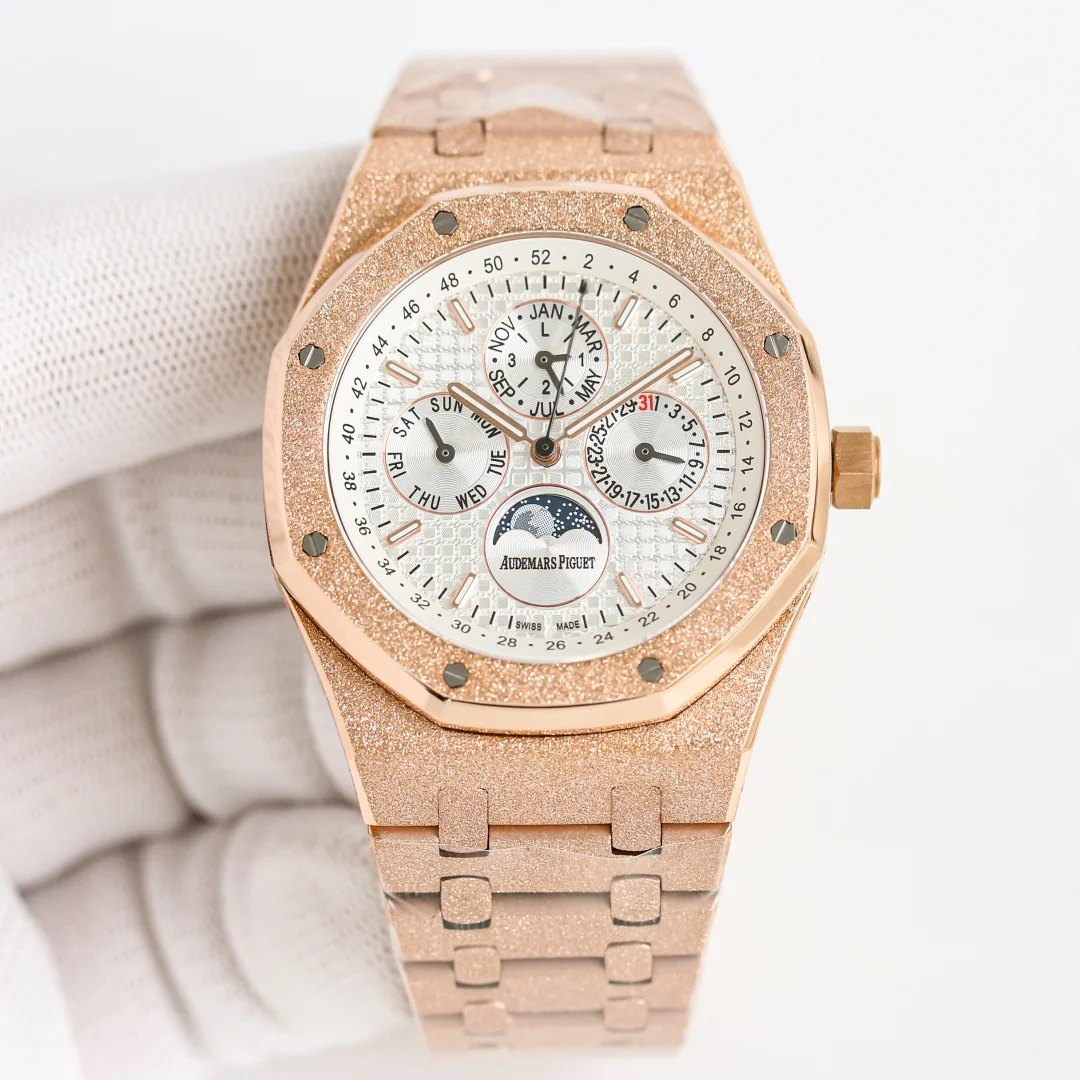 Sun Production White Shell TWA-AP Audemars Piguet Royal Oak R68 Frosted Gold Version, 41mm King of Steel Audemars Piguet 26574 Series (Frosted Gold Custom Edition), the most important aspect of the steel watch is the bracelet. The TWA factory uses original bracelet molds to create a delicate brushed texture that is not sharp and won t cut the hand. The thickness and joints of the bracelet are consistent with the original, merging quality and beauty! Sun Production highly recommends this exquisite multifunctional mechanical watch for men.