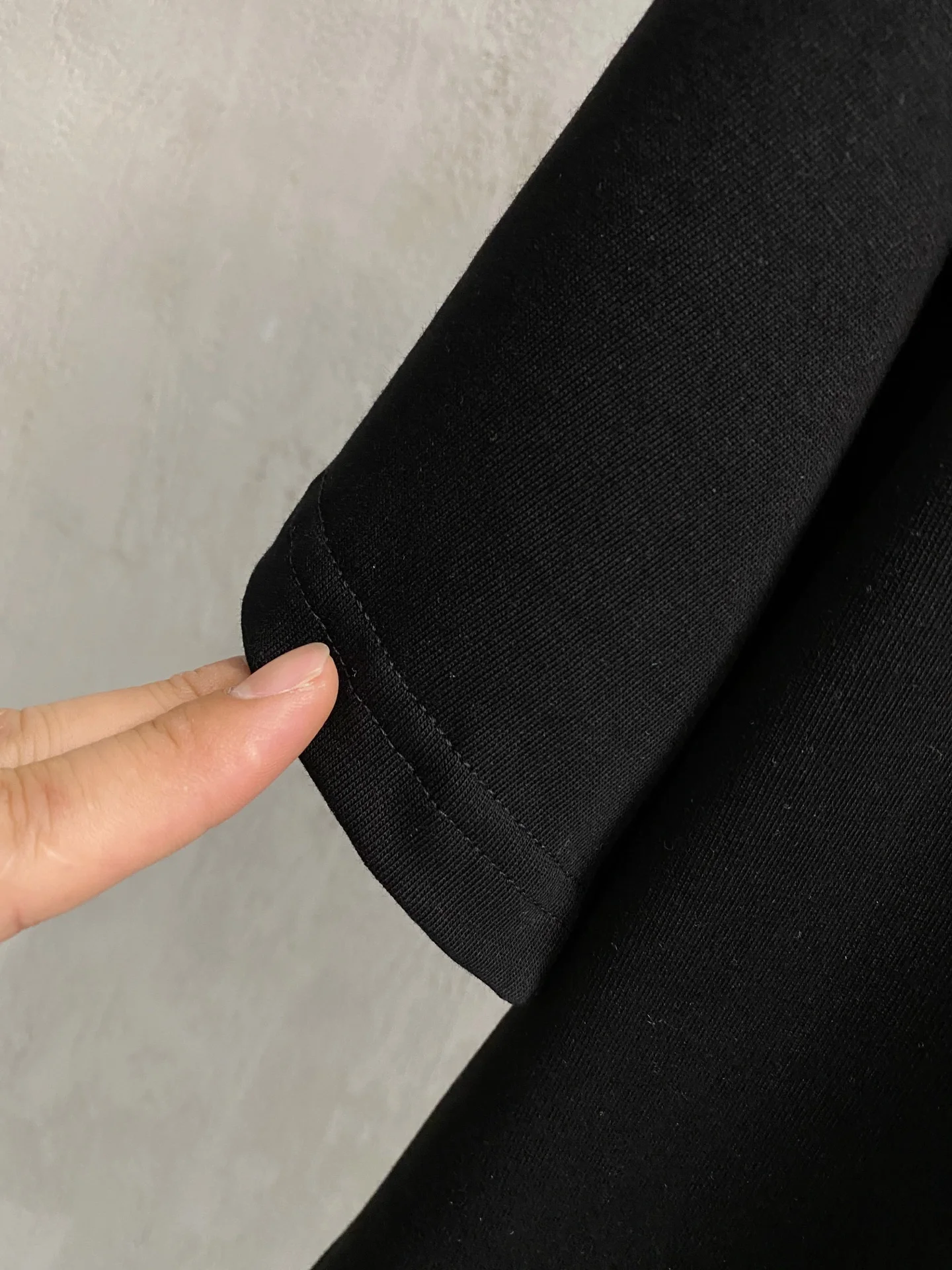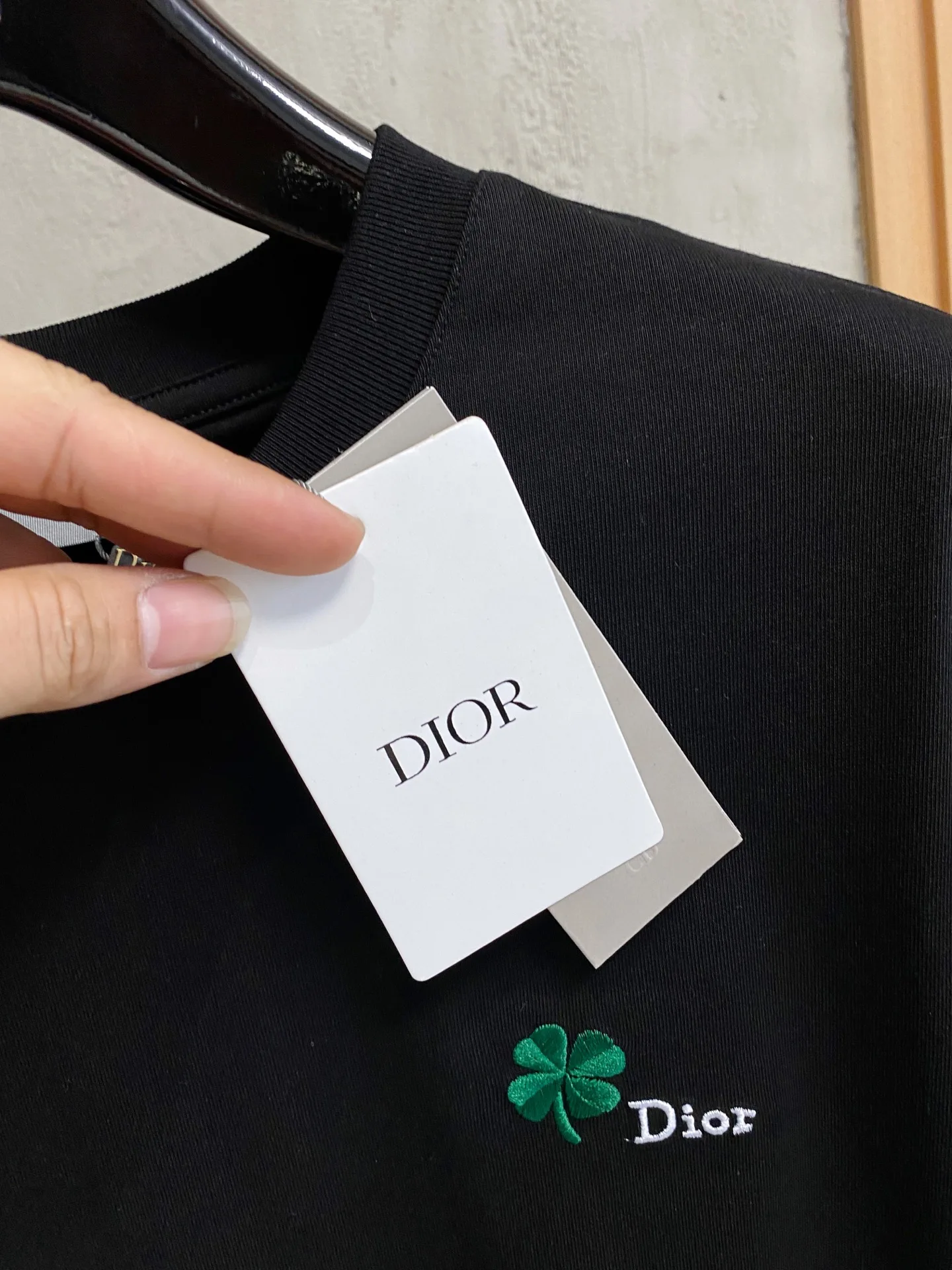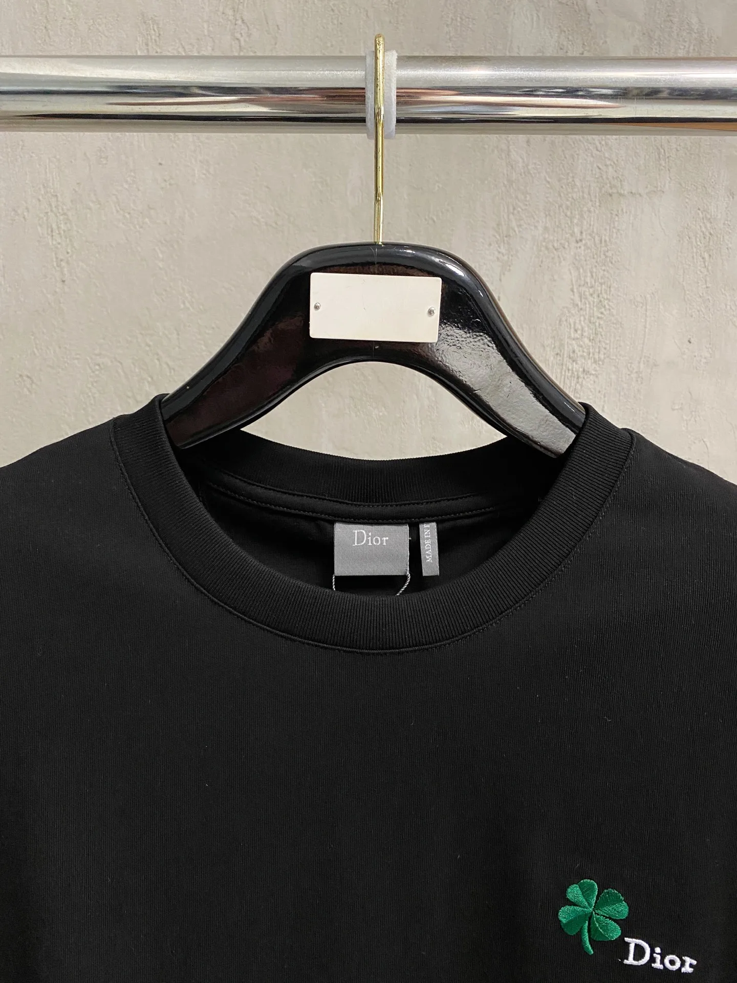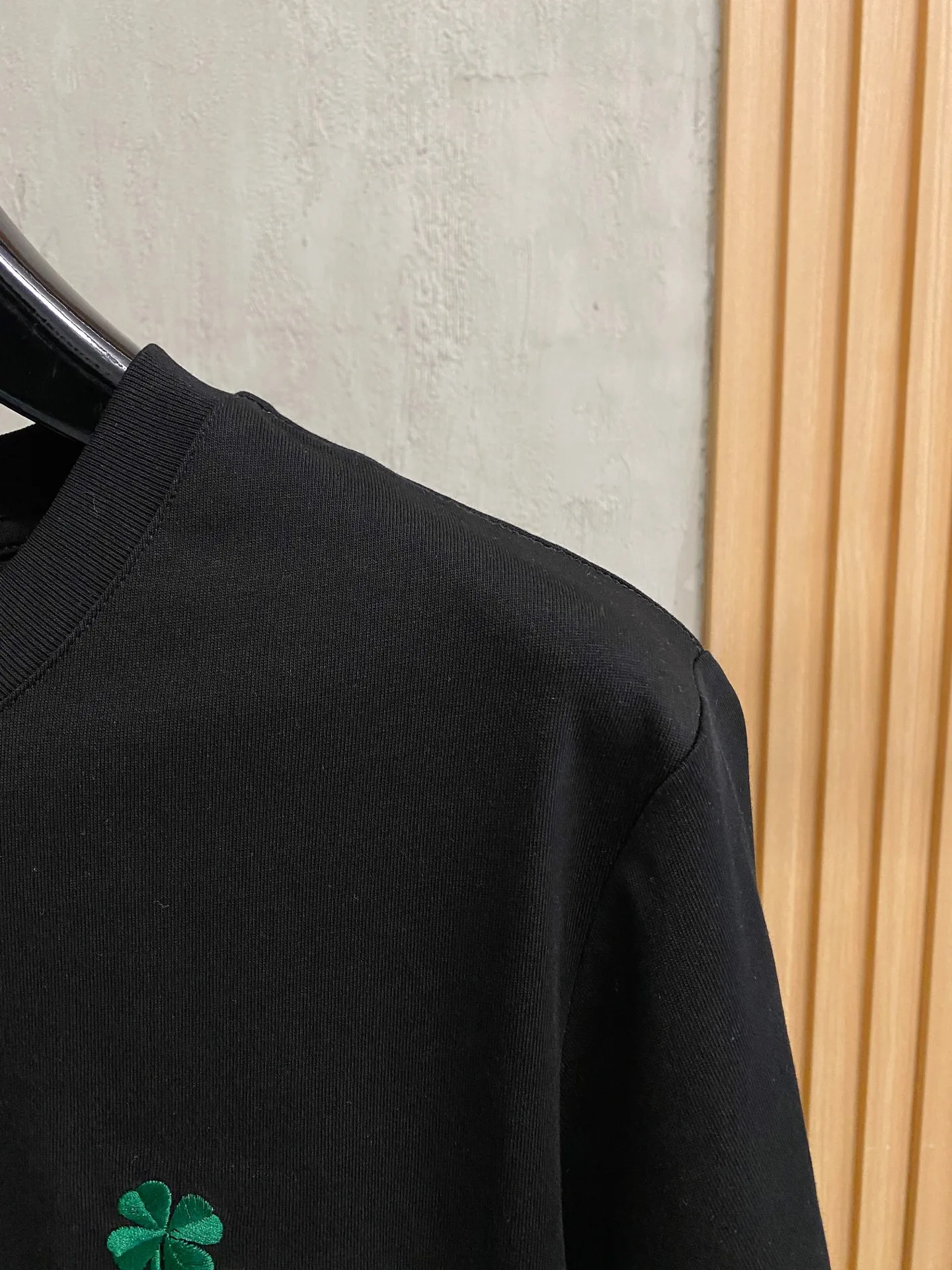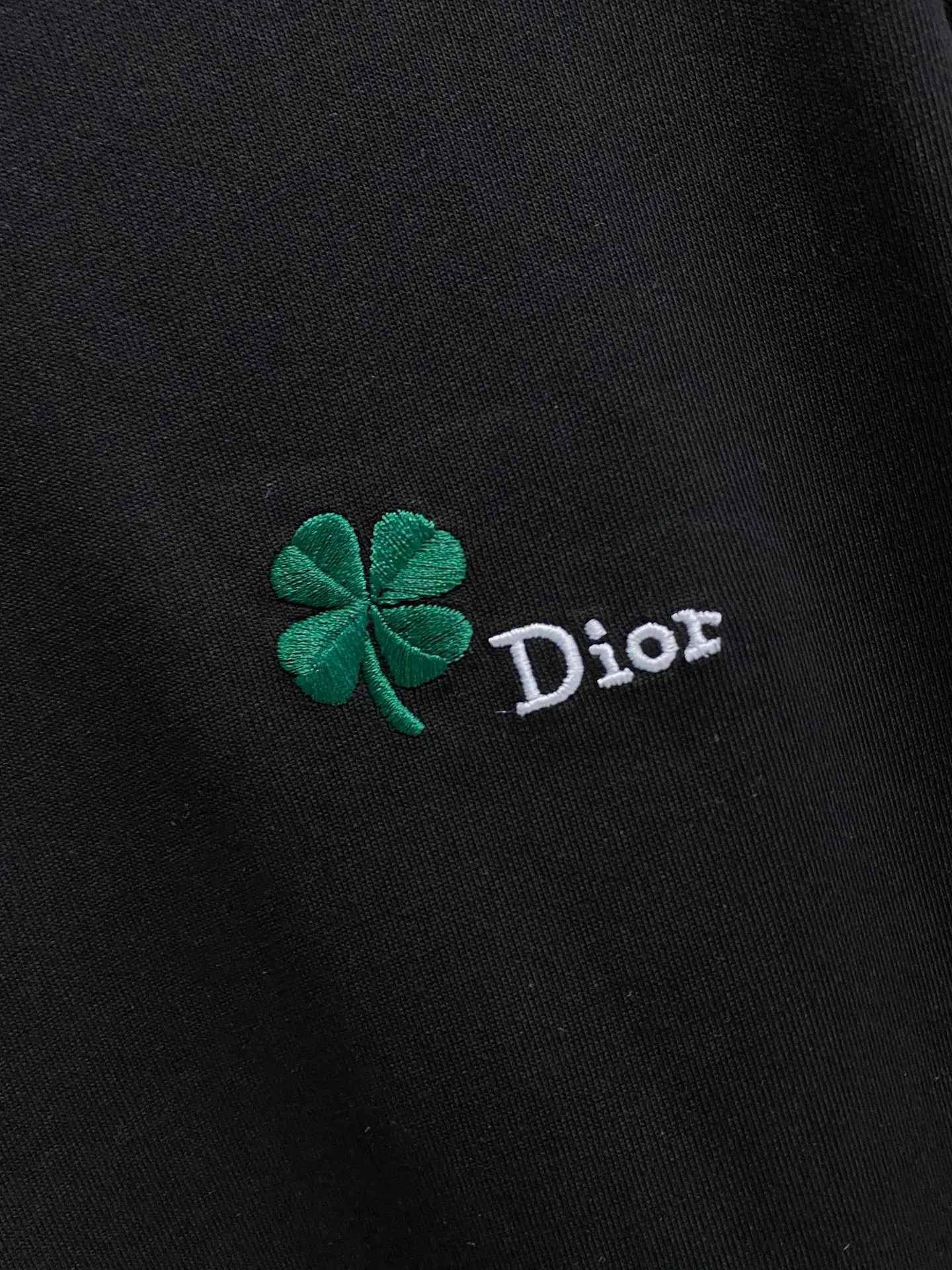 Description: This black short-sleeve T-shirt is made from high-count double-ply combed cotton blend fabric, featuring a high-elastic ribbed neckline with a three-needle binding technique that prevents loosening and curling after repeated wear; the side seams of the garment utilize a double-needle hidden stitch technique, ensuring neat and secure stitching to reduce skin friction. The green clover pattern distributed across the garment is crafted with precision embroidery, with dense and even stitches, resulting in a three-dimensional and full design that is not prone to unraveling; the finished product undergoes multiple quality control processes including needle inspection, ironing, and stain removal. The fit is relaxed yet tailored, suitable for various occasions such as casual outings and dates, combining exquisite details with practicality. The overall stitching is straight and delicate, the fabric is comfortable and soft, and the color is consistent with no color difference, allowing for stylish combinations with similar items, adaptable to various settings, with custom accessories and complete labeling for both men and women!