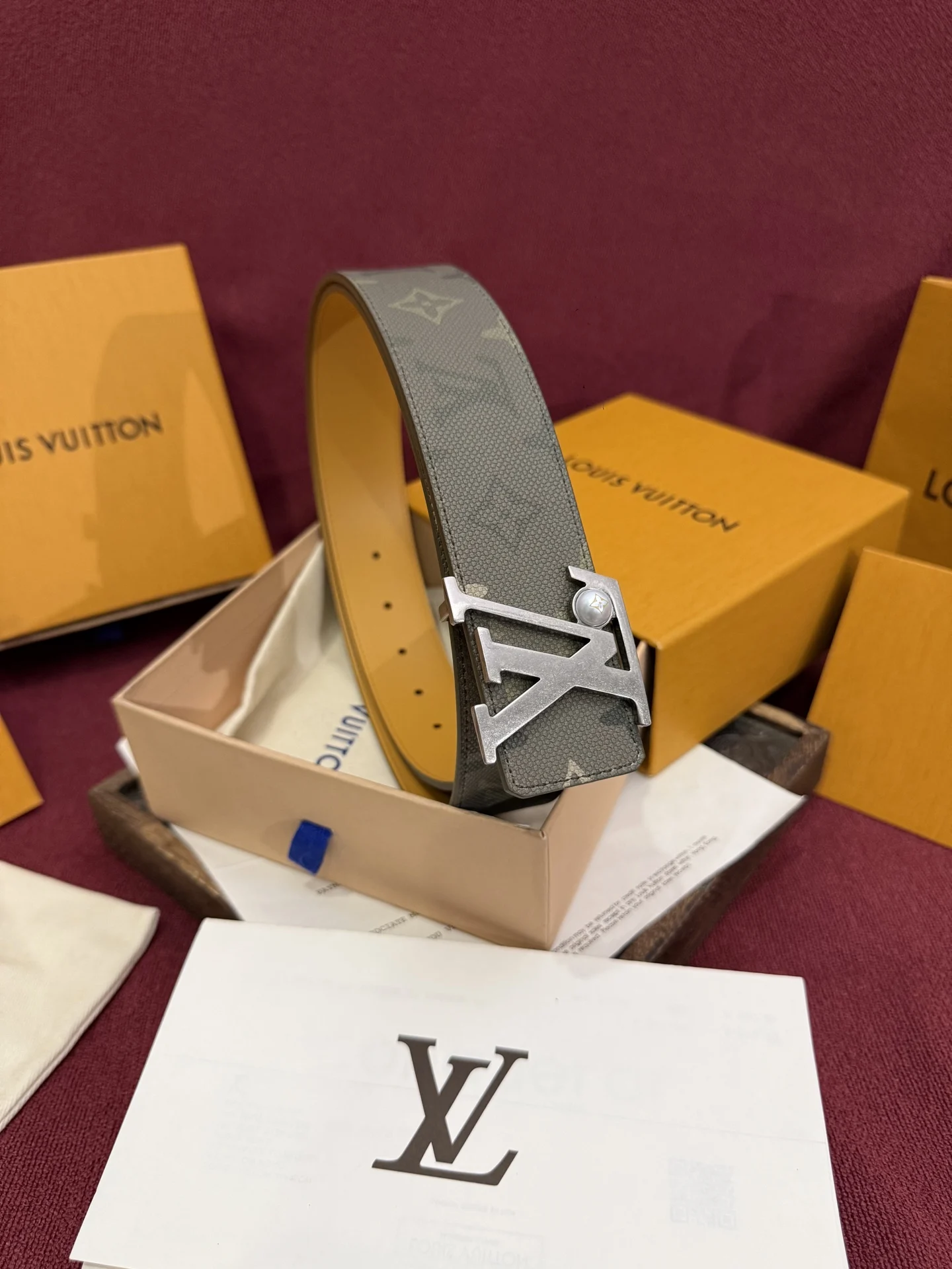The LV Initials Monogram Surplus 40mm belt is enhanced by its masculine tones, while the proportion of its width to the shiny silver buckle adds to its lightness. One side feature..