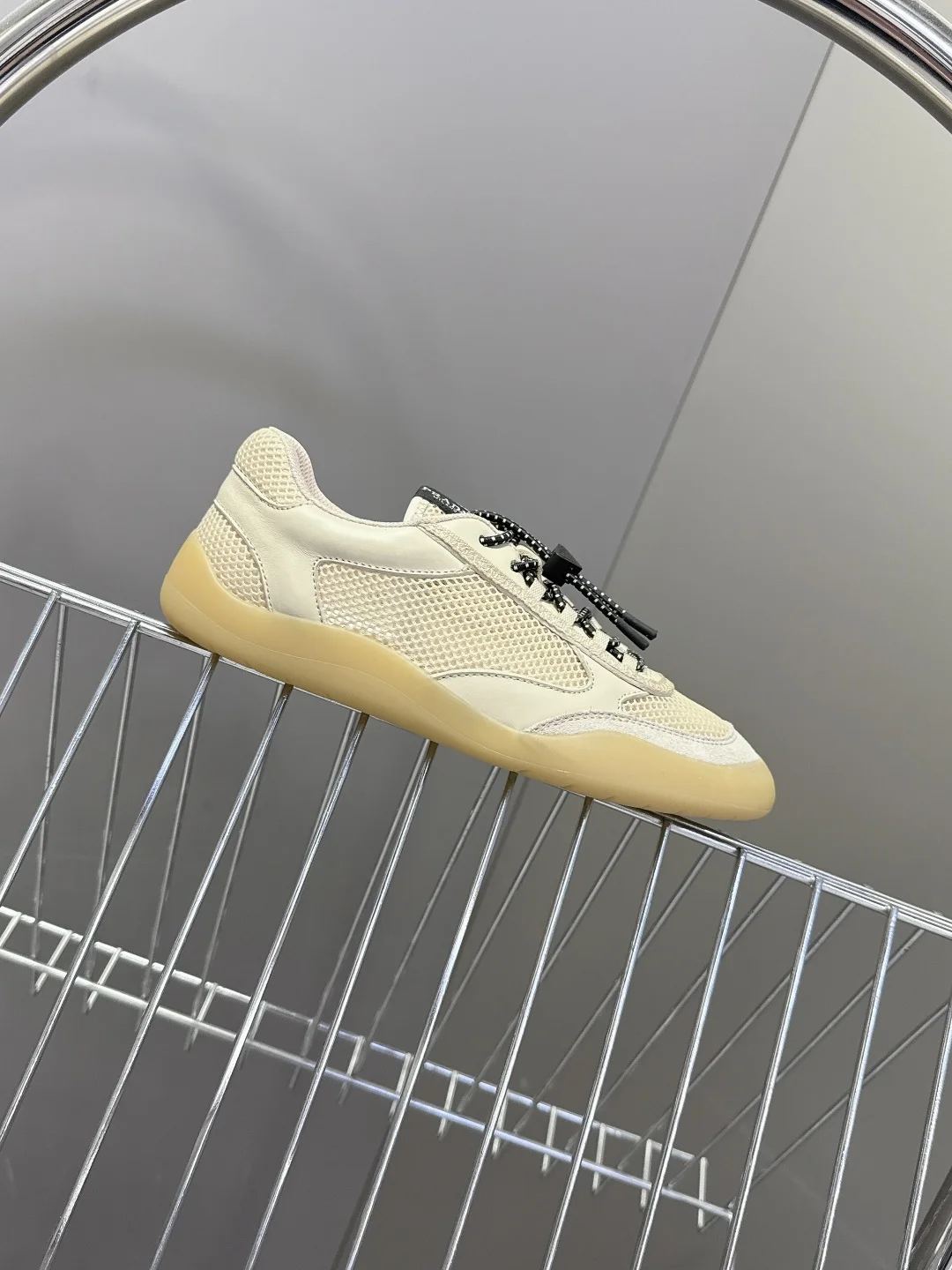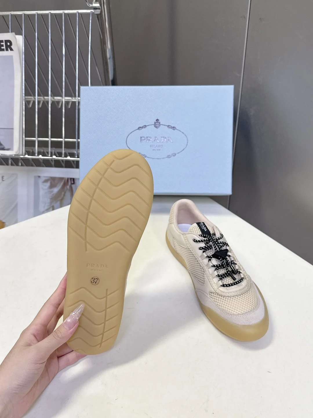 A multitude of celebrities and influencers endorse this iconic retro sports item from the brand, perfectly blending breathable design with a sense of fashion. It is a versatile luxury footwear suitable for commuting and everyday outings in spring and summer. The shoe tongue and laces are adorned with the brand s classic Prada inverted triangle metal logo, enhancing recognition while subtly showcasing brand identity. Made with high-density breathable mesh fabric combined with suede and leather, it ensures breathability and comfort for summer wear, while also flattering the foot shape. Original mold rubber outsole sizes: Women s 35-40, Men s 39-44.