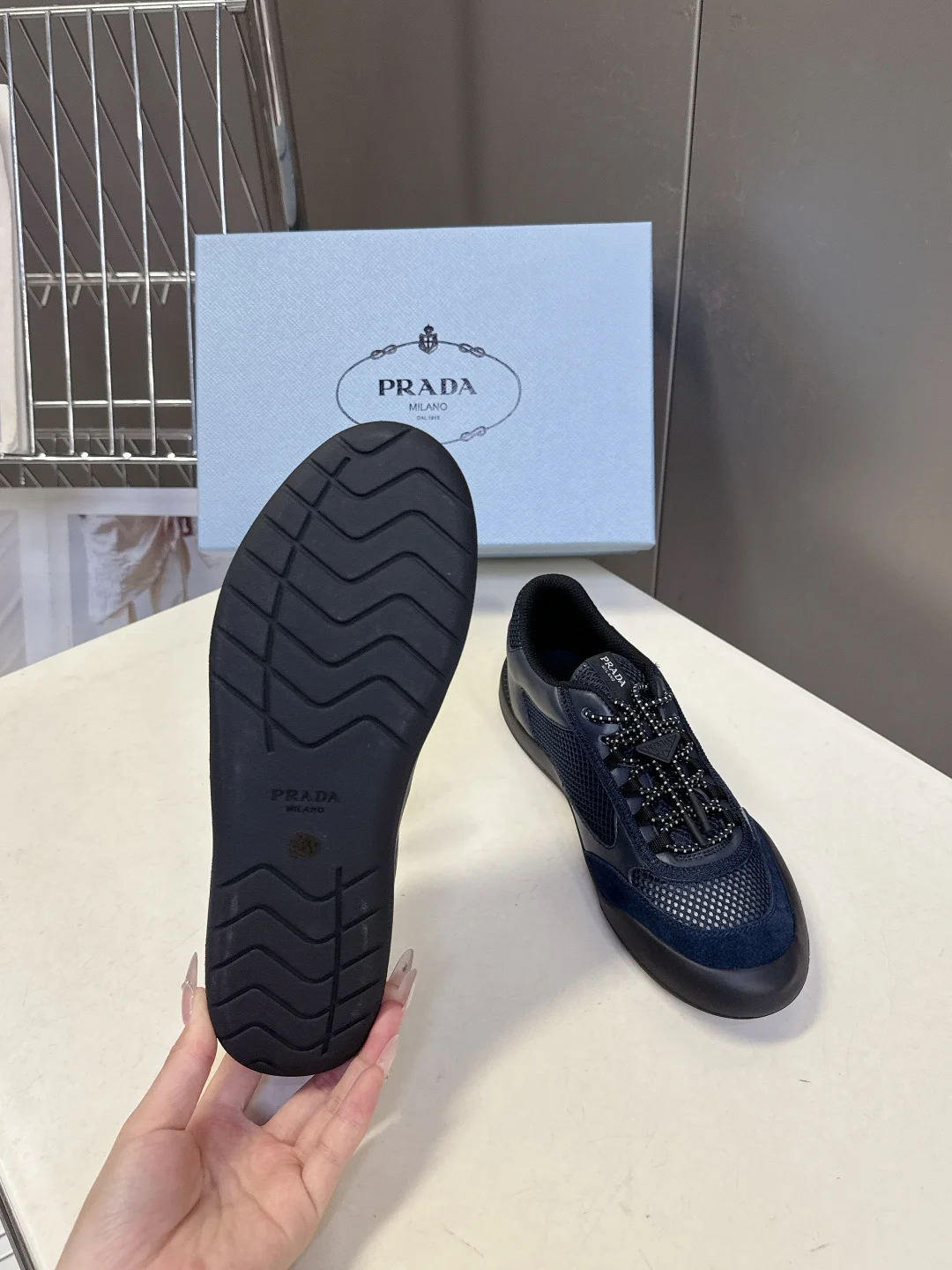 Highly recommended by numerous celebrities and influencers, this is a signature retro sports item of the brand that perfectly combines breathable design with a sense of fashion. It is a versatile luxury footwear suitable for commuting and daily outings in spring and summer. The shoe tongue and laces are adorned with the brand s classic Prada inverted triangle metal logo, enhancing recognition while subtly showcasing brand identity. Made with high-density breathable mesh fabric and complemented by suede/cowhide patches, it ensures breathability and comfort for summer wear, while also flattering the foot shape. Original mold rubber outsole sizes: Women s 35-40, Men s 39-44.