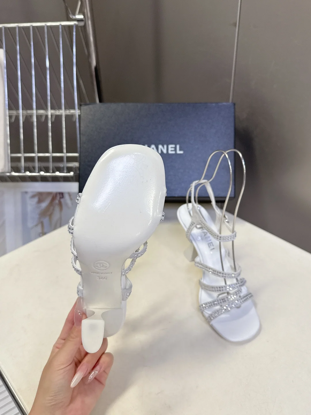 Highly recommended by numerous celebrities and influencers, this is a signature evening party shoe of the brand s French elegance style. It perfectly combines a dazzling design with comfortable wear, making it an essential item for important occasions. The insole is clearly embossed with the CHANEL brand name, and the straps incorporate the brand s classic double C logo, enhancing its recognizability. Multiple parallel straps are adorned with sparkling rhinestones, creating a luxurious atmosphere. Once worn, it instantly brightens the look, making it a show-stopping accessory for parties and evening events. The kitten heel design features an 8CM curved slender heel, which not only elongates the leg line but is also more stable than ultra-high heels, ensuring comfort during prolonged wear. Made with genuine Italian leather outsole. Size: 35-41 (no returns or exchanges for sizes 40 and 41).