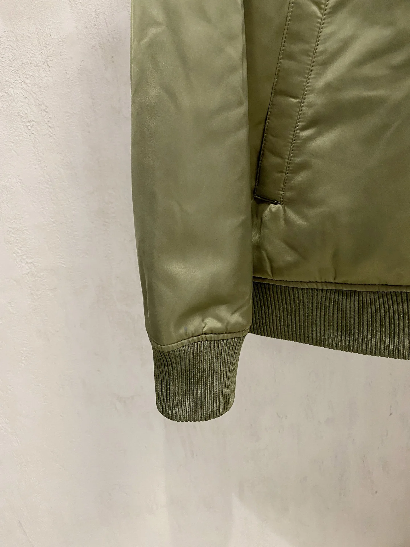 The collar, cuffs, and hem are stitched with black tightly woven ribbing, enhancing the visual layering and exuding a strong vintage collegiate vibe, allowing you to effortlessly showcase a vibrant and fashionable look!