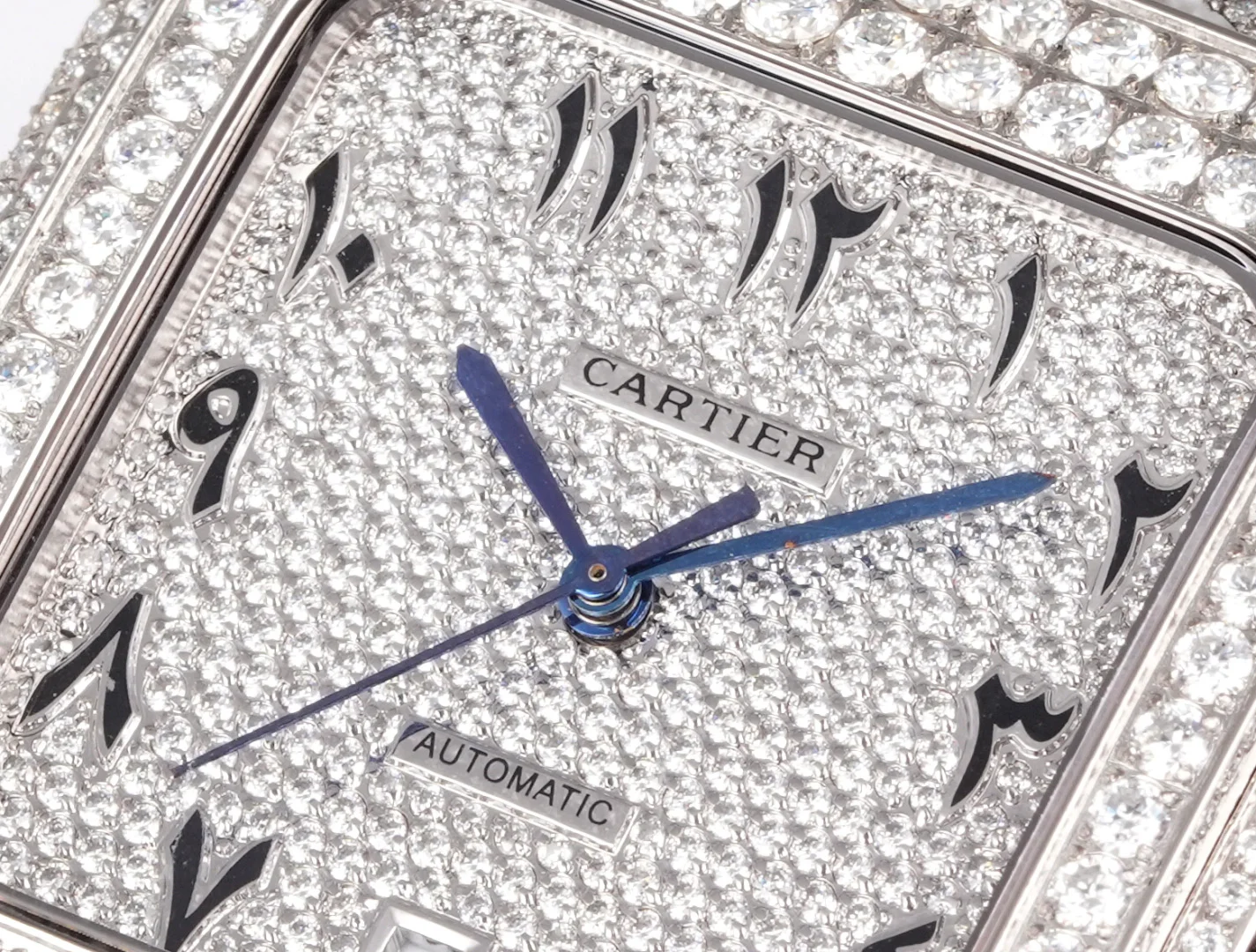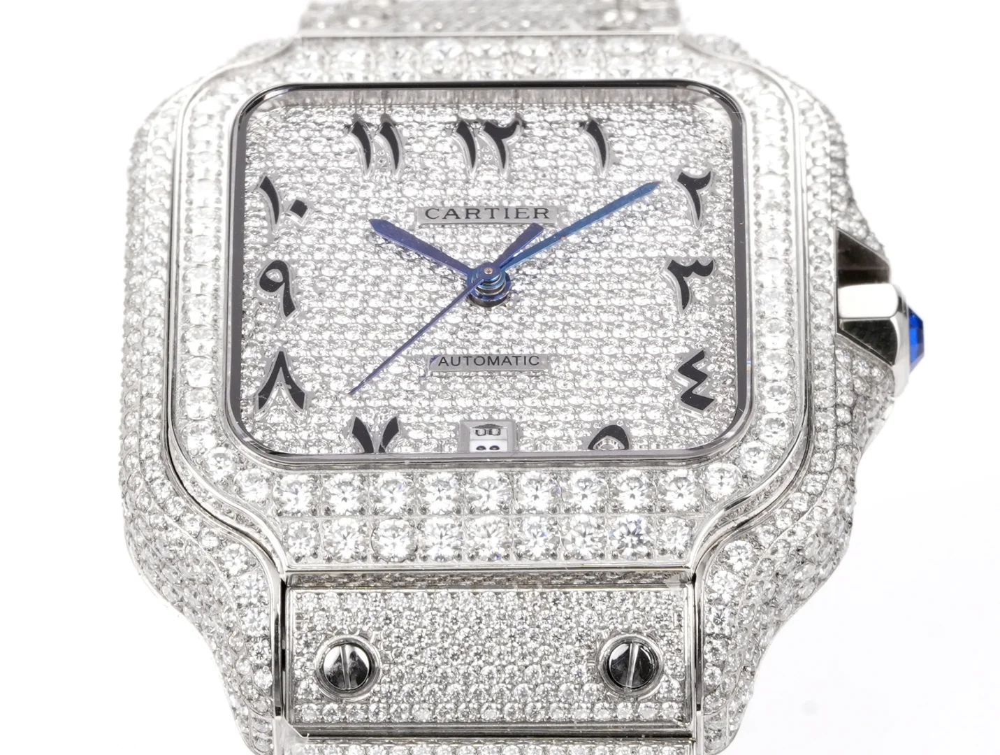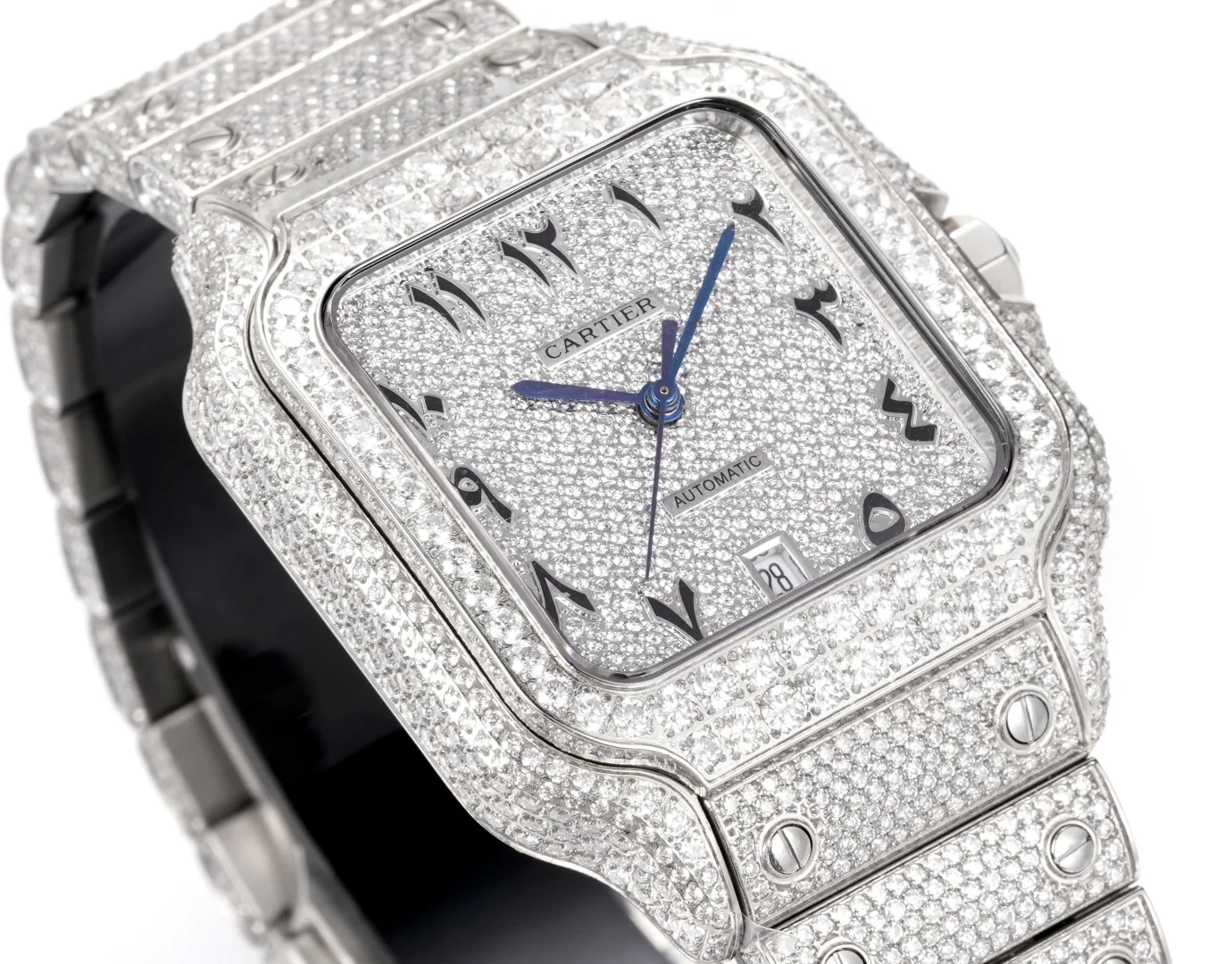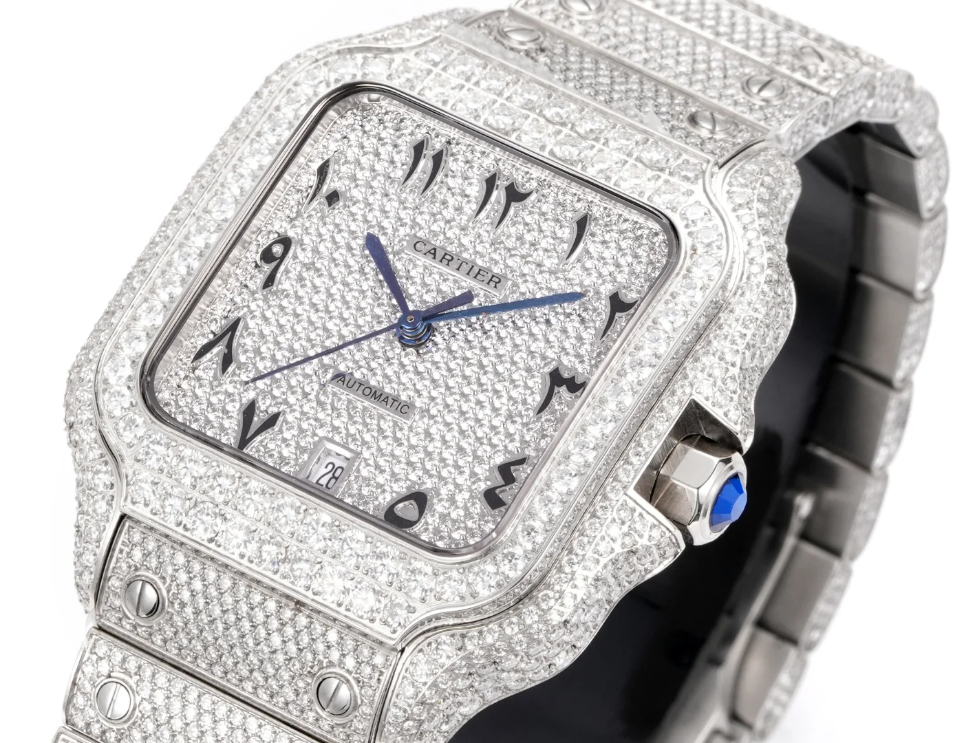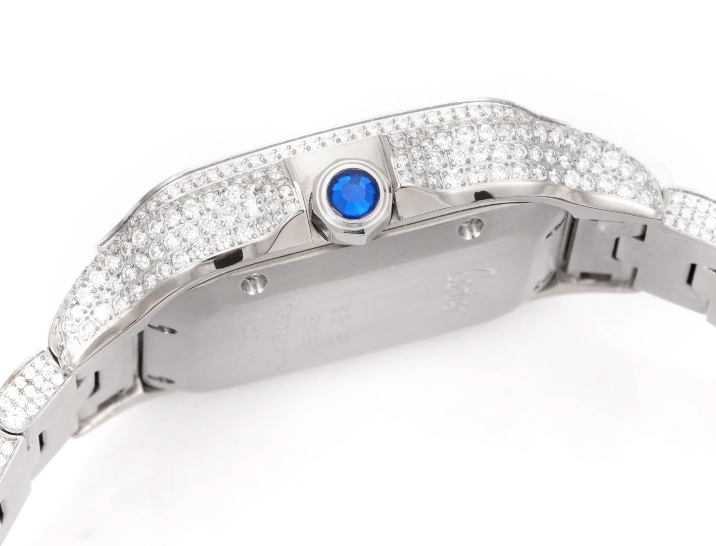 Extremely luxurious! Very limited stock! The Starry Sky Cartier Santos Starry Sky Moissanite version features a fully handcrafted watch set with D color VVS grade Moissanite diamonds, all stones can be tested with a professional testing pen. Moissanite diamonds have a refractive index of 2.65-2.69 (diamond 2.42), exhibiting the same brilliance as diamonds.