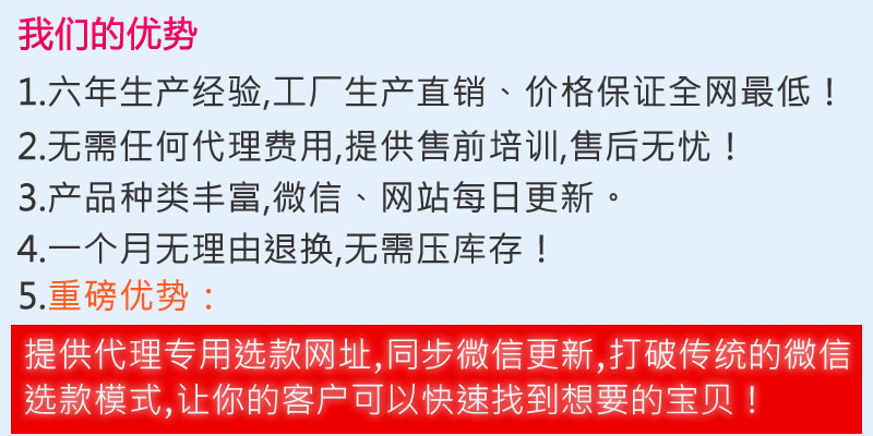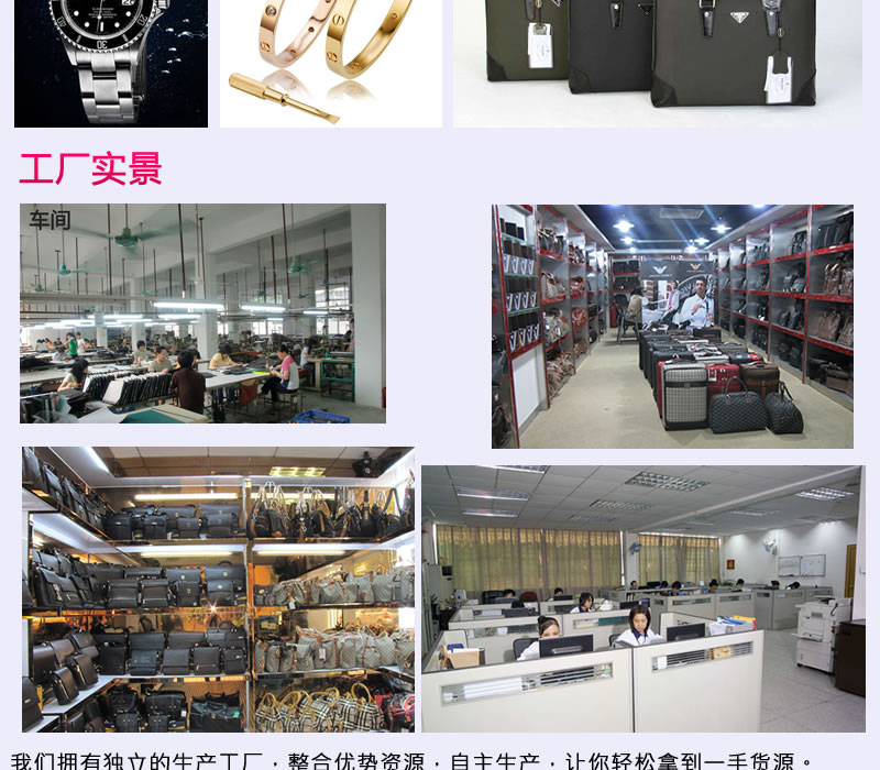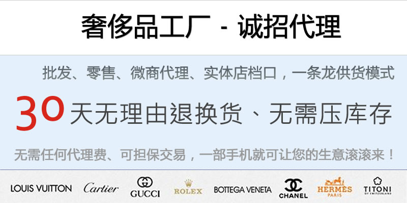 奢侈品工厂 - 诚招代理 批发、零售、微商代理、实体店档口,一条龙供货模式 30天无理由退换货、无需压库存 无需任何代理费、可担保交易,一部手机就可让您的生意滚滚来! 我们的优势 1.六年生产经验,工厂生产直销、价格保证全网最低! 2.无需任何代理费用,提供售前培训,售后无忧! 3.产品种类丰富,微信、网站每日更新。4.一个月无理由退换,无需压库存!5.重磅优势:提供代理专用选款网址,同步微信更新,打破传统的微信
