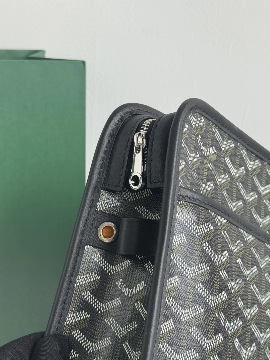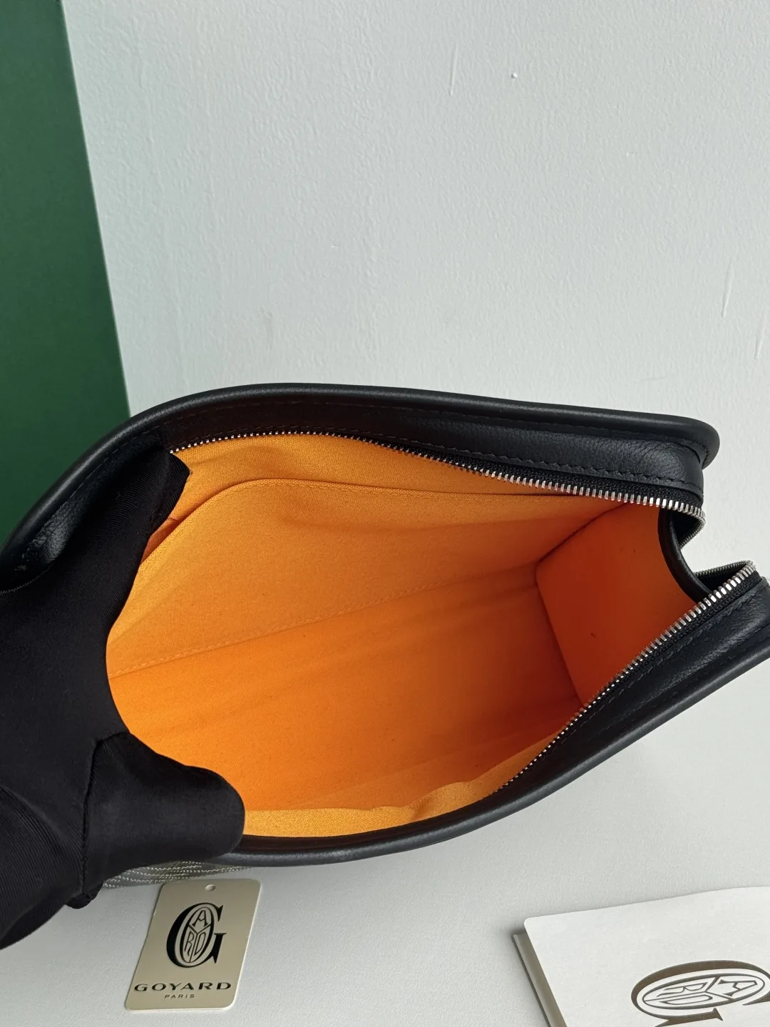 Goyard Jouvence Toiletry Pouch: A classic of Goyard s Art of Living and Travel. Handcrafted in calfskin with a yellow lining, it features a simple, lightweight design with one interior and one exterior compartment. Durable and with a clean interior, its elegant and stylish appearance makes it an indispensable functional item for travel. The large toiletry pouch is perfect for storing large-capacity items. The small toiletry pouch is ideal for carrying essentials for quick touch-ups on the go, and can also be used as a small bag or clutch, representing Goyard s practicality and urban style. Size: 25x18 7cm. Reference: 020802
