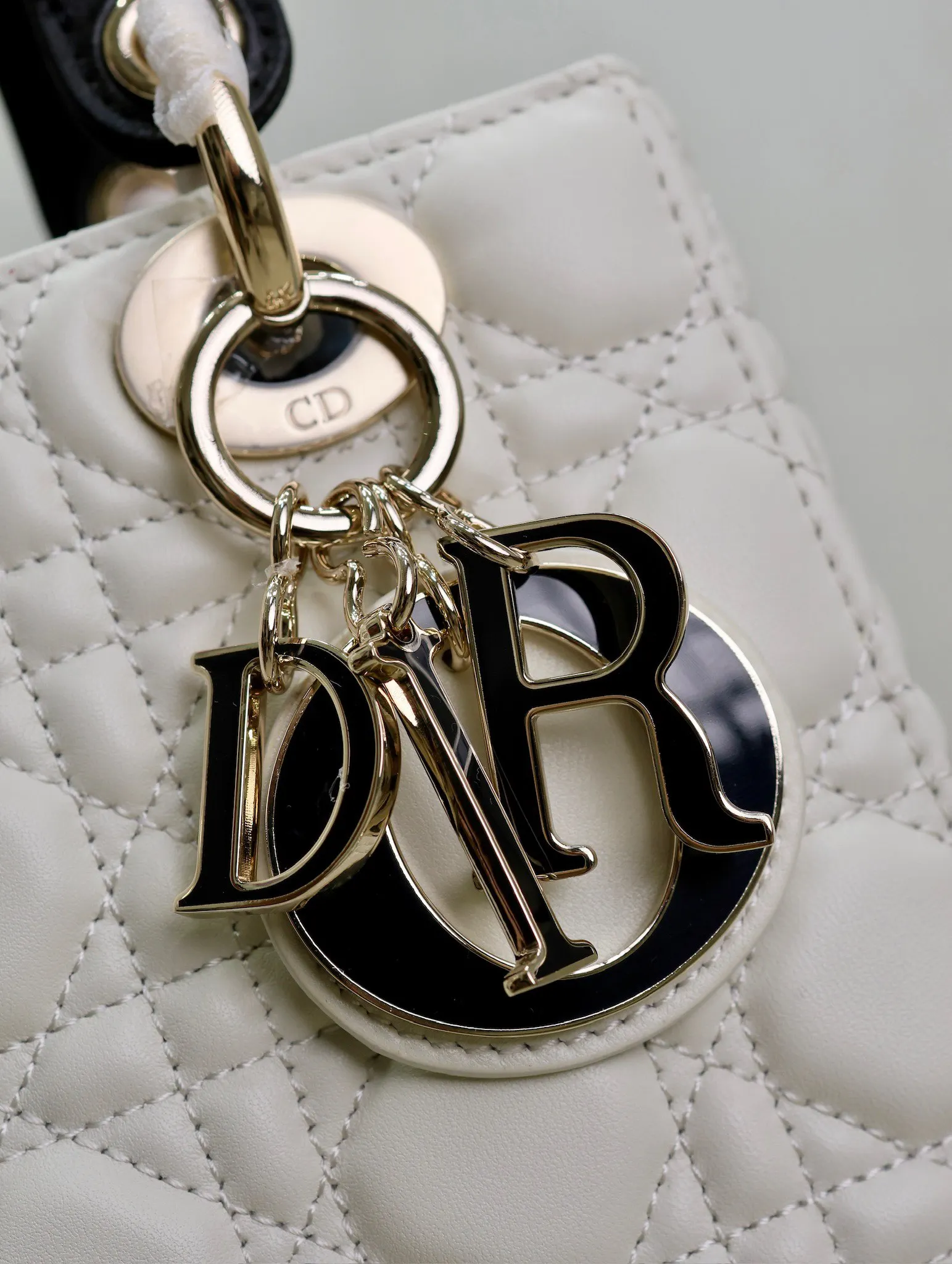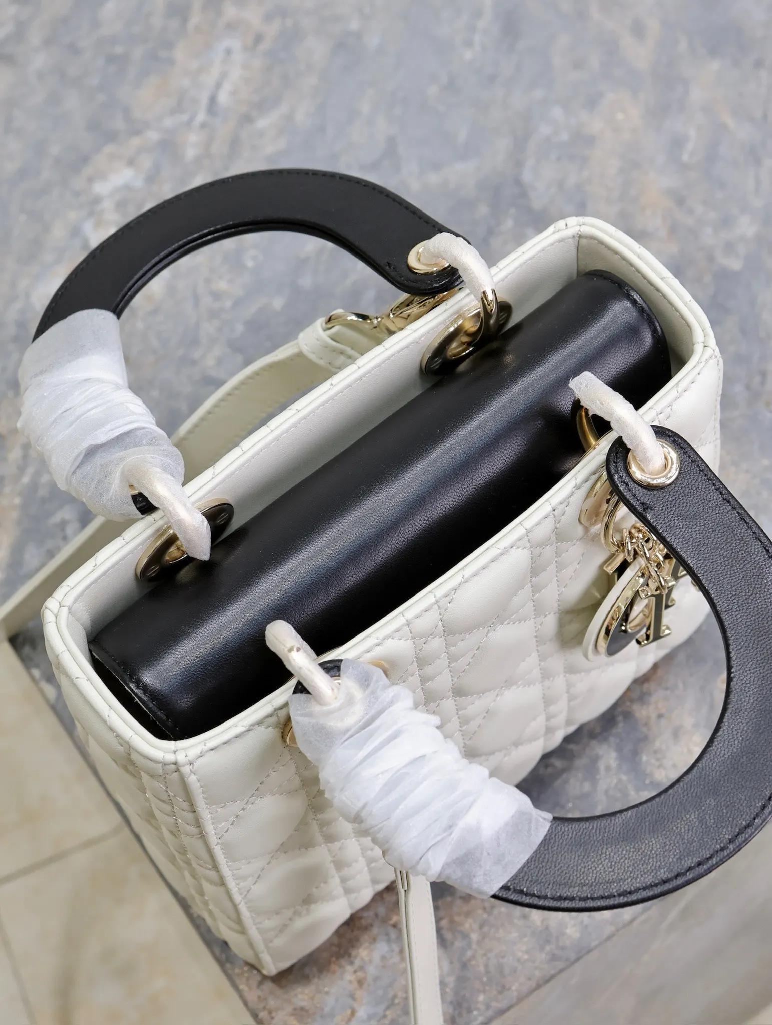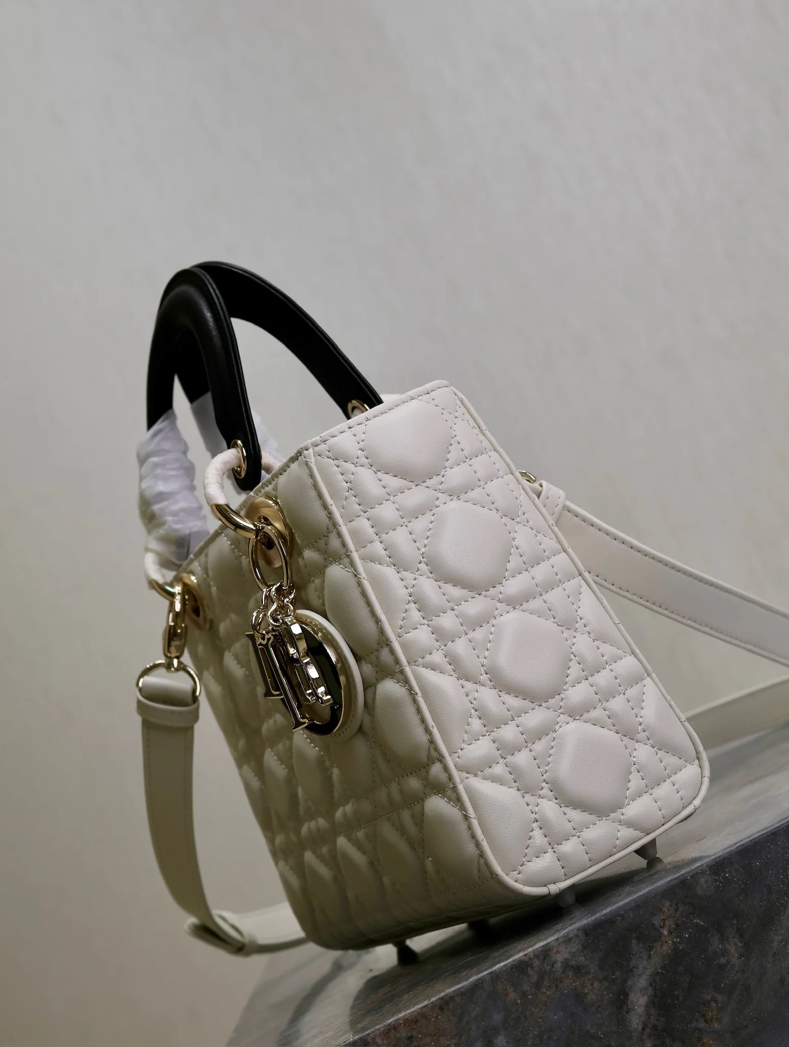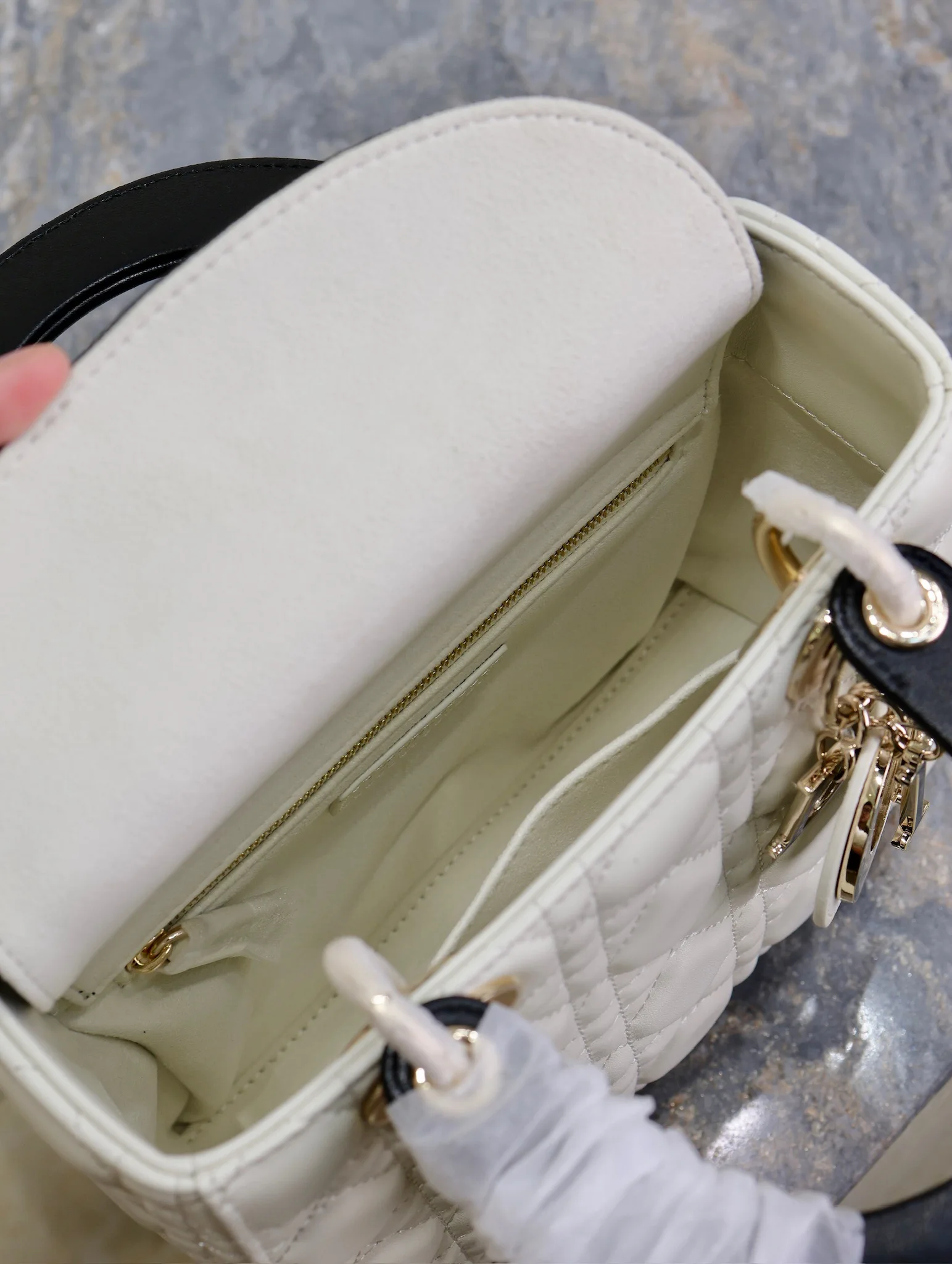 [Lady Dio.r] White and Black / Four-Grid Lambskin Adjustable Shoulder Strap /