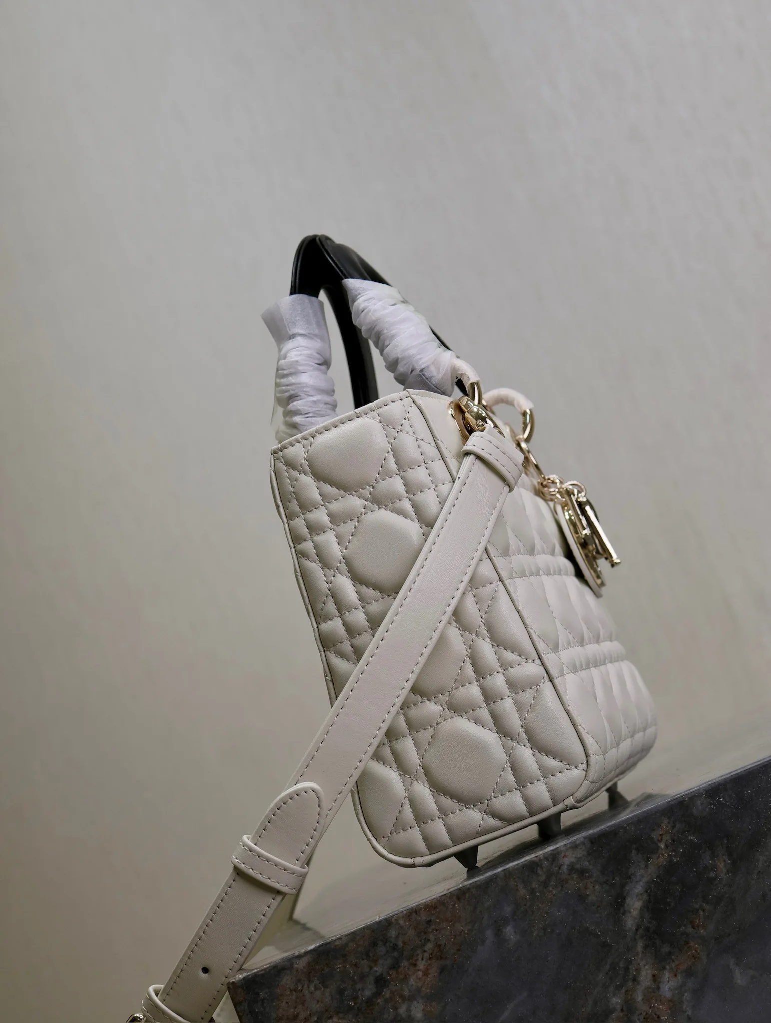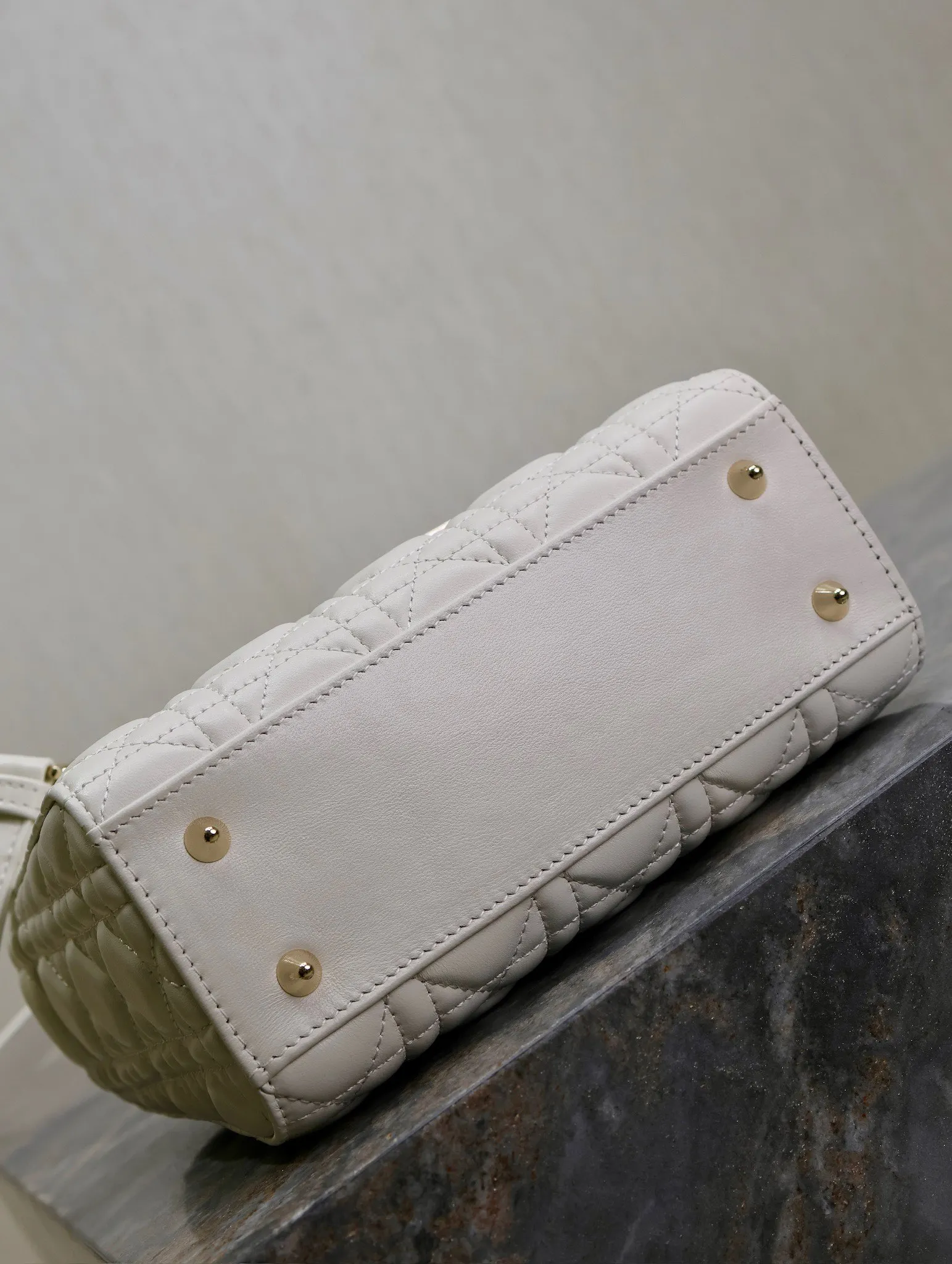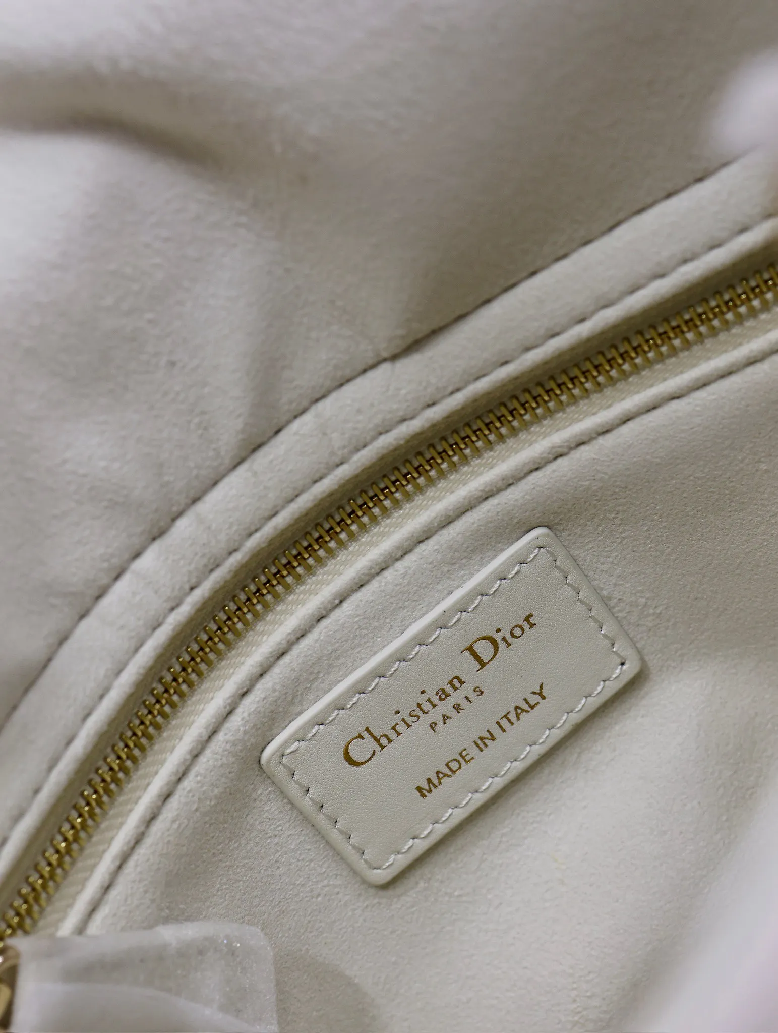 This handbag embodies Dior s profound insight into elegance and beauty. Crafted from fine lambskin leather, it features iconic cannage stitching details, and its elegant classic design stands the test of time. Adorned with a light gold Dior hardware pendant, it is lined with suede, equipped with an adjustable shoulder strap, and includes an internal zip pocket, allowing for handheld, shoulder, or crossbody wear.
