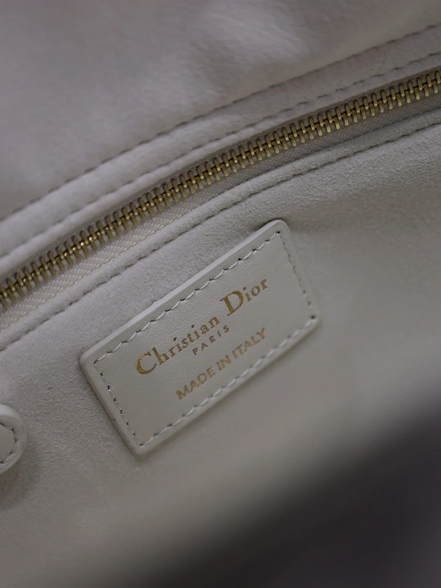 This handbag embodies Dior s profound insight into elegance and beauty. Crafted from fine lambskin leather, it features quilted details created with the iconic caning stitch, showcasing a timeless and classic design. Adorned with a light gold Dior hardware charm, it includes a suede-lined interior, an adjustable shoulder strap, and an internal zip pocket, allowing for handheld, shoulder, or crossbody wear.